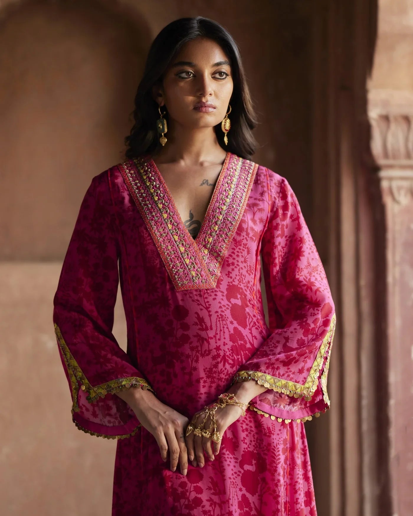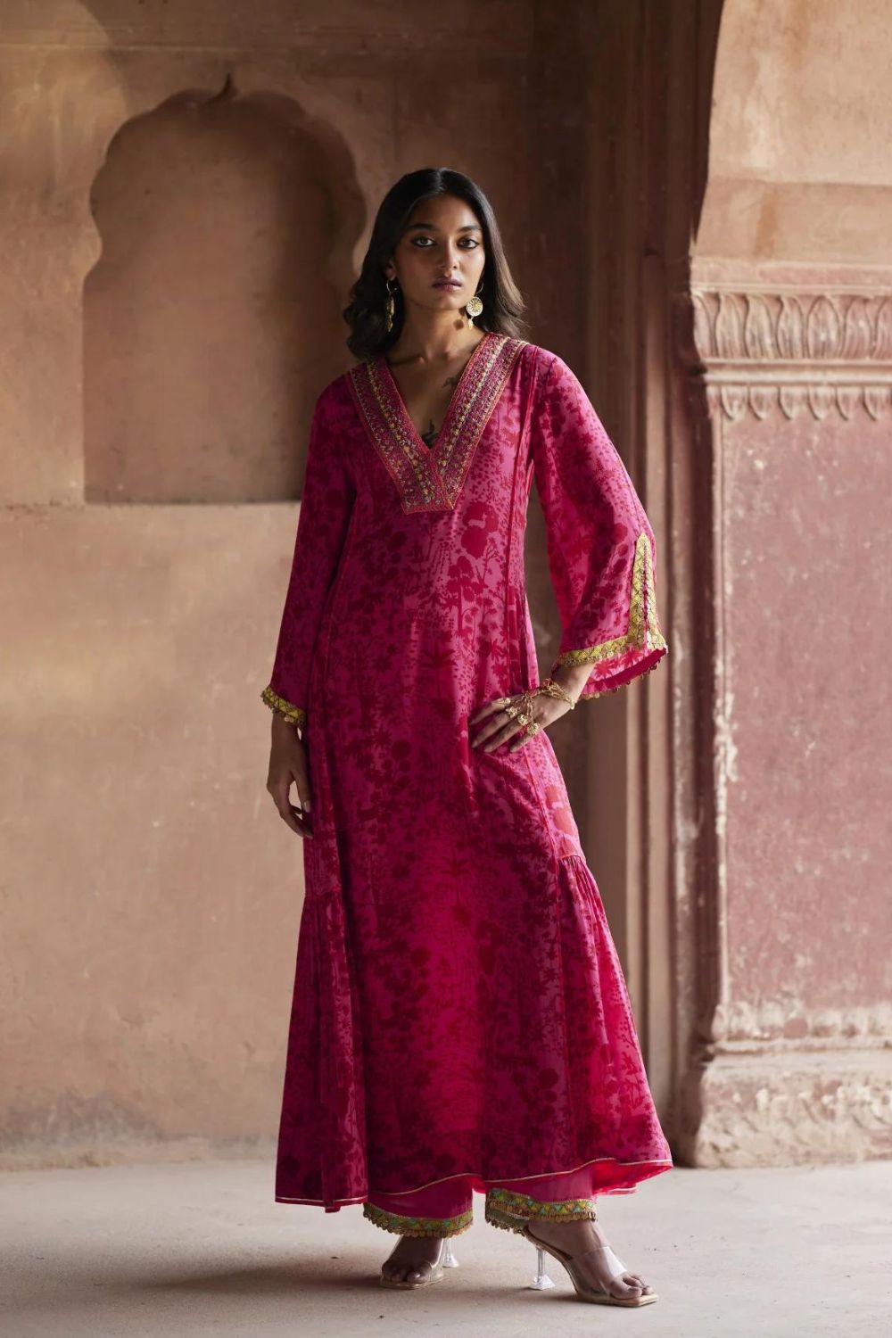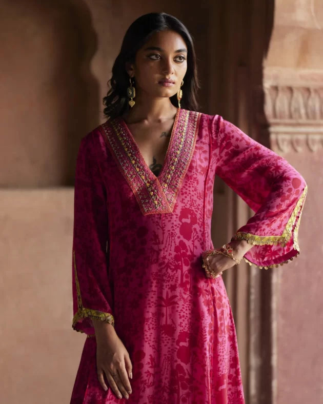 An effortless attire with the modernistic flair. The alluring hot pink-red shadow printed crepe kurta with hand embroidered neck and sleeves .Paired with hot pink hand embroidered pallazo.