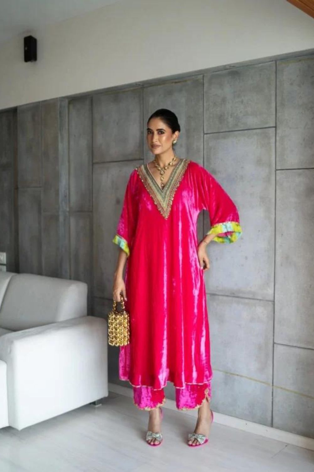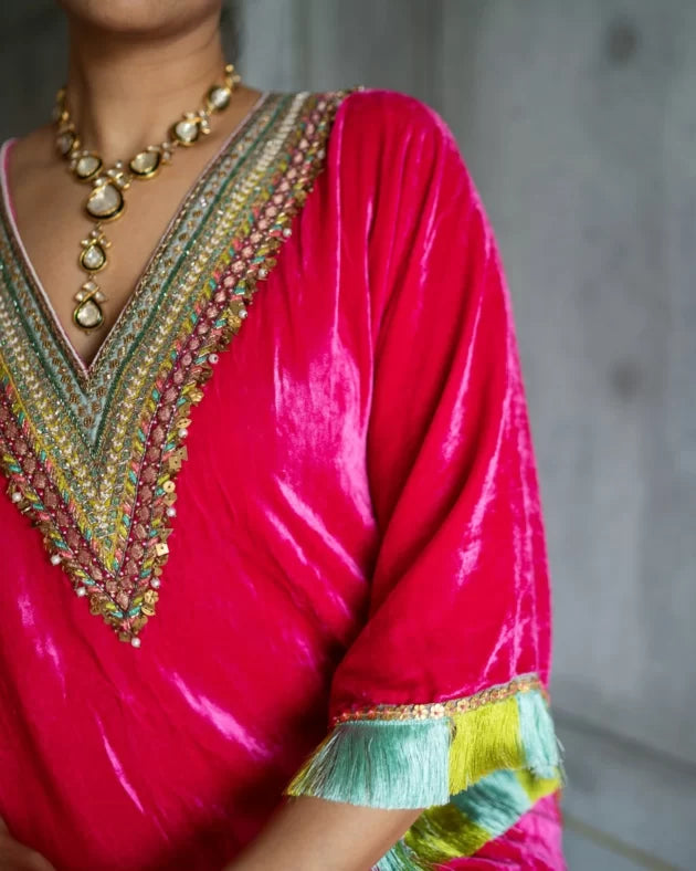 A Contemporary yet Classic Hot Pink Kaftaan Kurta set which has Jewelled Hand Embroidery on the Neck and emdroidered fringe detailing on Sleeve. It is paired with a Hot Pink Velvet Hand Embroidered Palazzo.