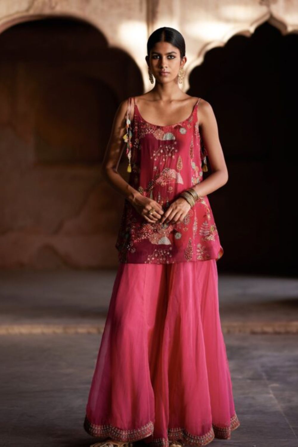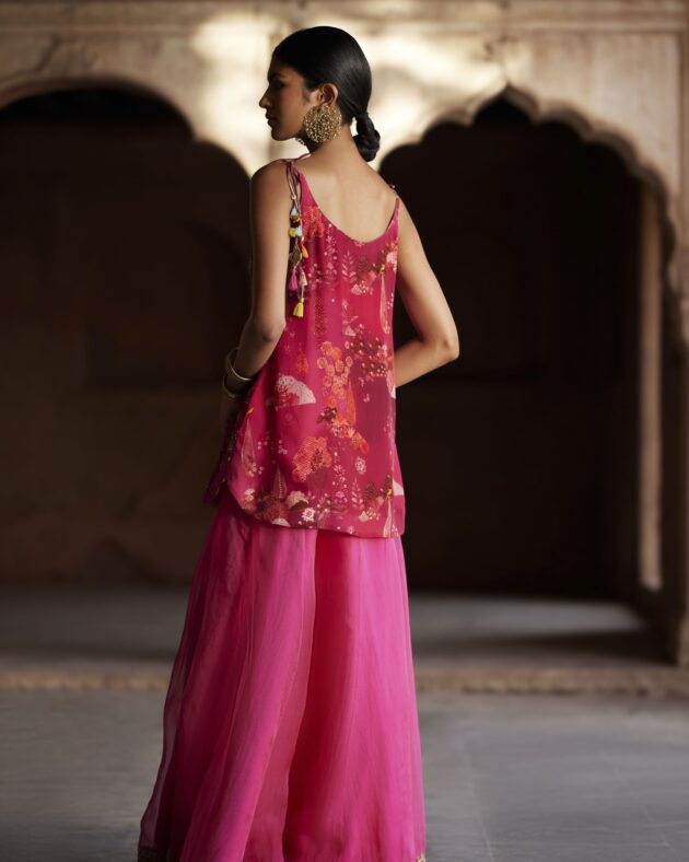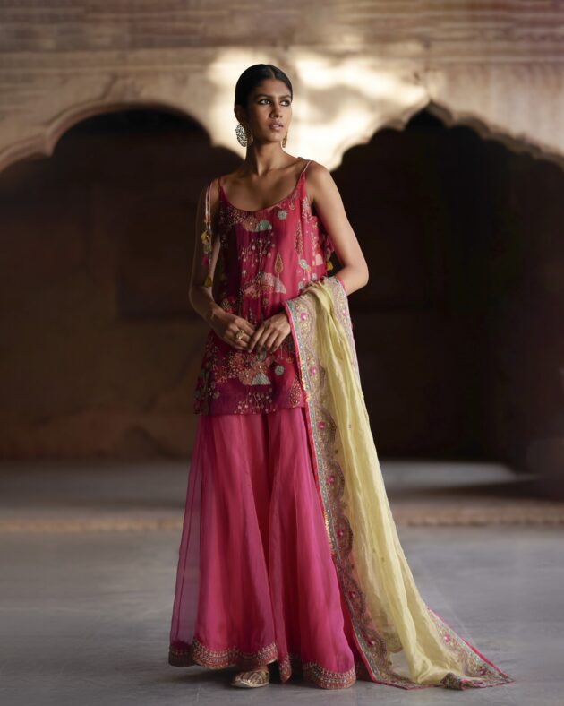 A Perfect ensemble for all occasions .The beautiful Nature Inspired print is the breath of fresh air in the gleaming Sunshine. Magenta shaded hand embroidered crepe short kurti with all over Pitta, Dabka and Resham work . It is paired with delicate magenta hand embroidered silk organza sharara scalloped at hemline and pastel green tissue organza dupatta with embroidered dori work running along the borders.