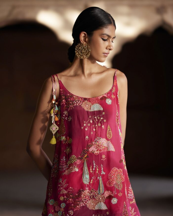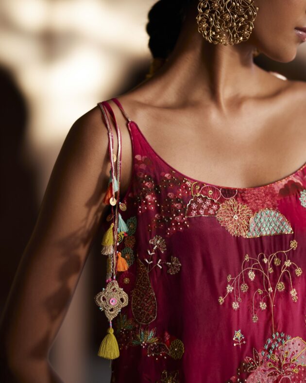 Their work is an ode to handcrafted Indian design — rooted in traditional embroidery techniques like zardozi, dabkaa, and fine threadwork, yet shaped into silhouettes that feel refreshingly contemporary. Clean cuts, relaxed forms, pure fabrics, and a distinctive palette come together to create pieces that travel seamlessly from India to Singapore and beyond.