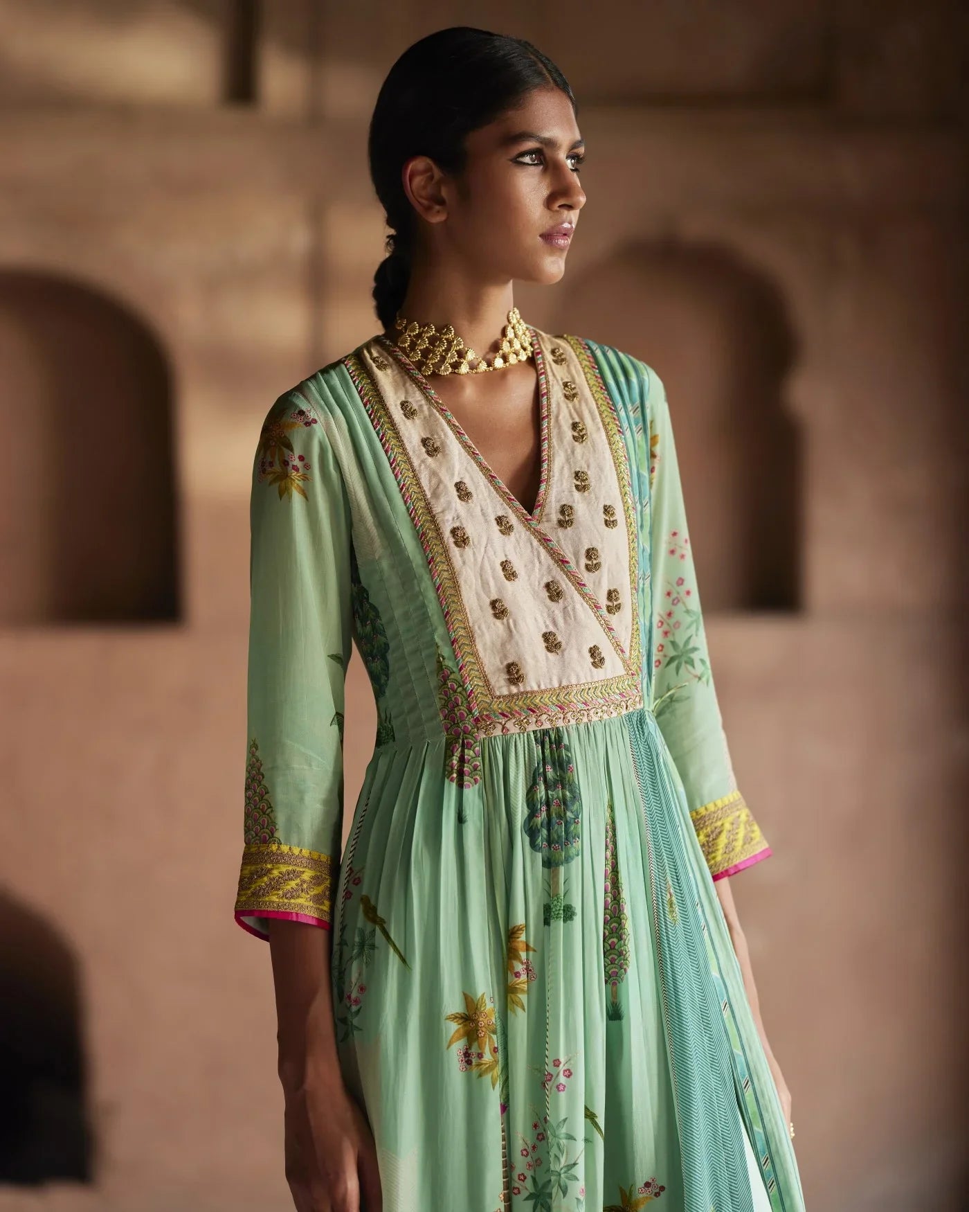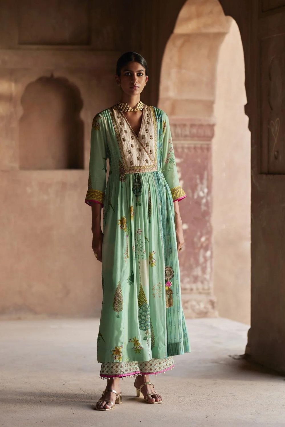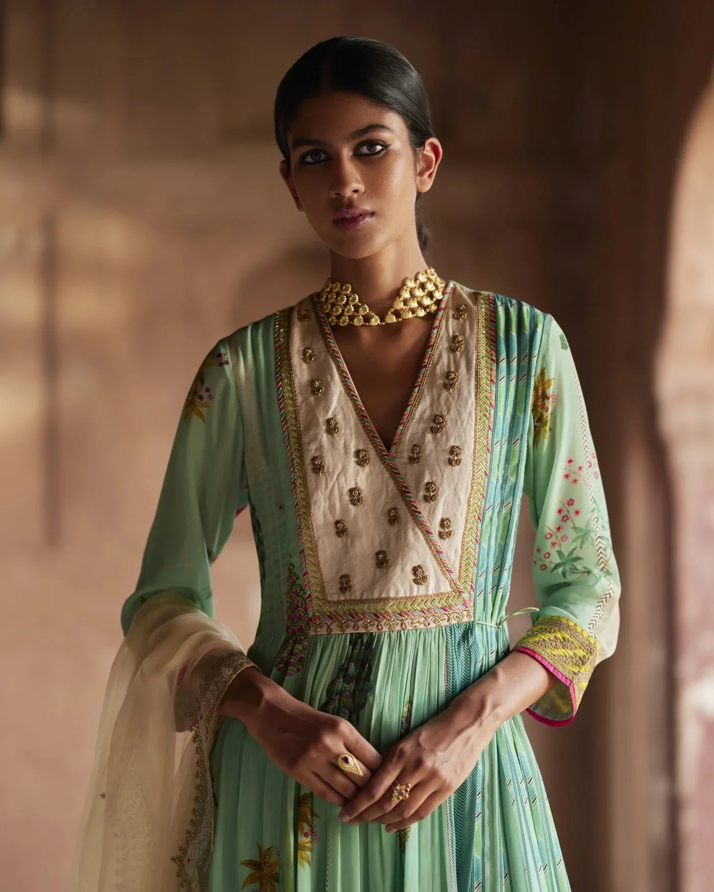 Trained at NIFT and NIFD, the sisters bring technical rigour to their craft: every garment is shaped with intention, from the drape of the fabric to the finesse of the motif. What defines RajiRamniq is this balance — expressive without excess, deeply Indian yet cosmopolitan in its sensibility.