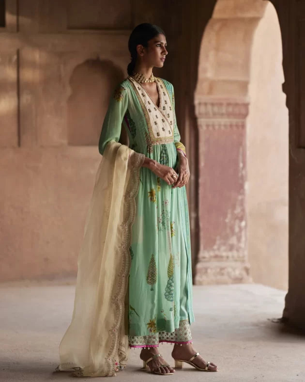 An classic attire with the modernistic flair. Powder blue printed kurta with hand embroidered yoke and sleeves. It is paired with hand embroidered powder blue modal satin palazzo and Ivory golden zari dori work scalloped organza dupatta.