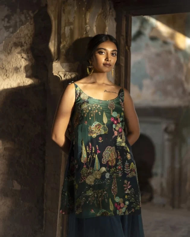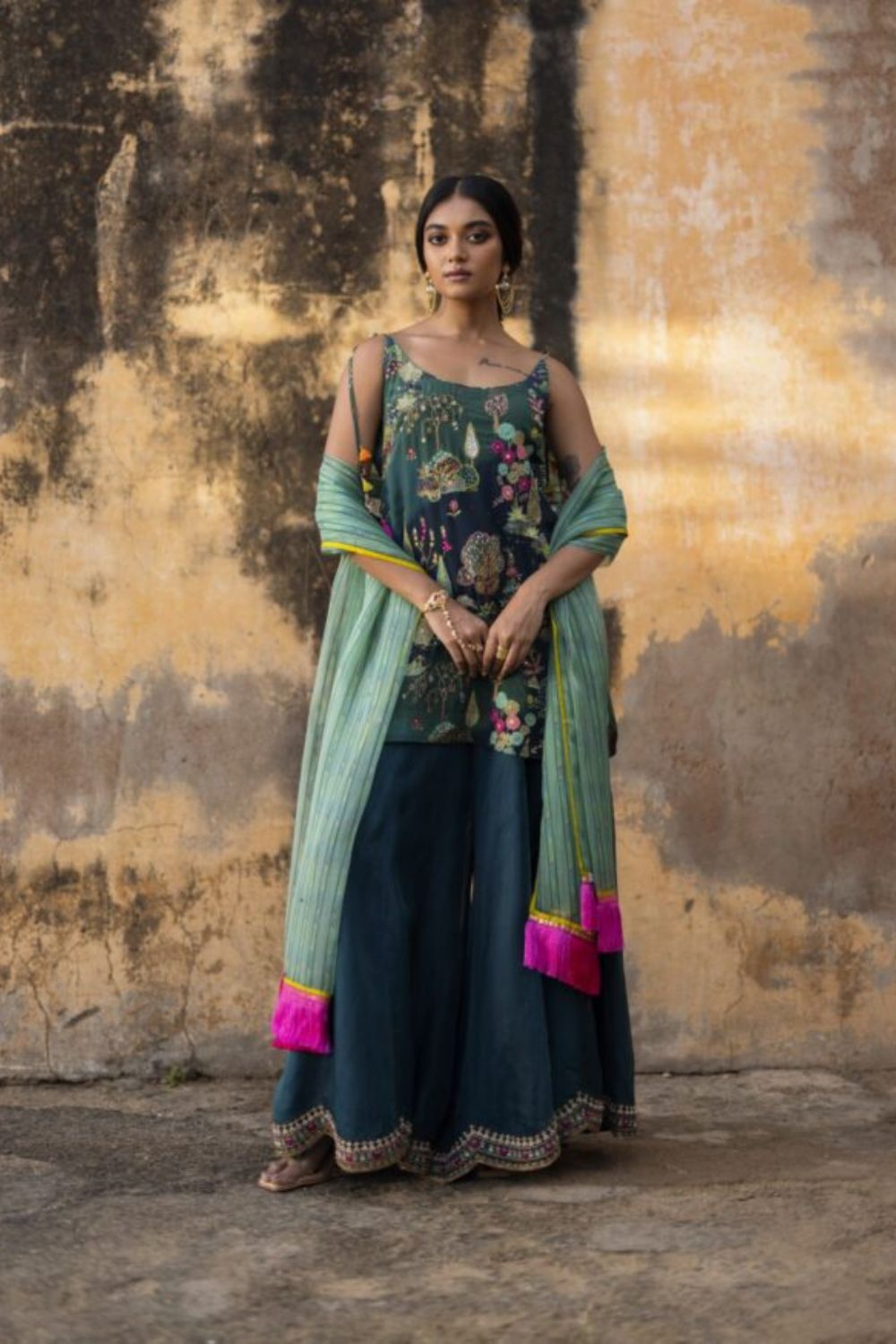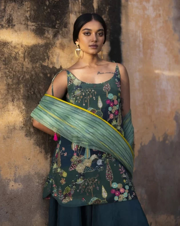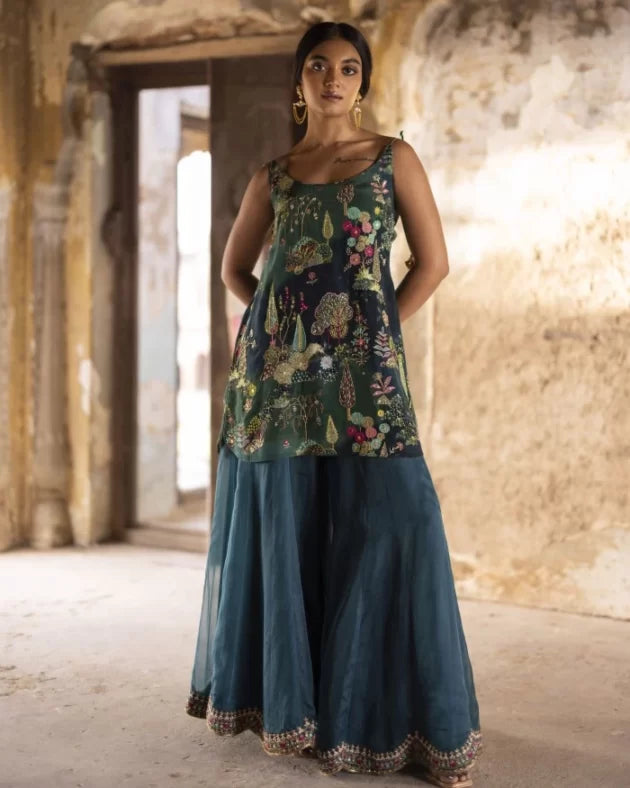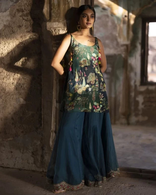 A Perfect ensemble for all occasions. The beautiful Nature Inspired print is the breath of fresh air in the gleaming Sunshine. Teal shaded hand embroidered crepe short kurti with all over Pitta, Dabka and Resham work. It is paired with delicate teal hand embroidered silk organza sharara scalloped at hemline and printed powder blue organza dupatta with fringe detailing.