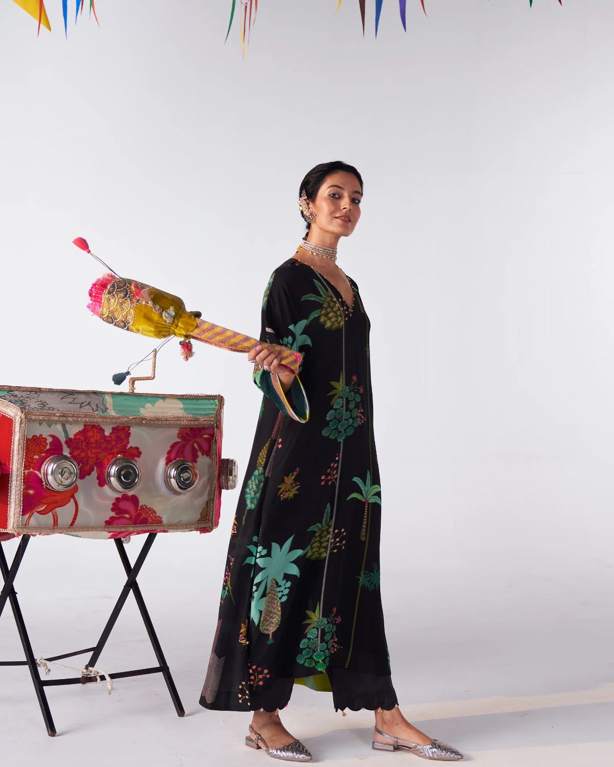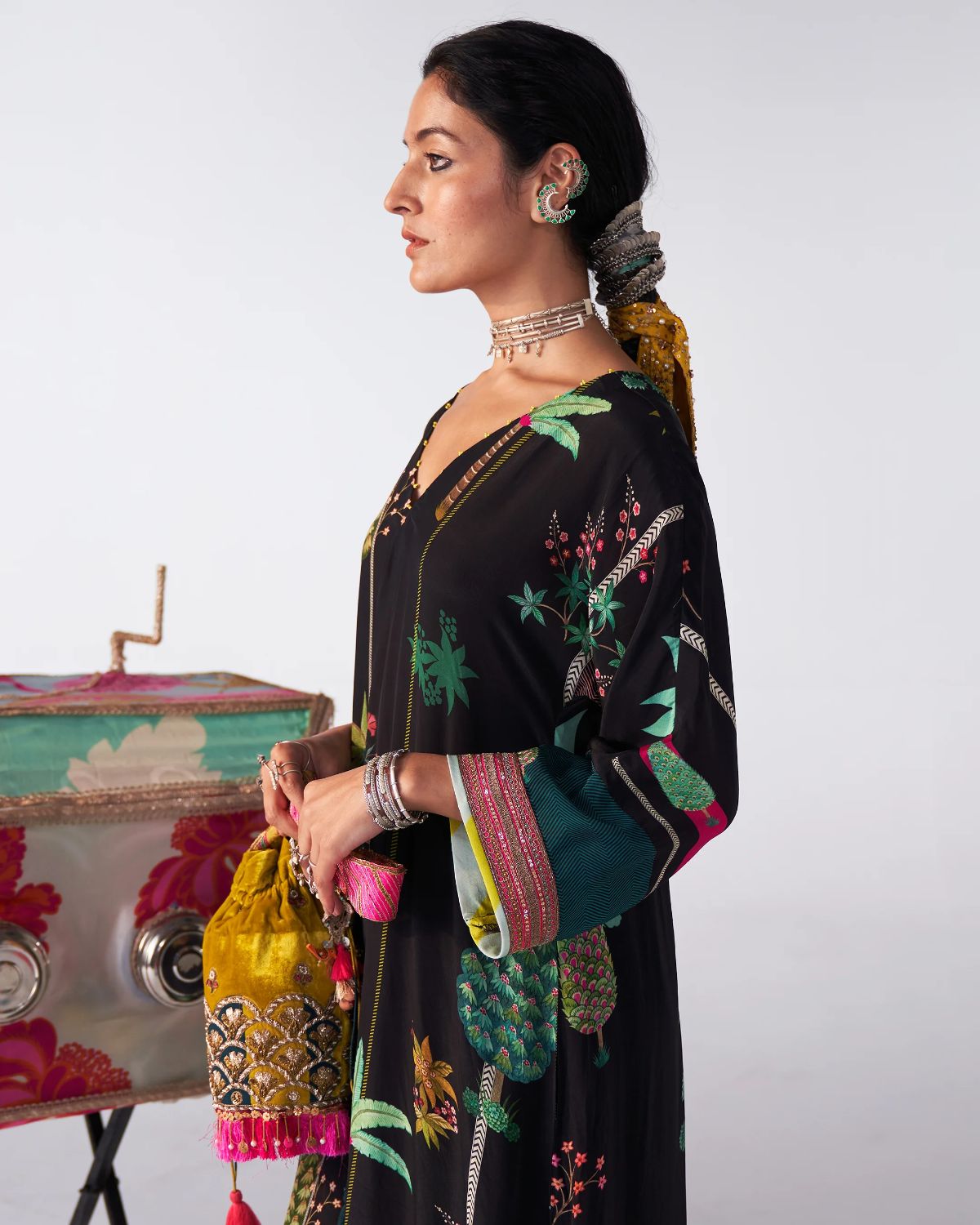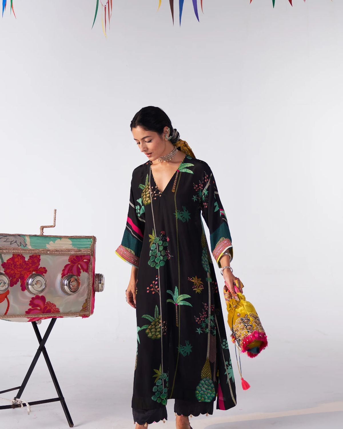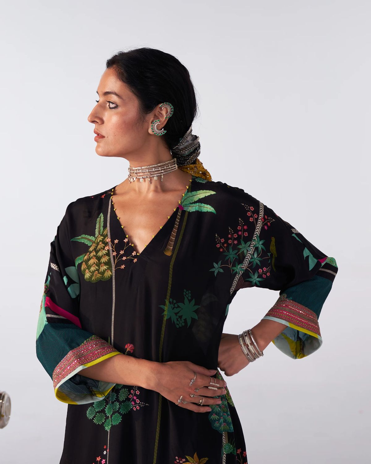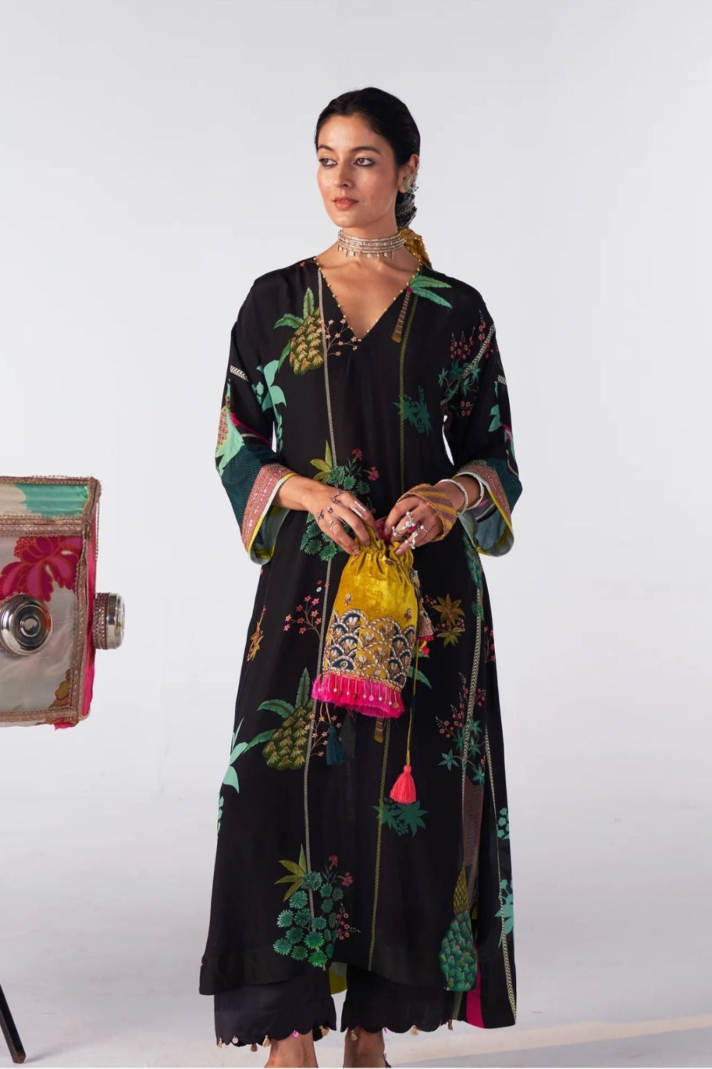 A nature-inspired print graces this black kaftan kurta, offering a serene yet striking aesthetic. The subtle design seamlessly flows into the matching scallop pants, making it a perfect choice for effortless comfort without compromising on style. Ideal for a relaxed yet chic look, this set is versatile and timeless.