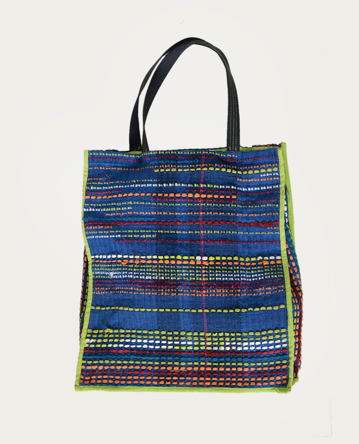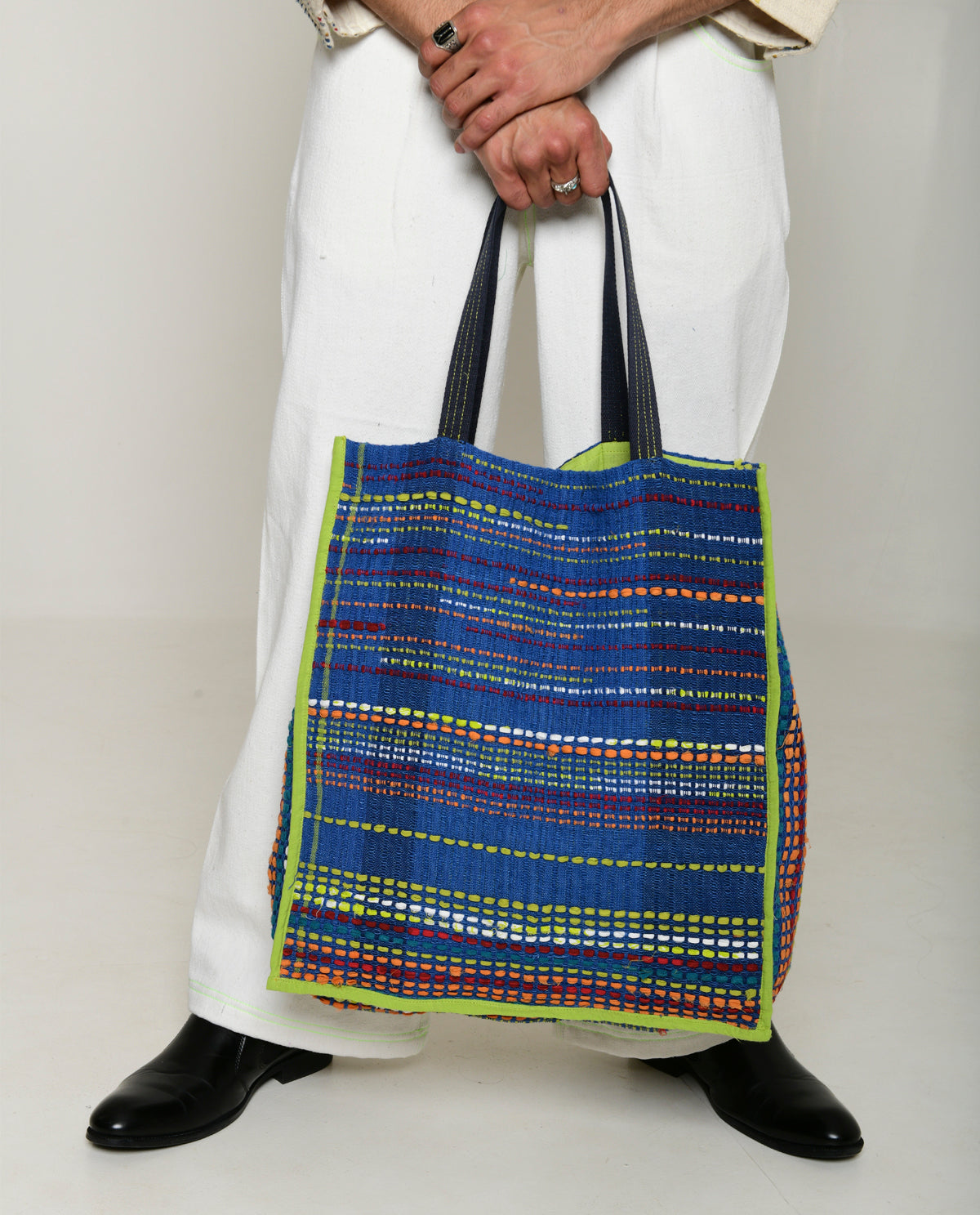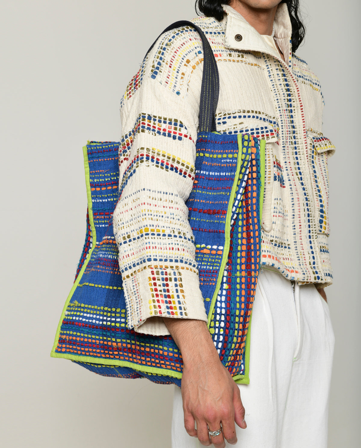 Handwoven unisex totes are skillfully crafted using our recycled fabric with the extra weft technique on frame looms. Each jacket is made from Rias Jaipur's own manufacturing waste collected over the past year, undergoing meticulous re-weaving and re-imagining for a fresh and unique appearance. This sustainable and eco-friendly fashion choice is created entirely from 100% cotton. Please note that the jacket is not eligible for returns, but it can be customized to your preferred fit and length, ensuring a personalized and stylish addition to your wardrobe.