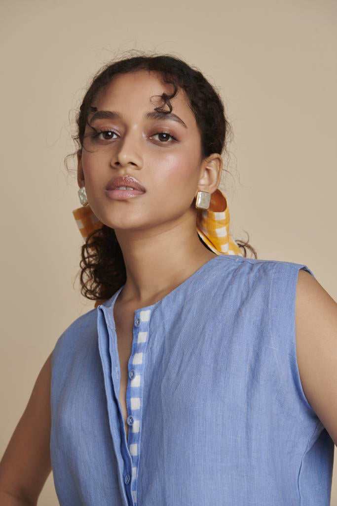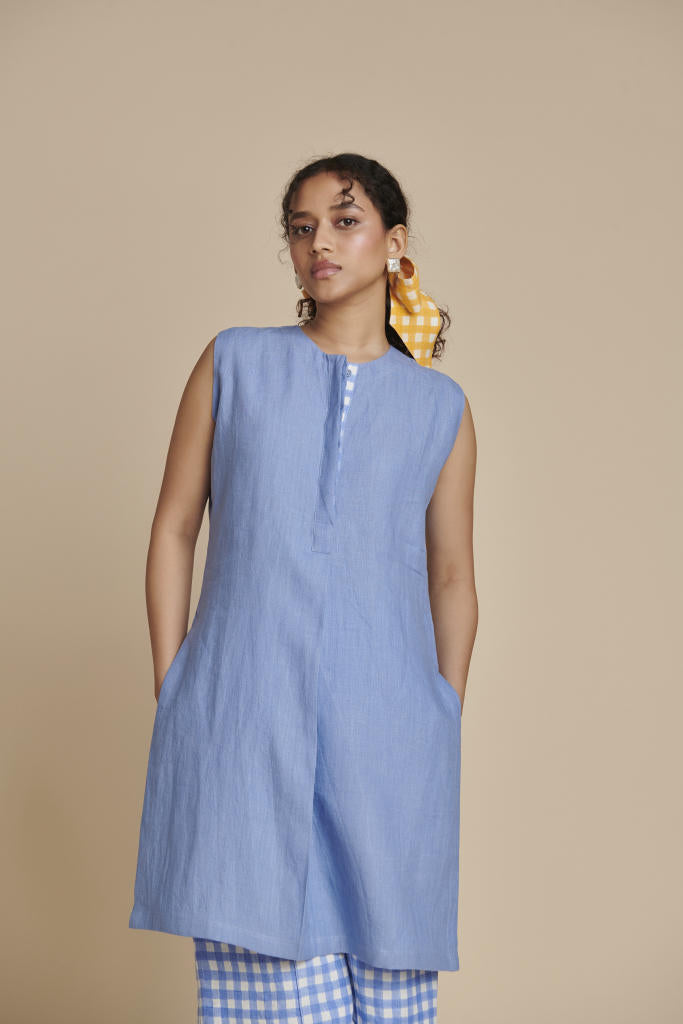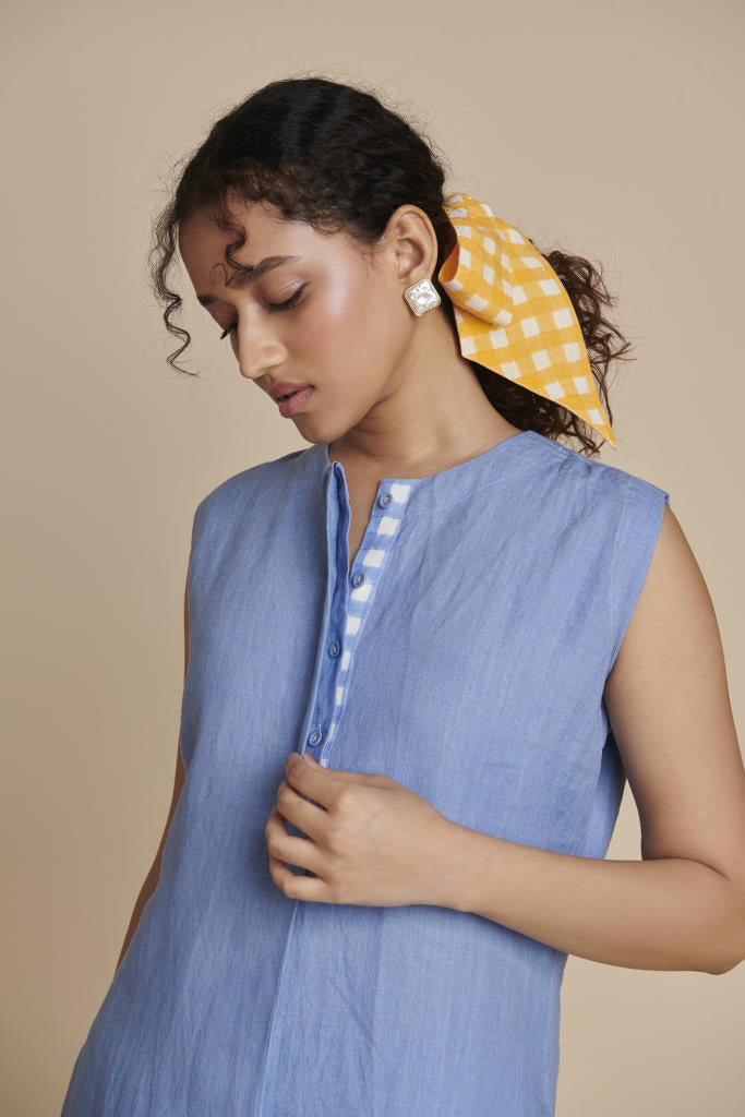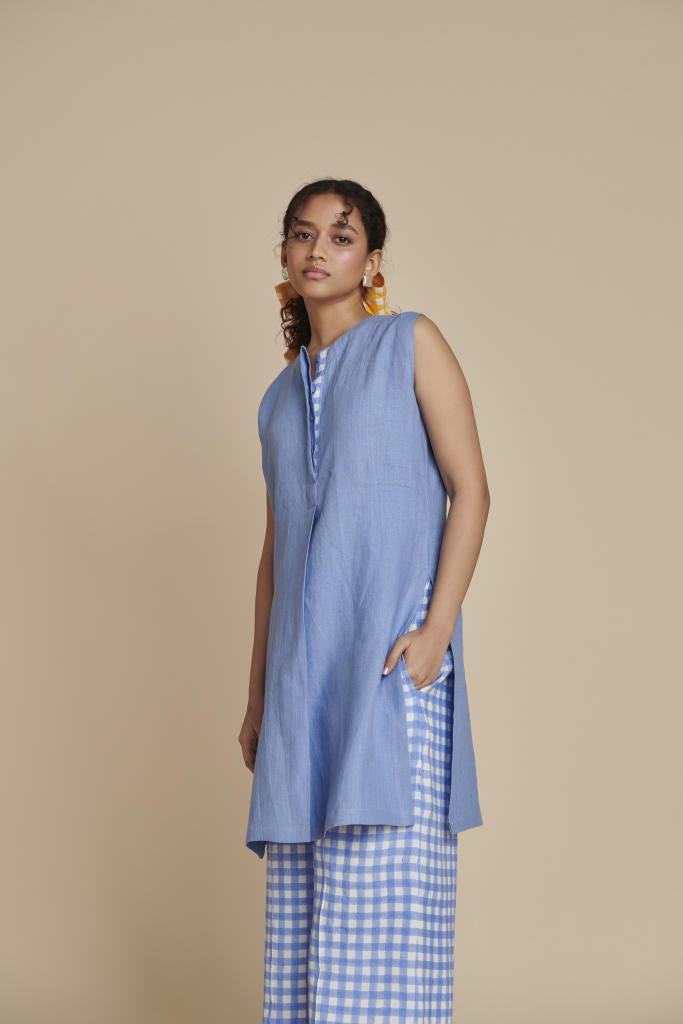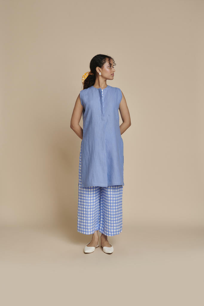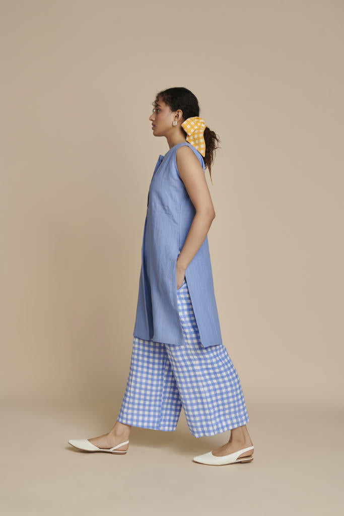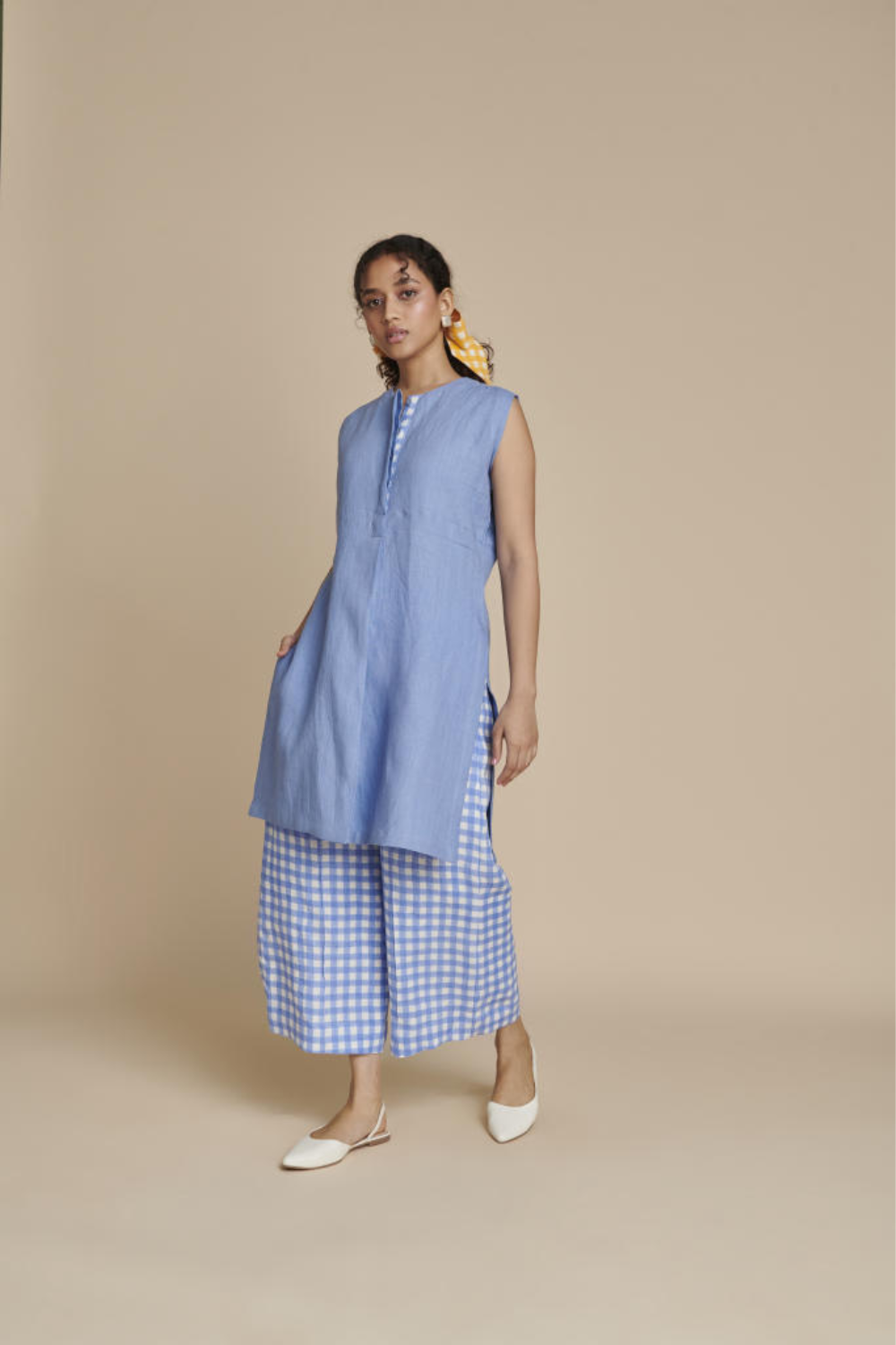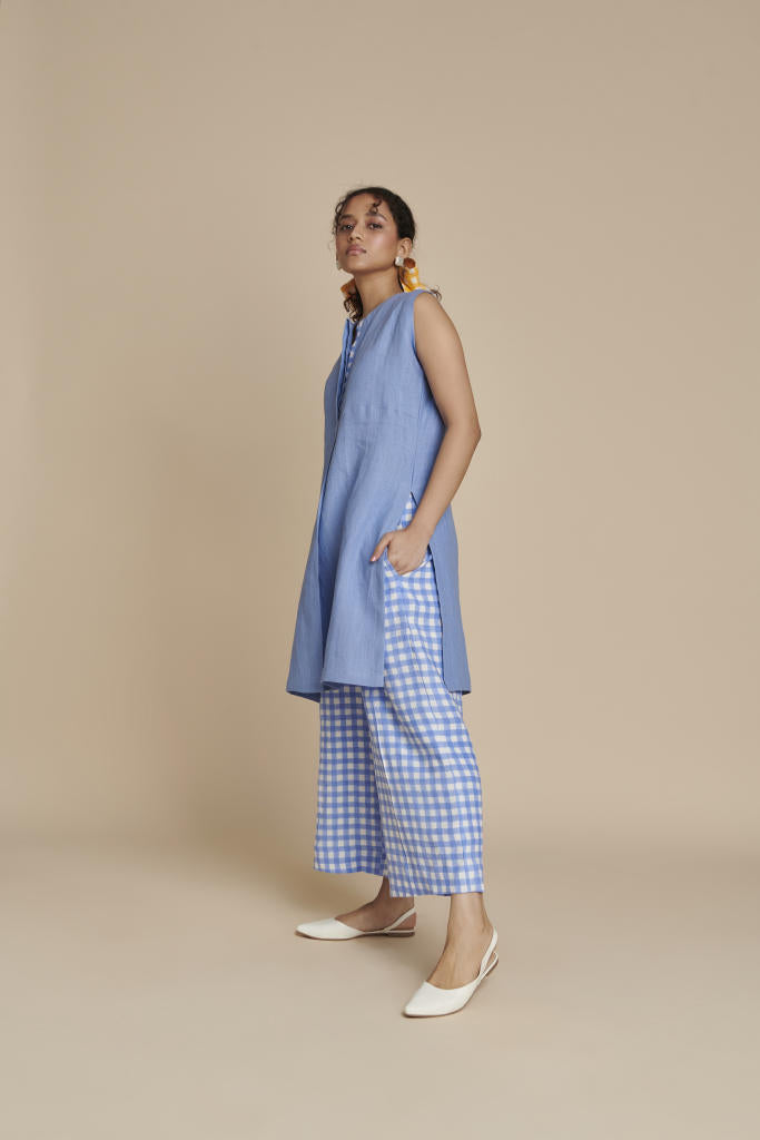 The Sleeveless Kurta takes center stage with its classic silhouette and modern twist. The simplicity of the kurta's design allows for versatile styling options, making it suitable for a variety of occasions, from casual gatherings to more formal events. This set comes with culotte pants made out of printed fabric with colours co-ordinating the kurta. The kurta is accentuated with the printed fabric at the placket, which ties the set together. The fabric buttons add a touch of elegance to the playful yet chic ensemble.