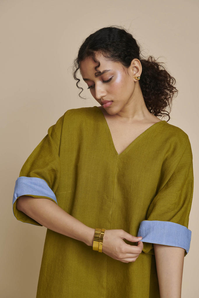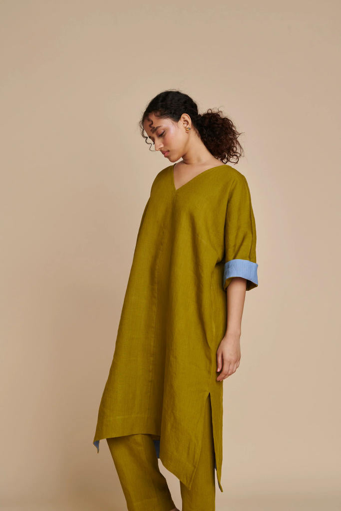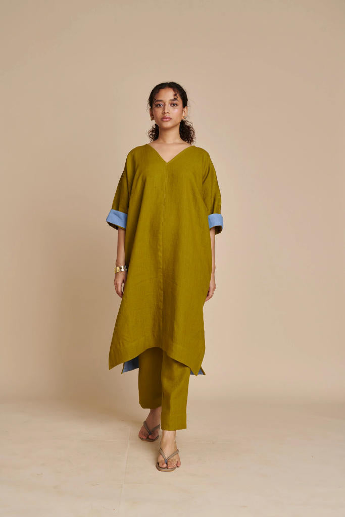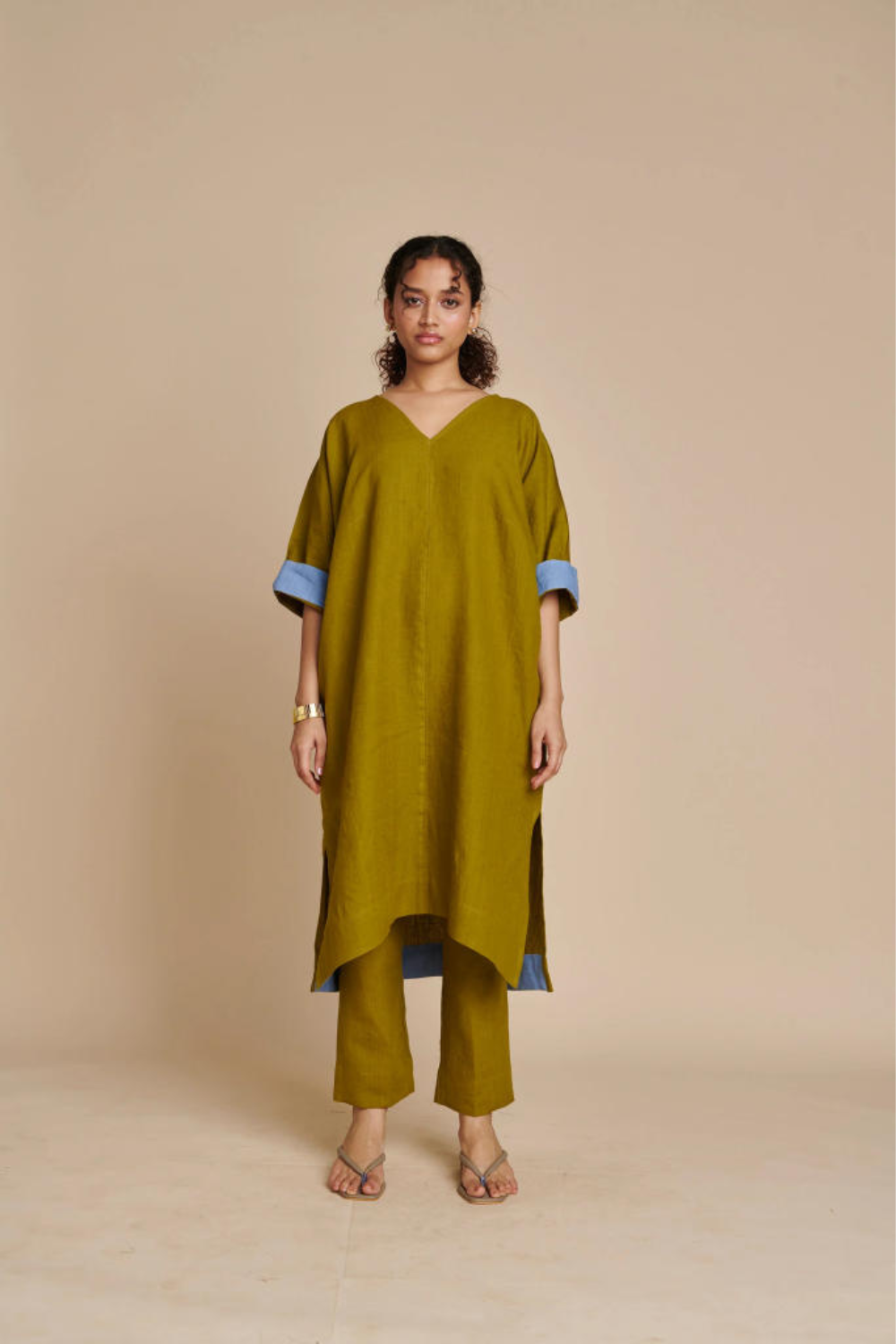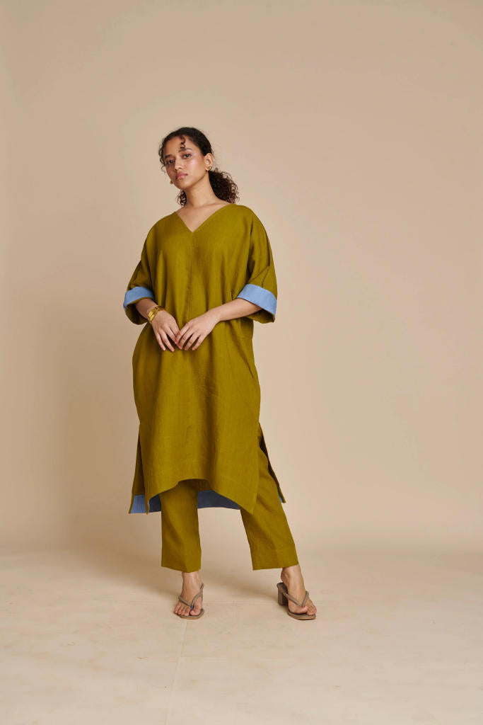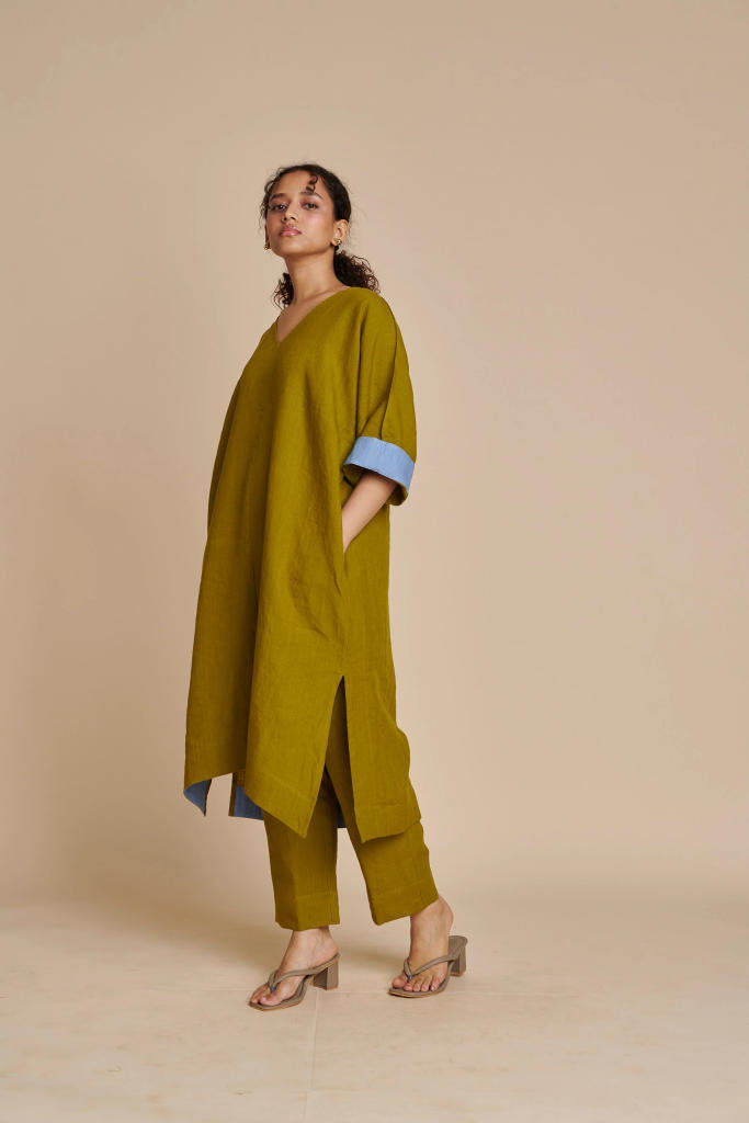 We can't get enough of the linen Dolman Kurta Set. A relaxed silhouette with slim pants in linen, enjoy the contrast hem details and slide your hands into the side-pockets to strike a pose this festive season. Here is the perfect outfit for long brunches, card parties and office get-togethers.