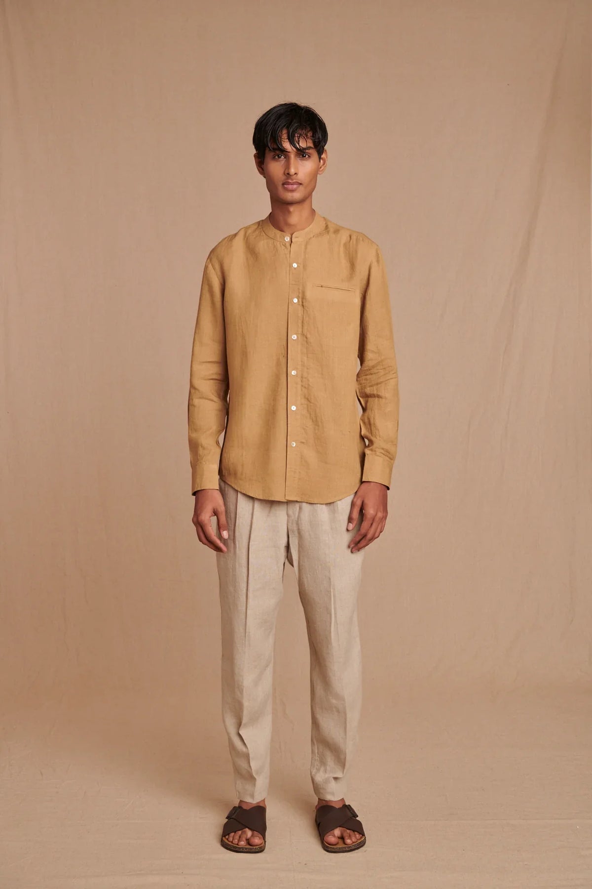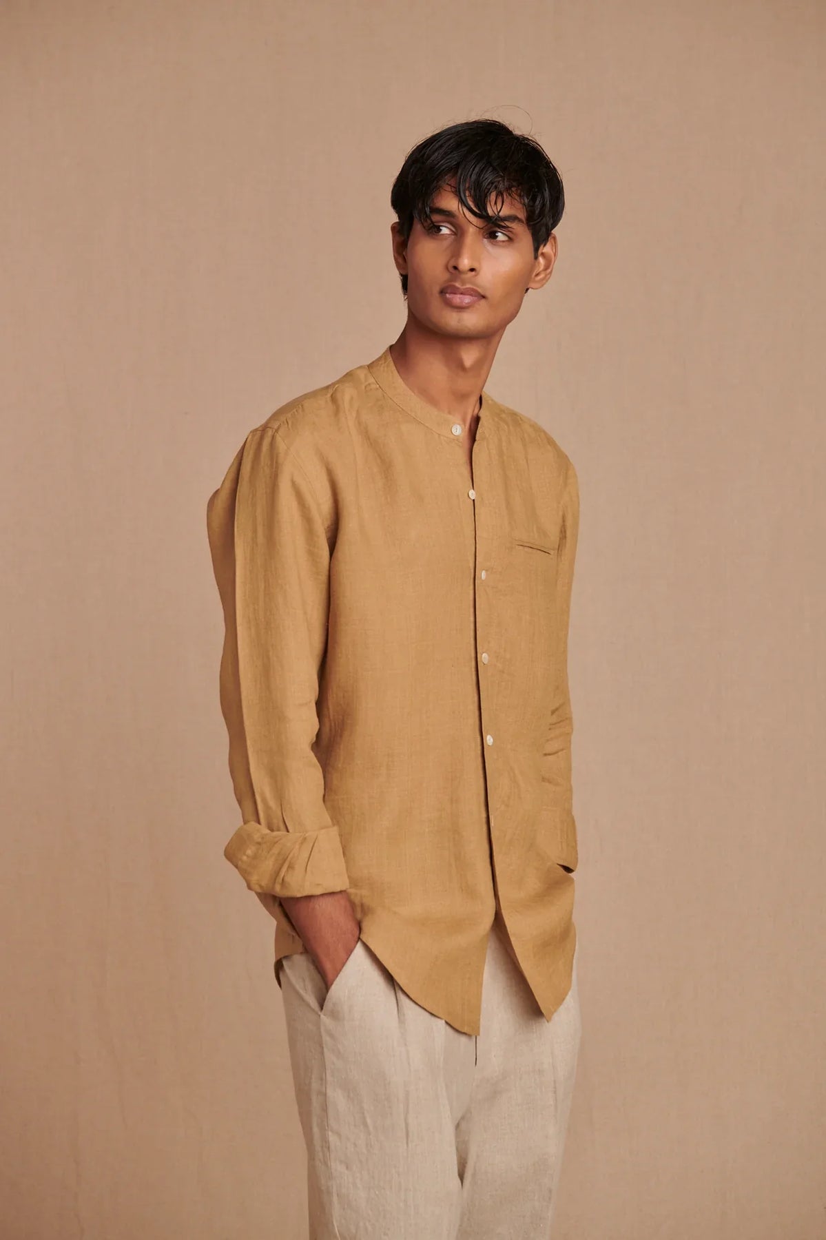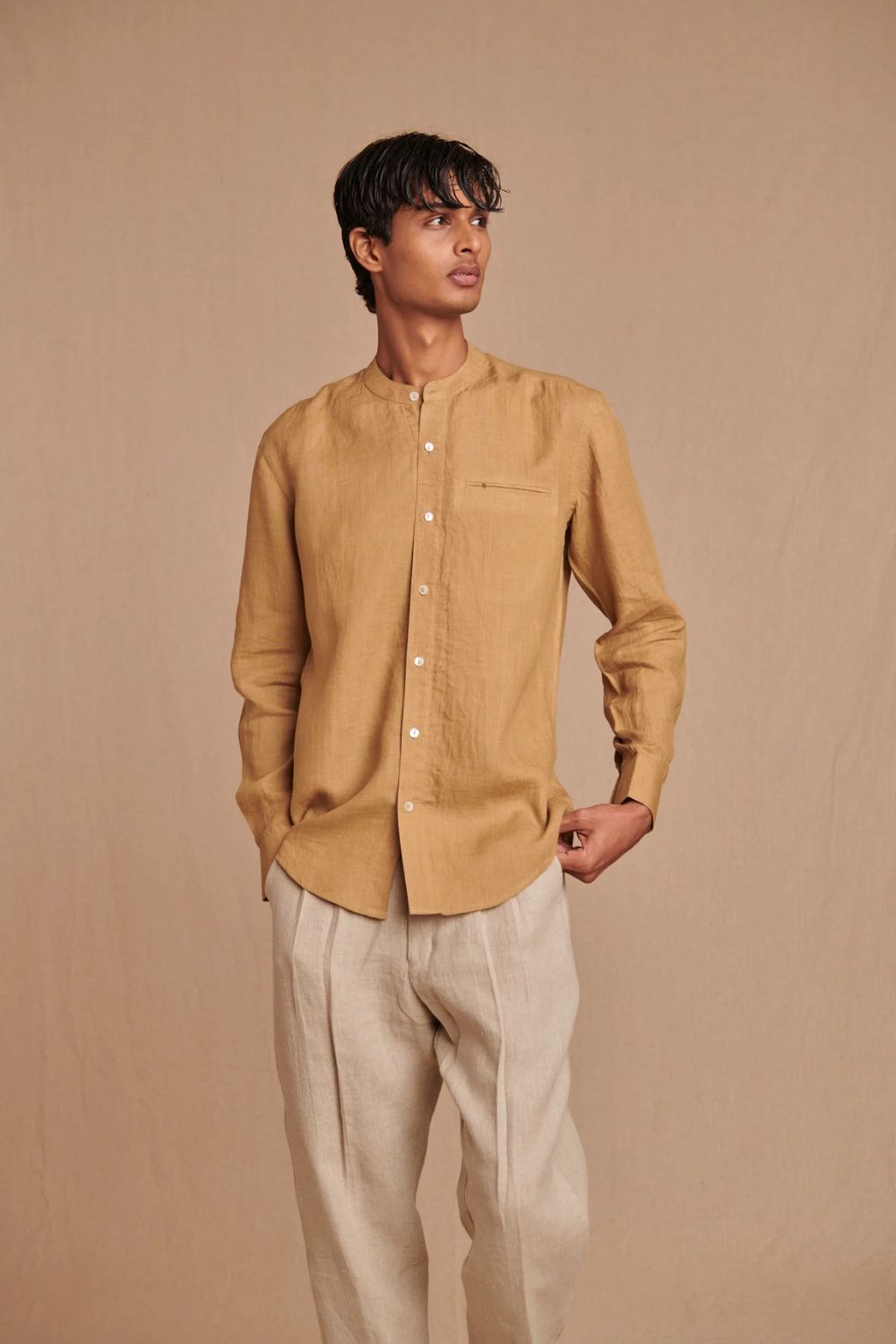 Husk Linen Men's Band Collar Shirt - Slim Fit