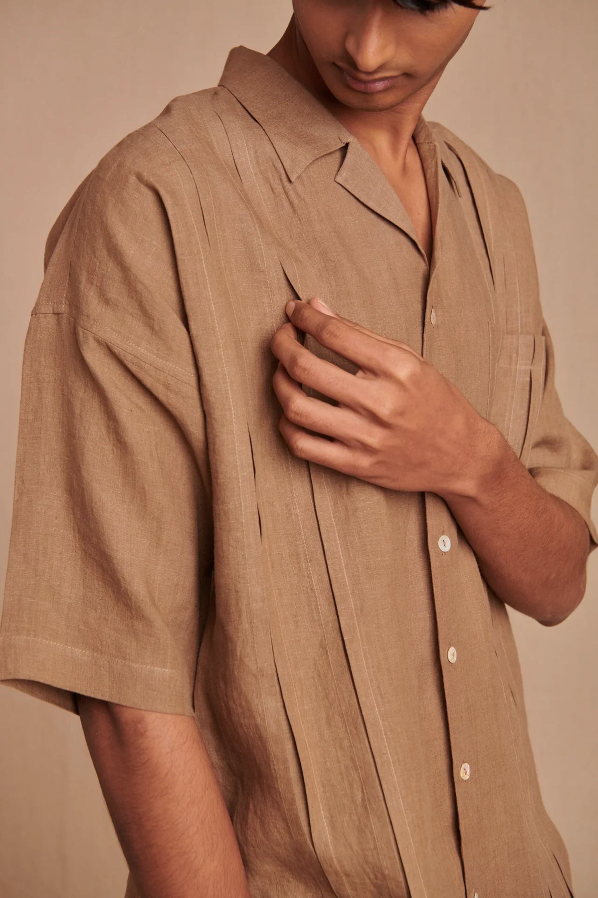 Cut for comfort, this relaxed fit camp collar shirt is tailored from 100% pure linen with a soft drape and laid-back attitude. Tonal stitched panels add quiet structure and rhythm — flowing uninterrupted across the chest pocket for a seamless finish. Completed with mother-of-pearl buttons and a breezy silhouette, it’s designed for warm light and slower days.