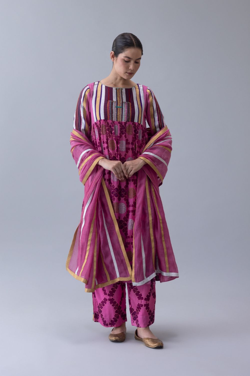 Bodhi dupatta in pink Chanderi, featuring all-over gold and silver tissue stripes. A matching metallic border with top-stitch detailing elevates the piece, adding both structure and sophisticated finish. Country of origin: India