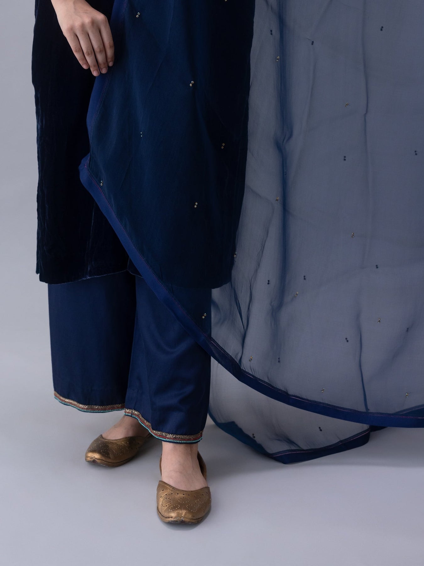 Jokhang dupatta in indigo silk organza, featuring intricate glass bead and sequin work. Indigo shantoon badwa with hot pink jaali detailing introduces bold contrast, lending a modern edge to the silhouette. Country of origin: India