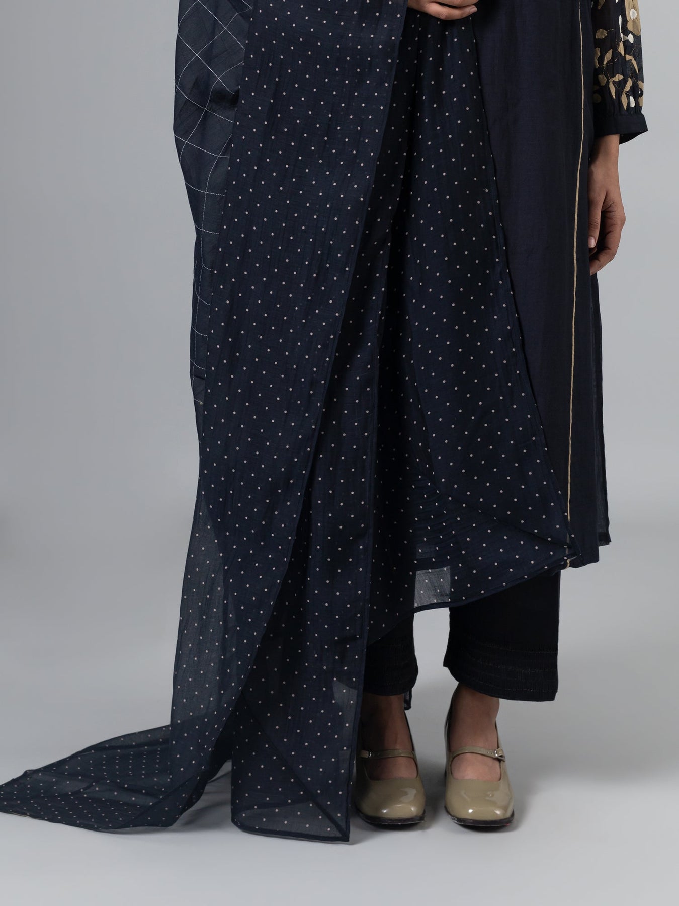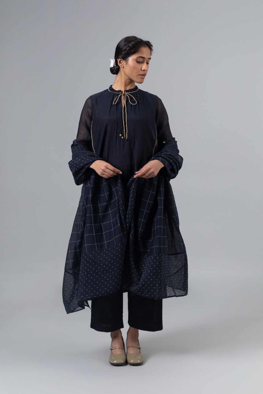 Black Nura, an exquisite dupatta crafted from fine chanderi, showcases an engineered pattern with stitched boxes at the center and a stunning allover natural discharge dot print on the borders, creating a garment of sophisticated style and unique design.