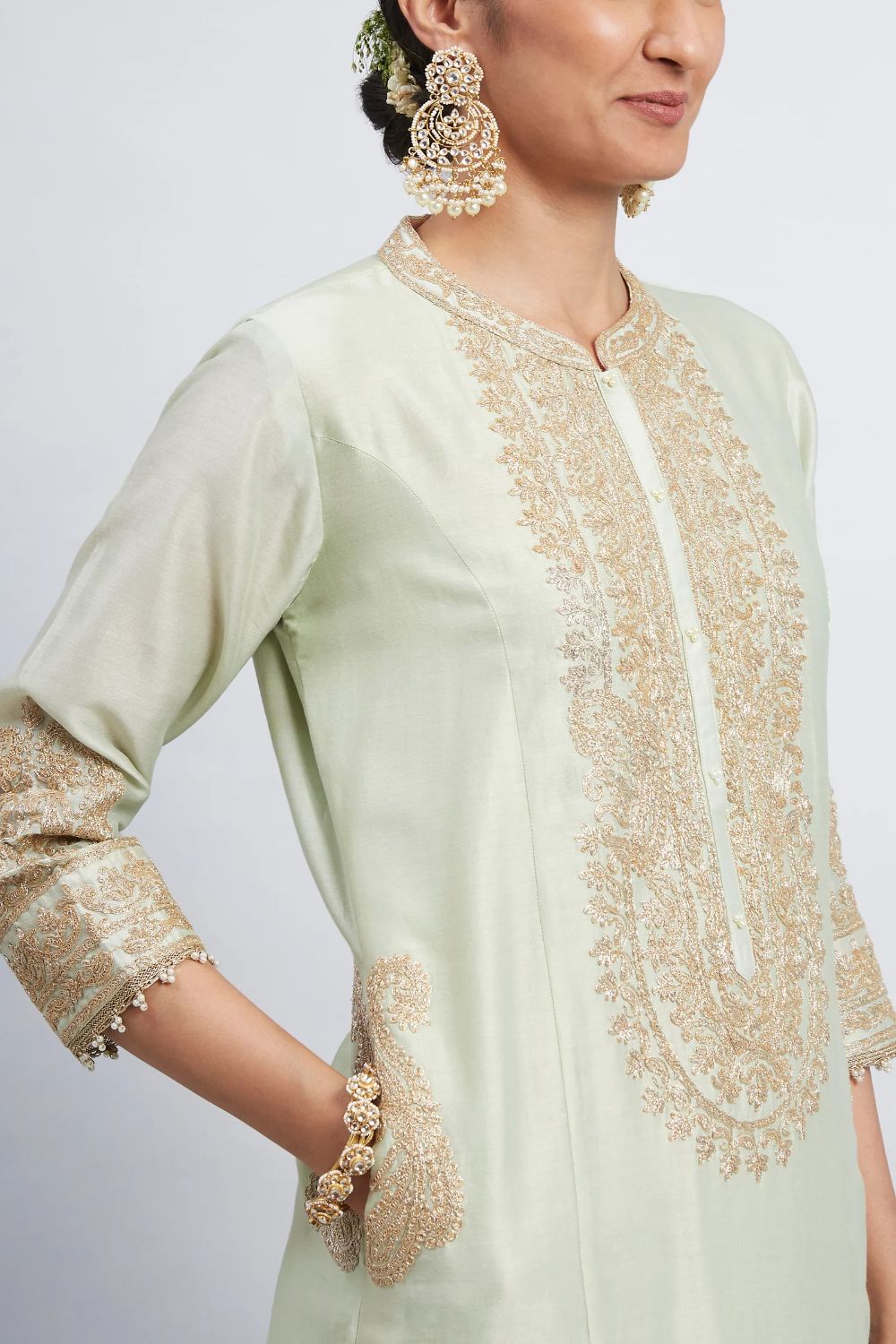 The Aadah ensemble from our Firozah collection is made using a pure Chanderi Silk fabric and is adorned with heritage Kashmiri Tilla embroidery. It features a Mandarin collar with a placket, three-quarter sleeves and side pockets. The look comes together with a straight palazzo. The outfit is finished using an exclusive Chanderi Silk Banarsi fabric and Pearls.