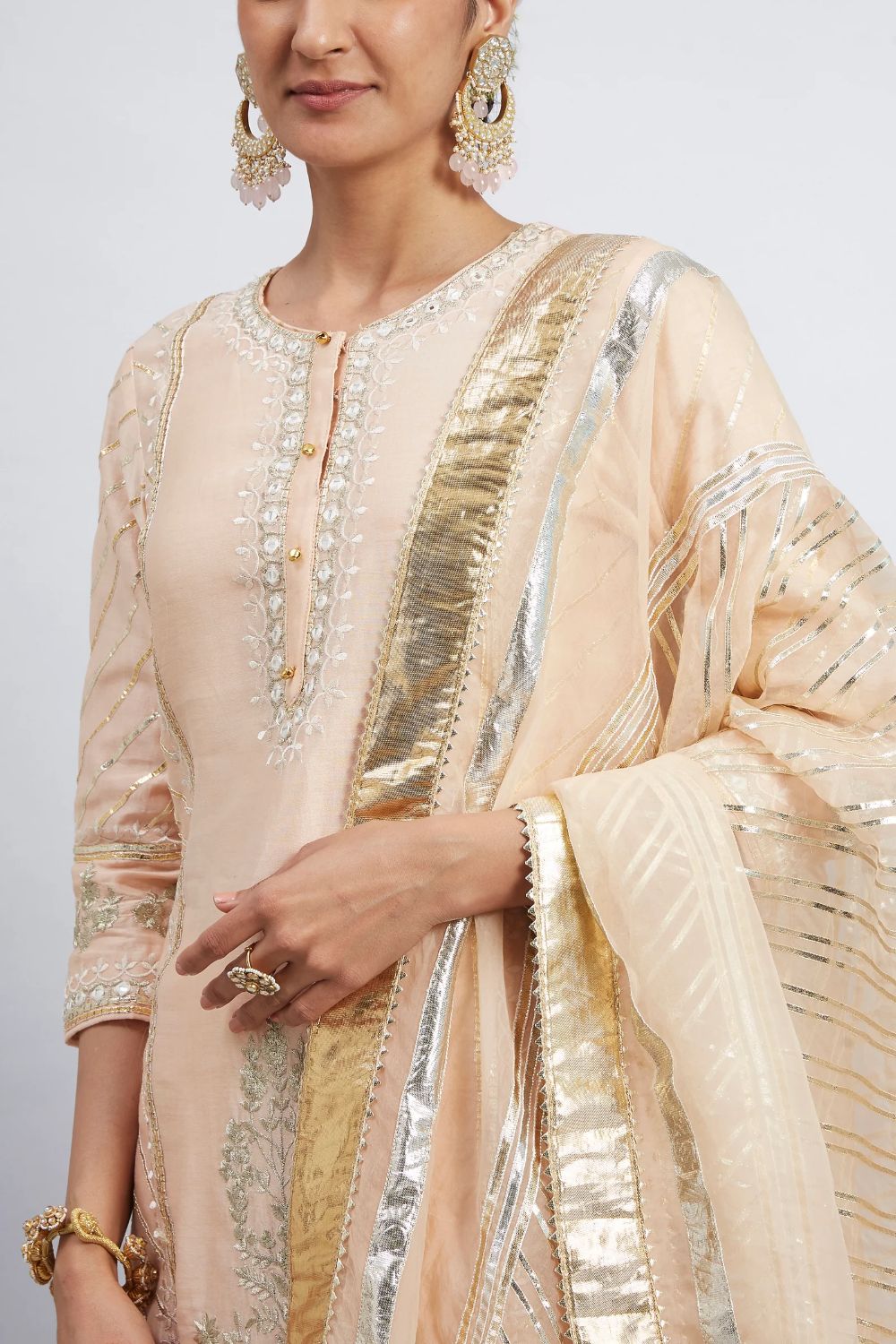 The Eliza ensemble from our Falak Collection is made using a pure Chanderi Silk fabric. It features a Crew neck with a placket and three-quarter sleeves. The outfit is finished using a tone on tone Chanderi Silk Banarsi fabric. The placket with is finished with ghunghroos for a more traditional touch.