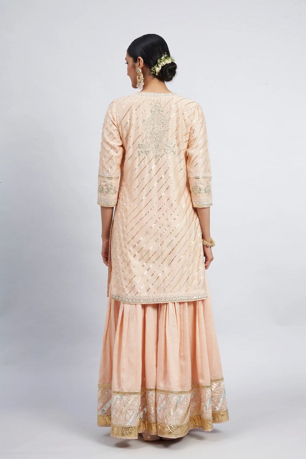 Color: Eliza - Peach Chanderi Silk Kurta and Garara Set with Organza dupatta