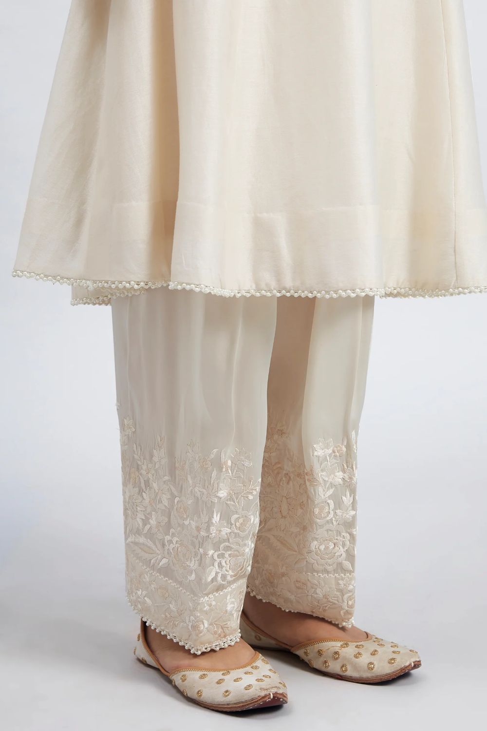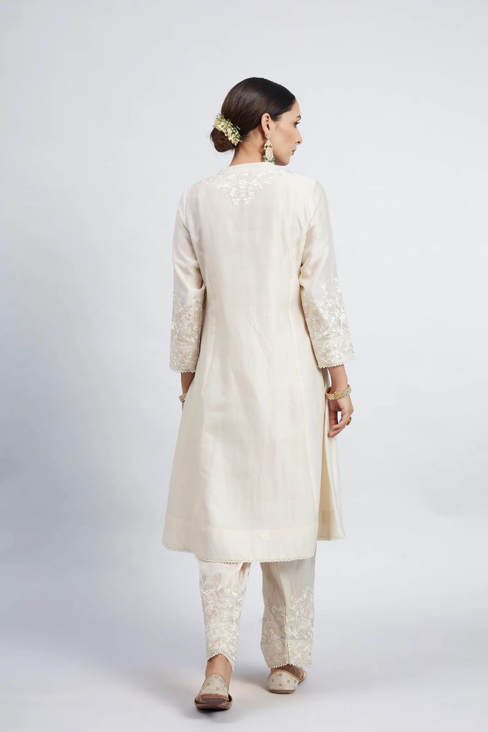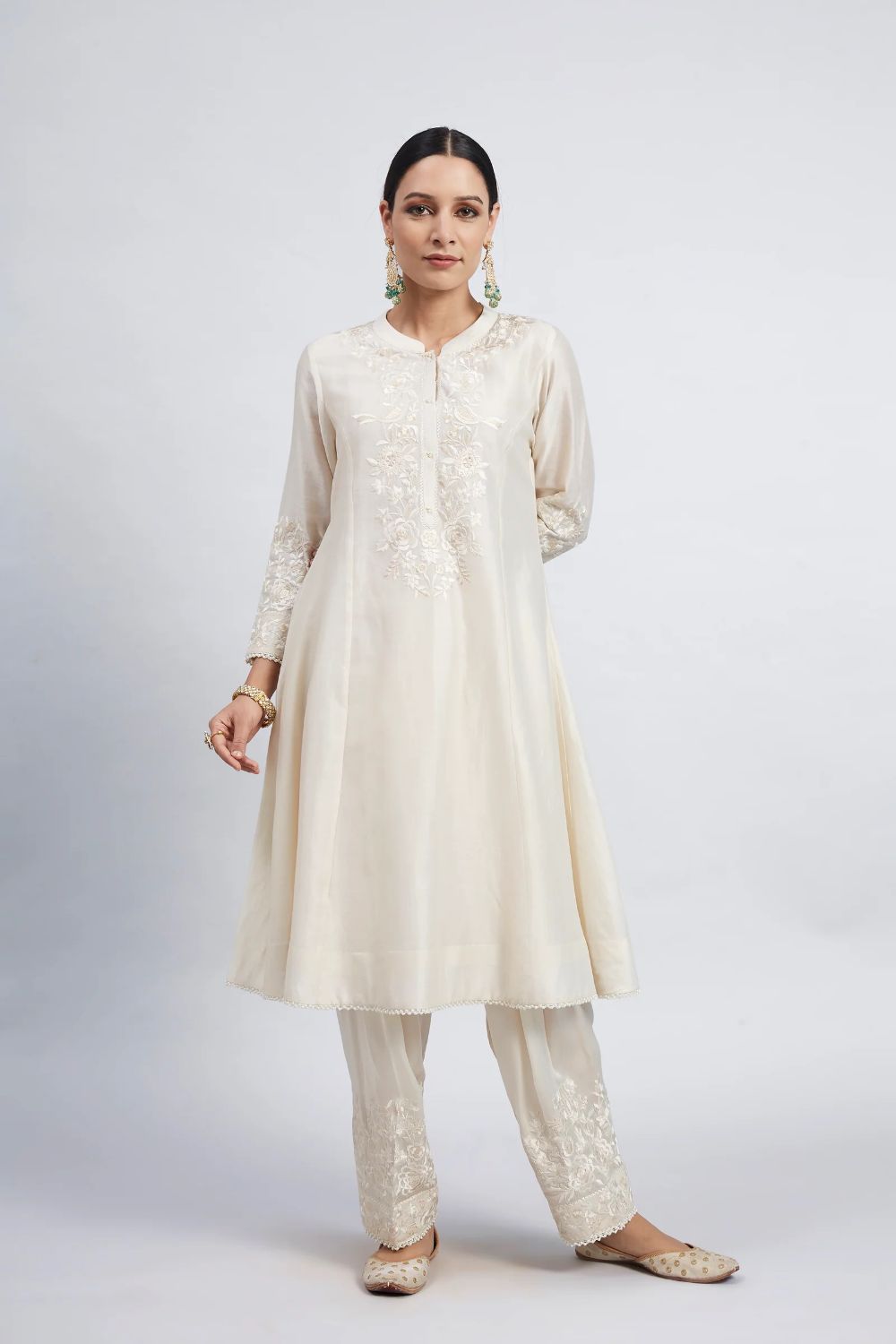 The Kaina ensemble from our Gulnaar collection is made using a pure Chanderi Silk fabric and is adorned with exclusive Parsi-Gara Embroidery. It features a Mandarin collar with a placket and three-quarter sleeves. The look comes with a Dogri Salwar and an Odhni. The outfit is finished using an exquisite Pearl lace.