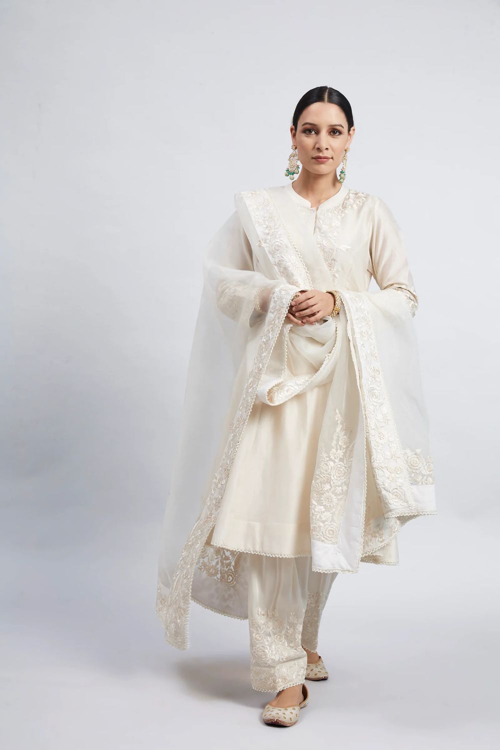 Each garment carries her signature balance — delicate motifs, fluid silhouettes, and a fit that feels custom even before tailoring begins. Her embroideries are intricate yet airy, expressive yet elegantly understated.