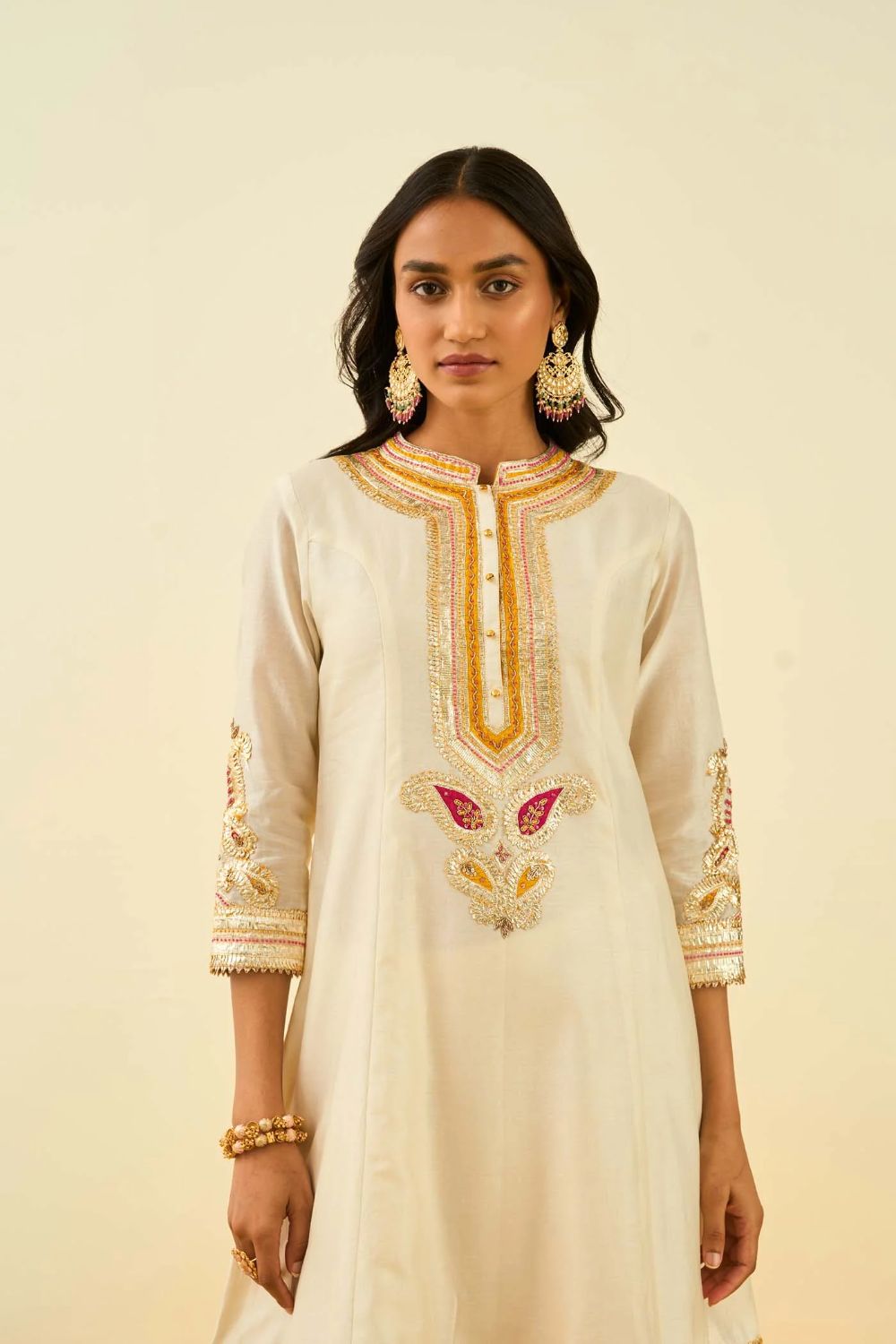 The Sadirah ensemble from the Noor collection is made using a pure Chanderi Silk fabric, crafted with gotapatti and highlighted with basra moti. It features a Mandarin collar with a placket and three-quarter sleeves. The look comes together with a salwar and a silk organza dupatta. The outfit is finished using an exclusive Chanderi Silk Banarsi fabric and Pearls.