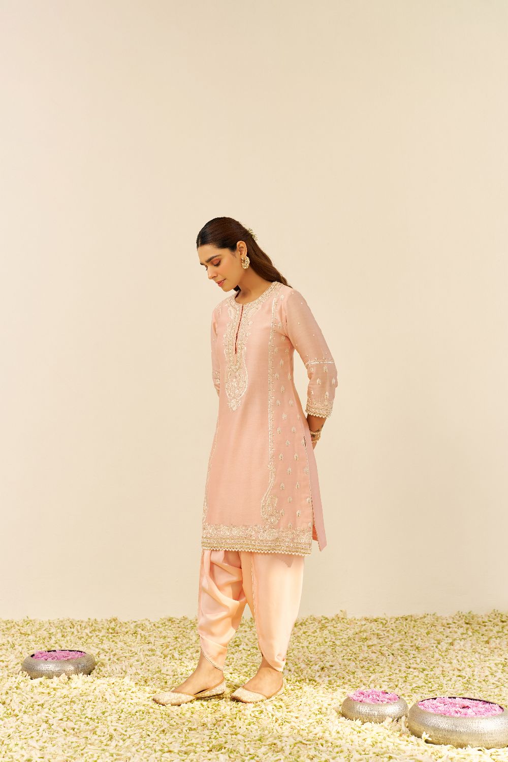 This exquisite ensemble is crafted from pure Silk Chanderi fabric, offering a luxurious and refined texture. It is elegantly adorned with heritage Parsi Gara embroidery, showcasing intricate craftsmanship that adds timeless beauty to the design. The outfit features a chic zero-neck with a placket and three-quarter sleeves, combining traditional elegance with contemporary flair. Paired with a stylish tulip dhoti, the ensemble radiates a unique sense of grace and sophistication. The entire creation is beautifully highlighted with delicate Tilla, Gota, and pearls, which enhance the intricate embroidery and elevate the overall look. Finished with the finest Chanderi silk fabric, this ensemble is a perfect fusion of heritage, craftsmanship, and modern style.