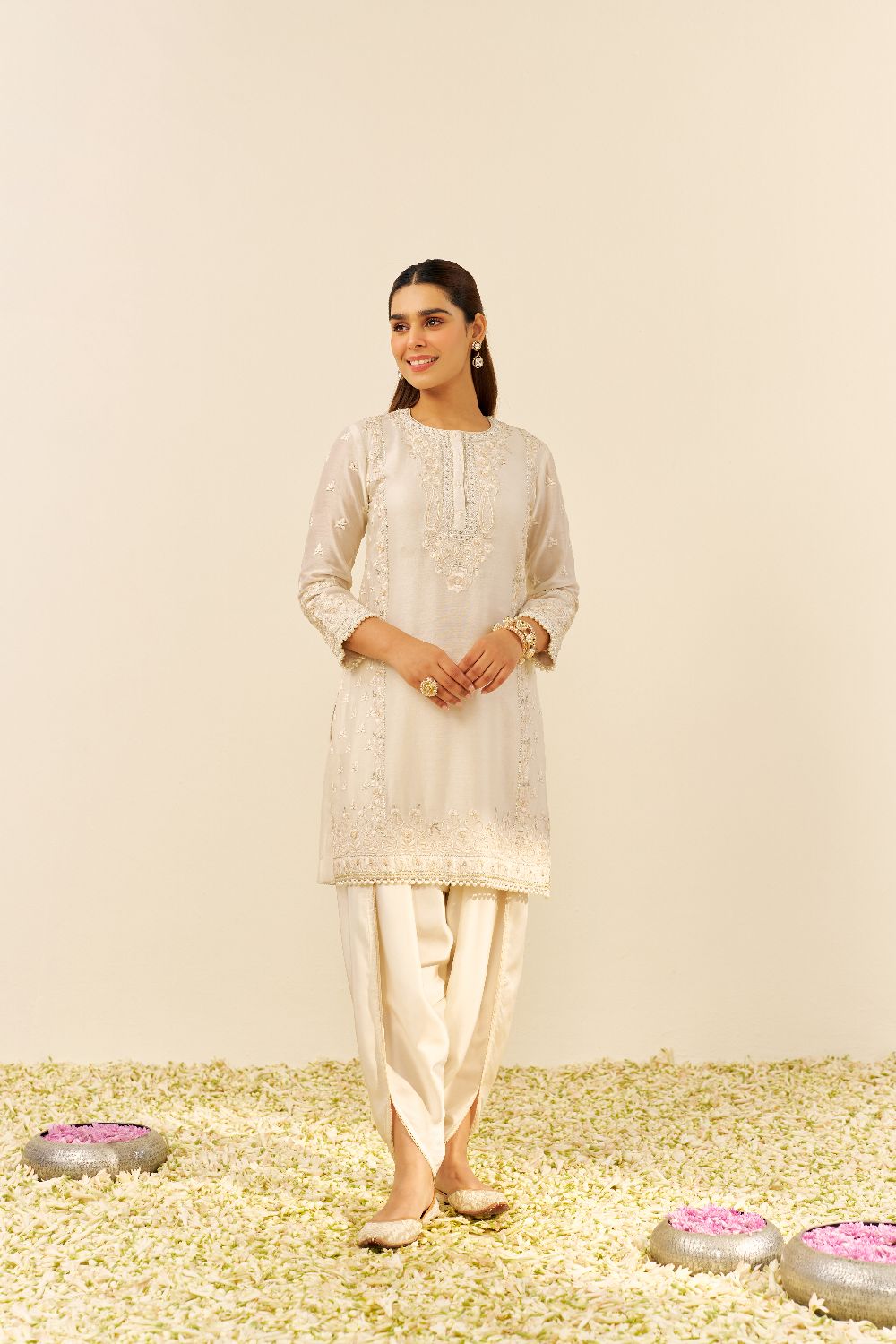 Each garment carries her signature balance — delicate motifs, fluid silhouettes, and a fit that feels custom even before tailoring begins. Her embroideries are intricate yet airy, expressive yet elegantly understated.