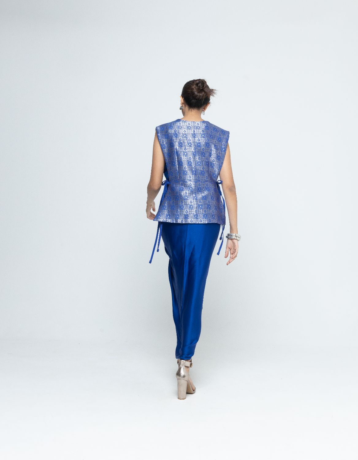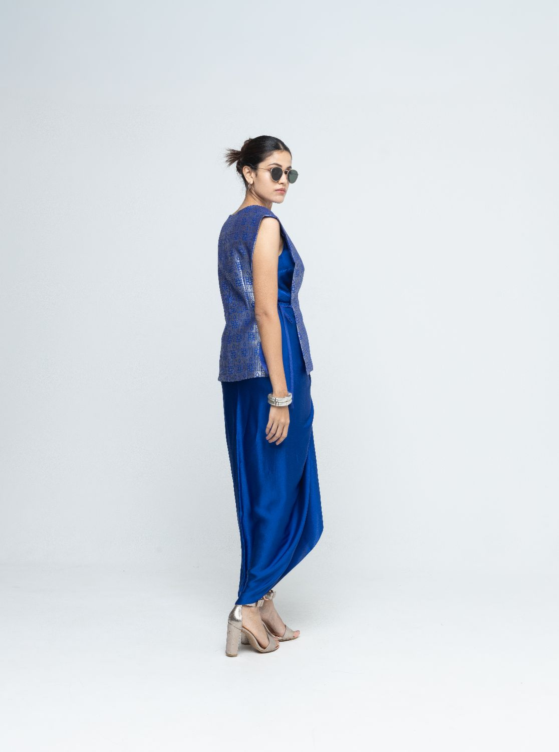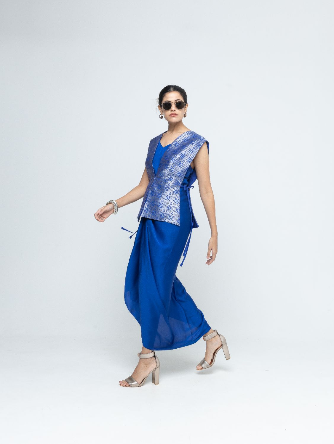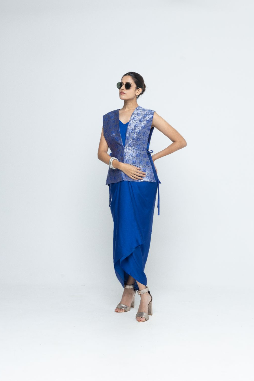 Blue Gilet with tie details on the side paired with a matching assymetrical dress