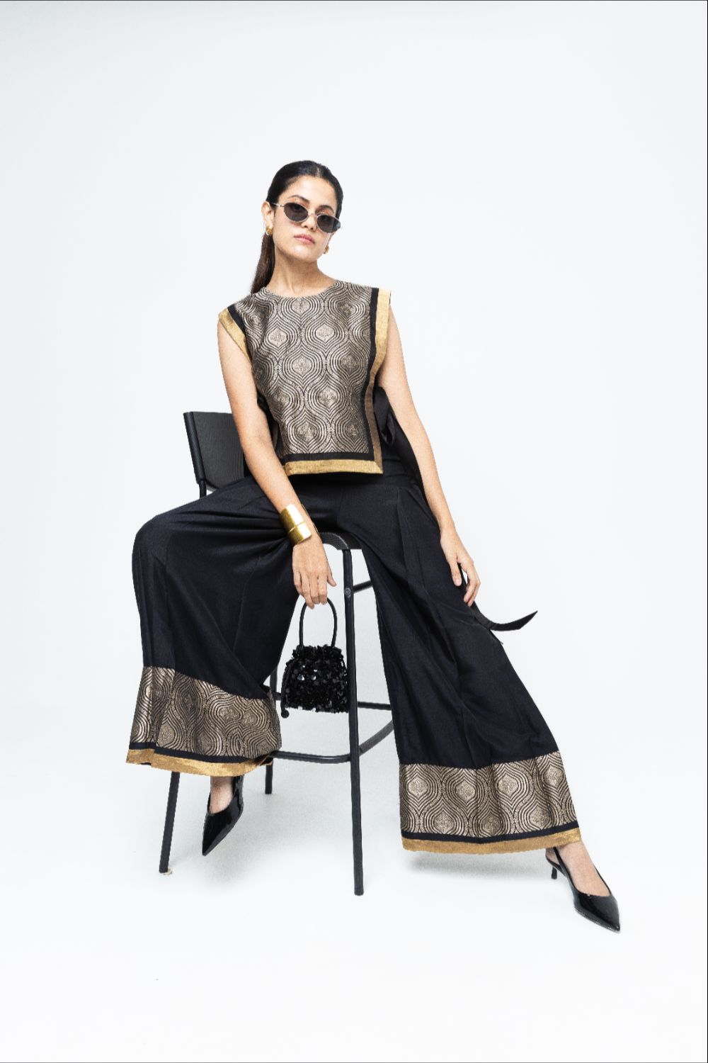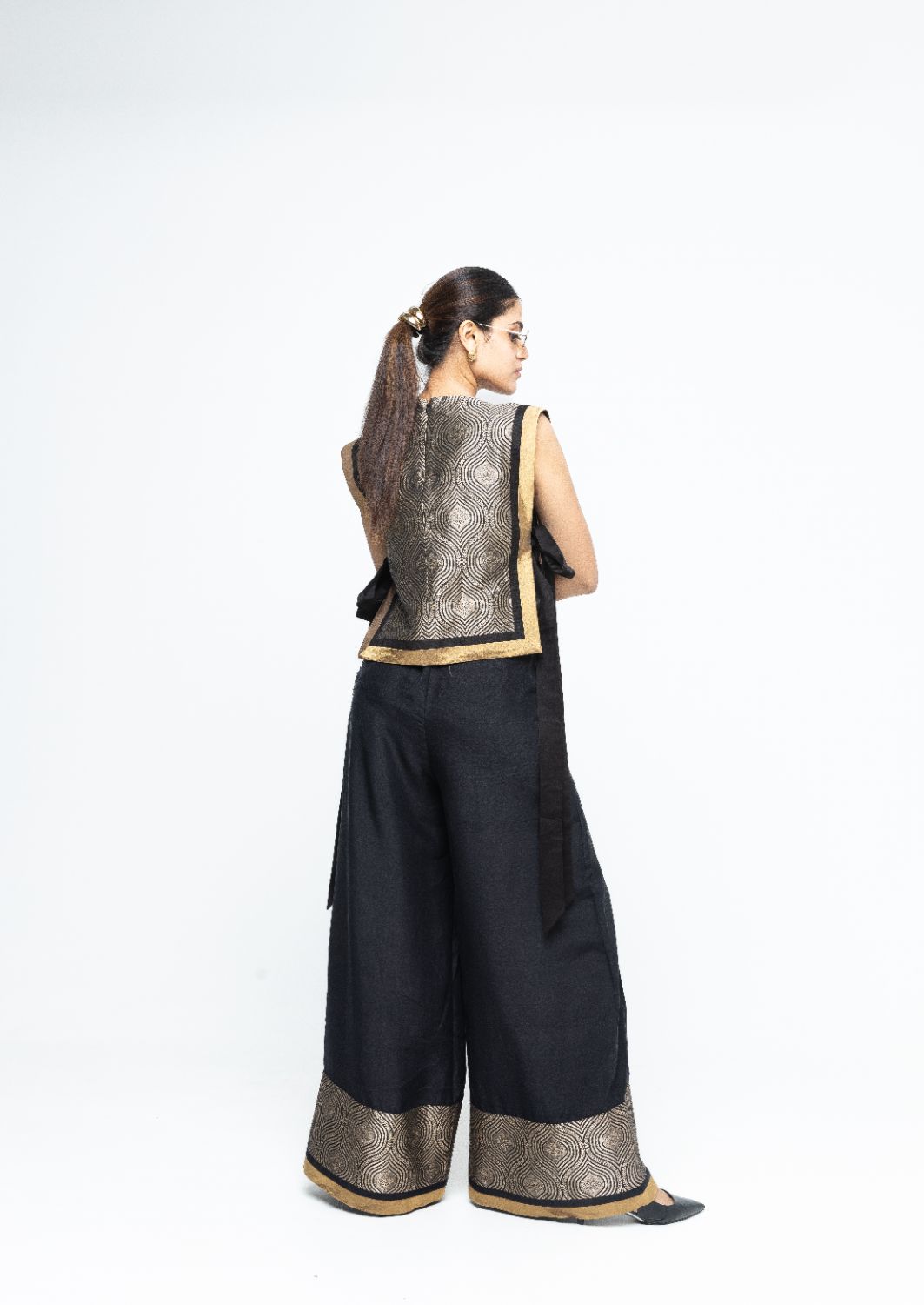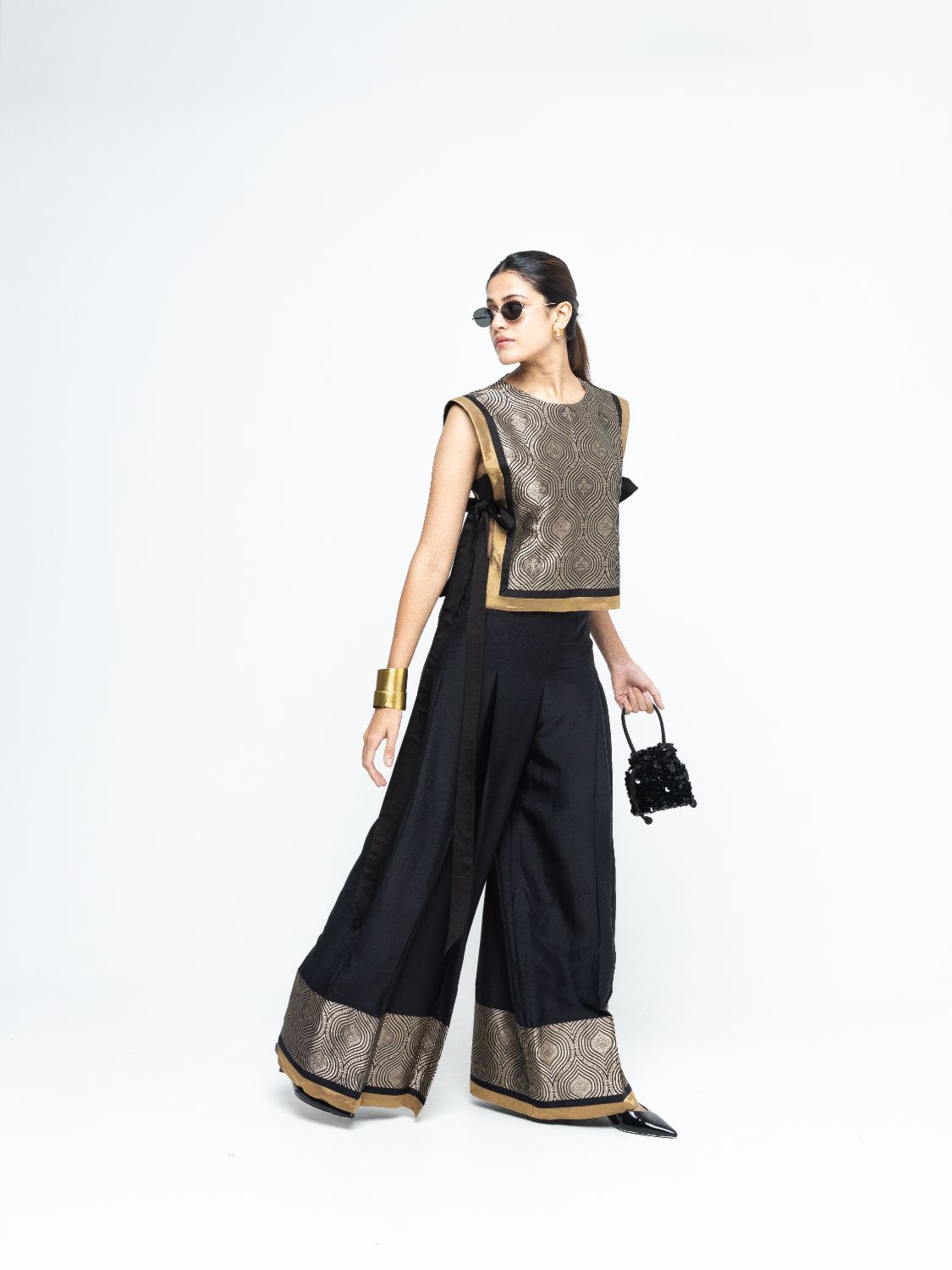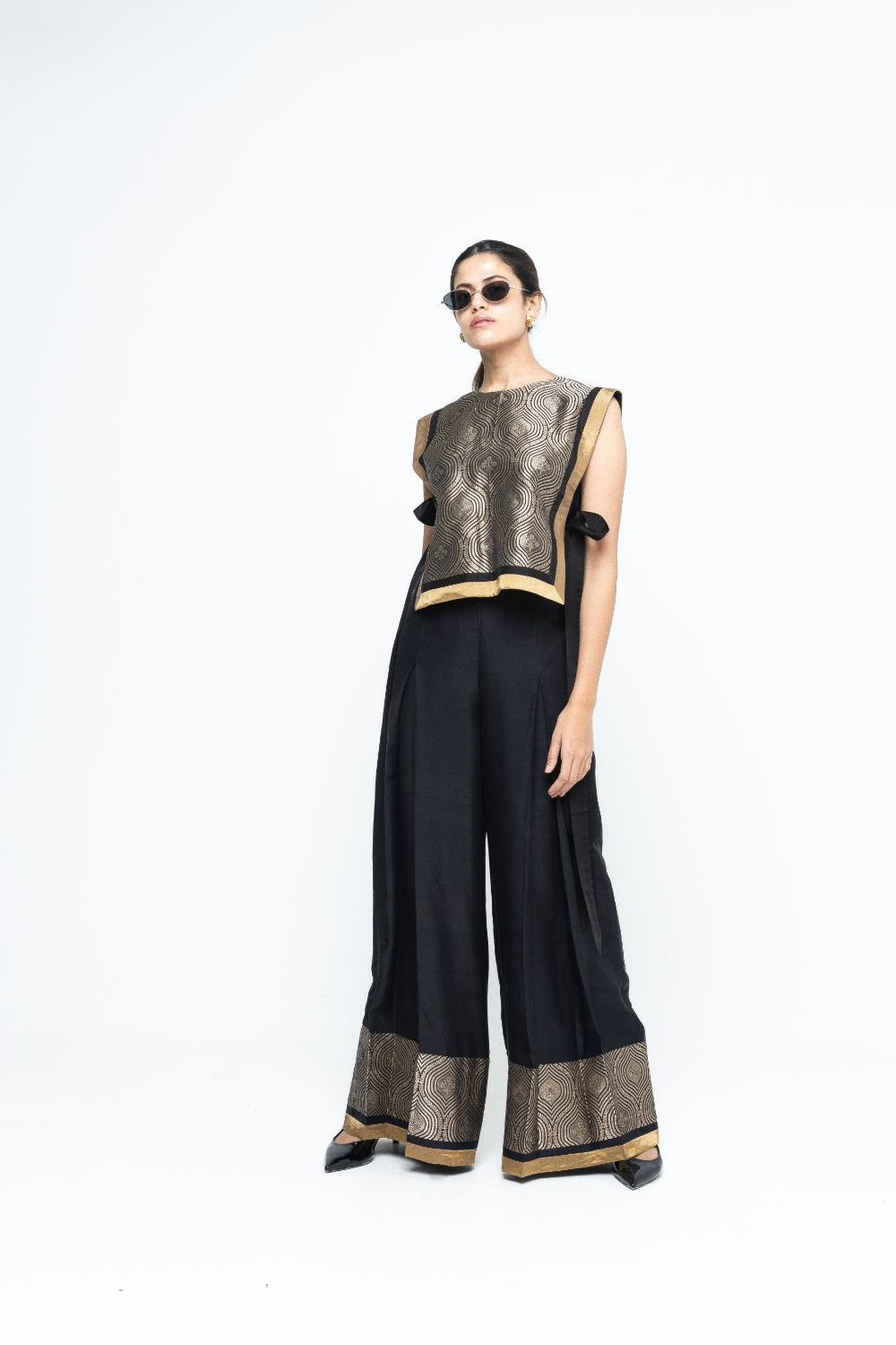 Statement scallop brocade Bib with tie detail paired with box pleated silk pants with brocade detail.