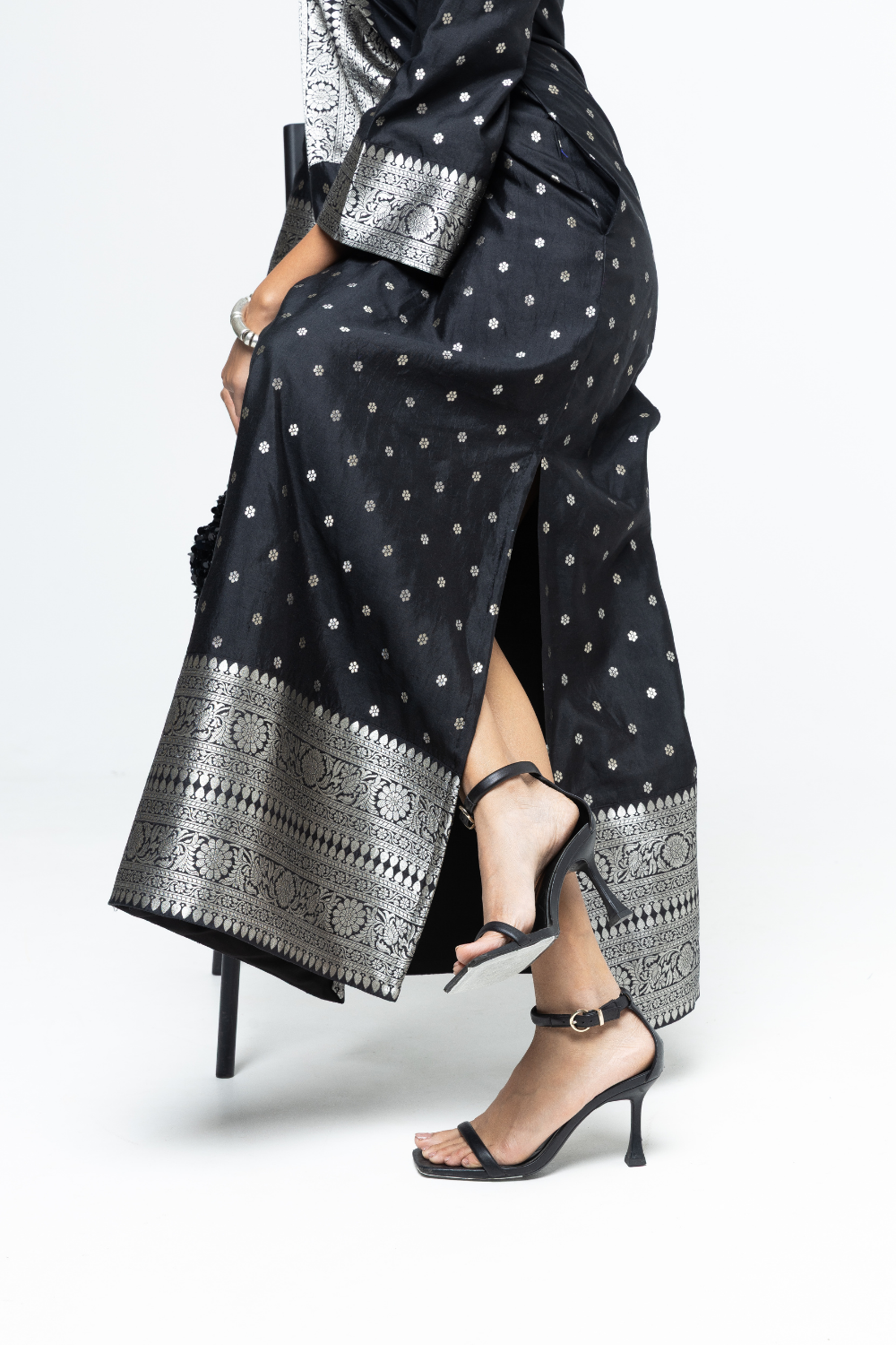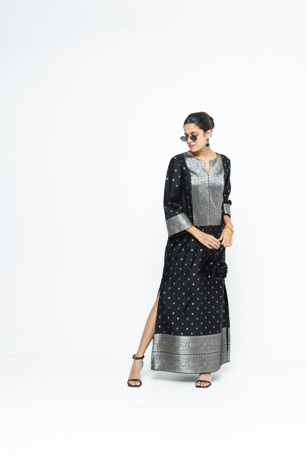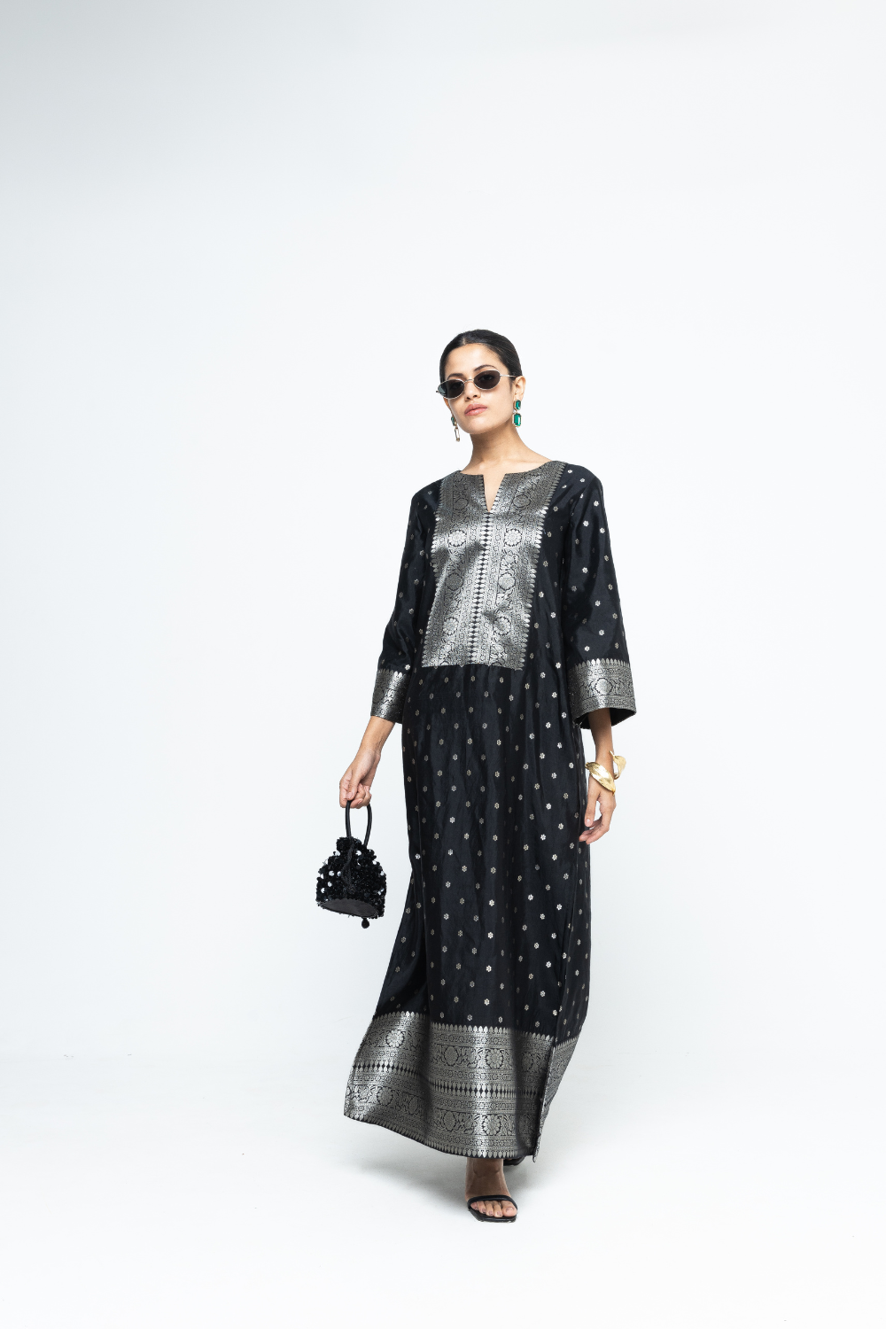 Statement black butti silk Kaftan with brocade detail on yoke, sleeve and Daaman with slit details on the side.