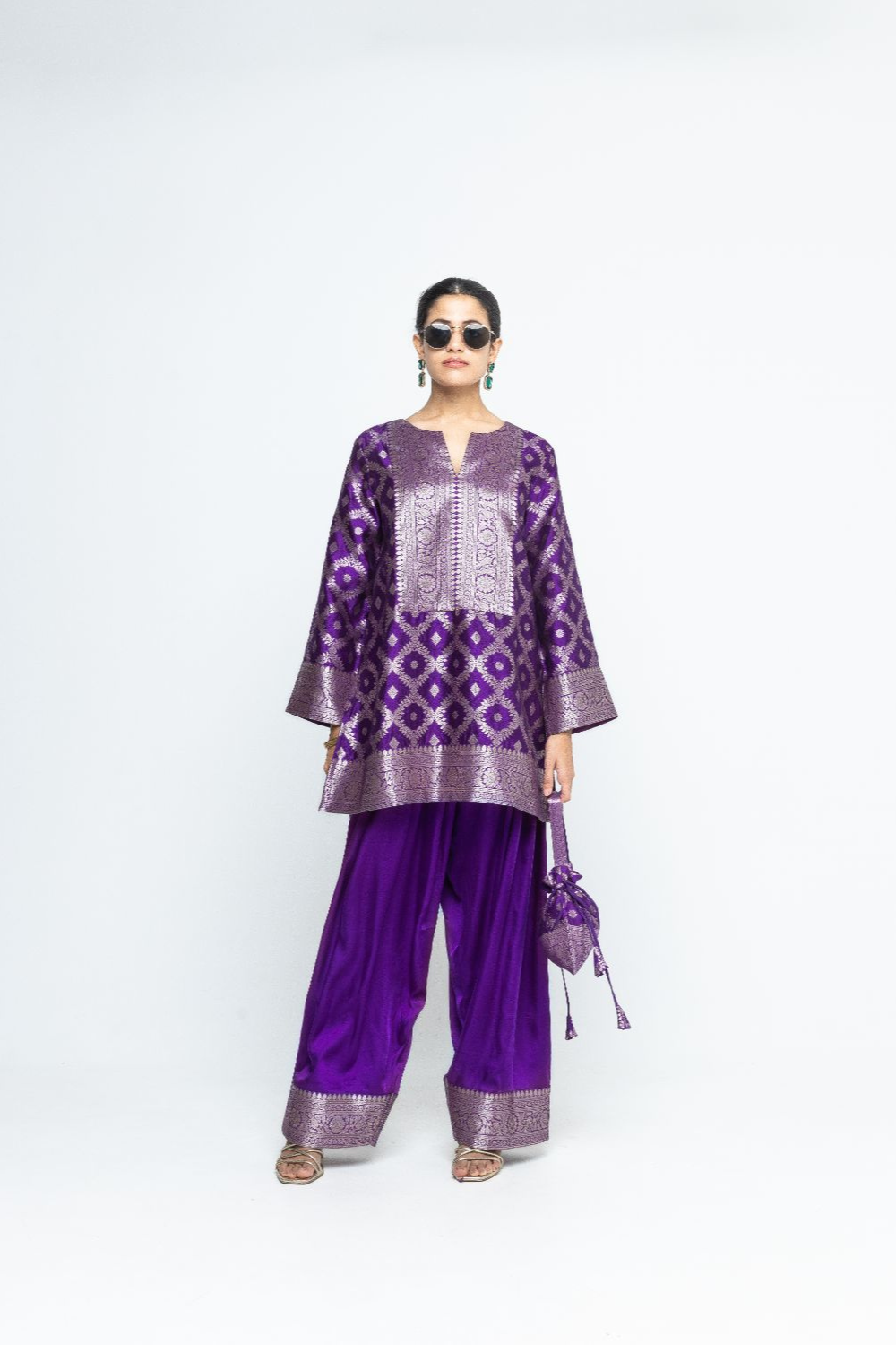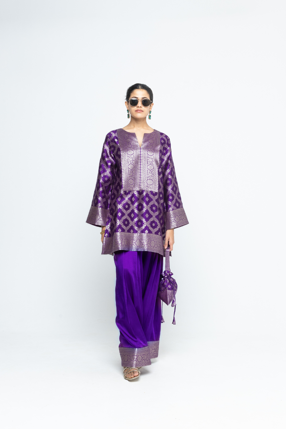 Purple Jaal Silk Kurta with woven brocade details on neck sleeves and bottom paired with matching Farshi salwar with brocade details at the hem.