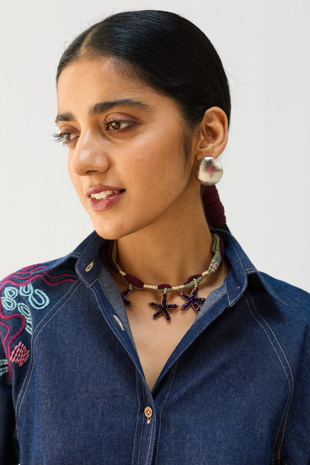 Relaxed fit, long sleeve, collared, classic shirt that buttons at the front, crafted in sustainable organic cotton denim fabric, hand and machine embroidered with shore-inspired motifs.