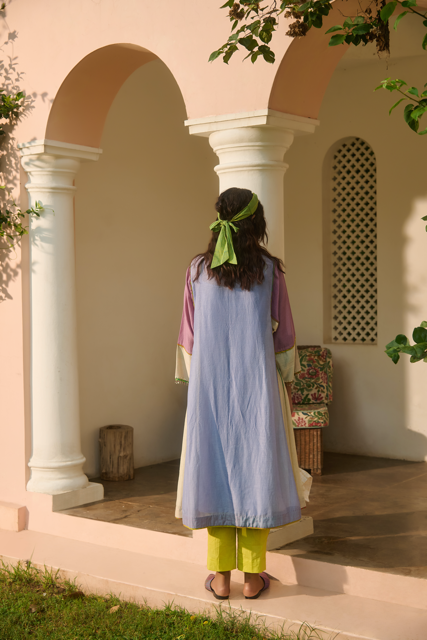 Her Chanderi carries its signature translucence and soft sheen, but with a subtlety that feels almost ethereal — printed slowly, consciously, through hand block printing that heightens the fabric's inherent delicacy.