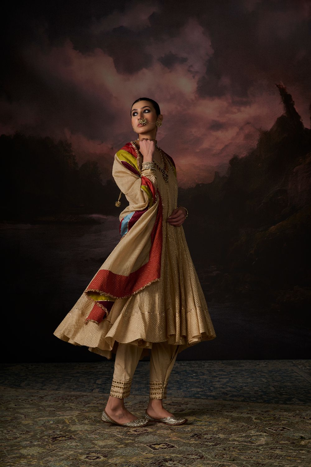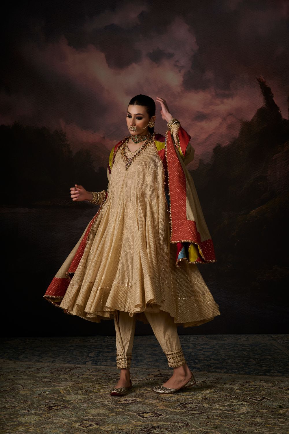 Her Chanderi carries its signature translucence and soft sheen, but with a subtlety that feels almost ethereal — printed slowly, consciously, through hand block printing that heightens the fabric's inherent delicacy.