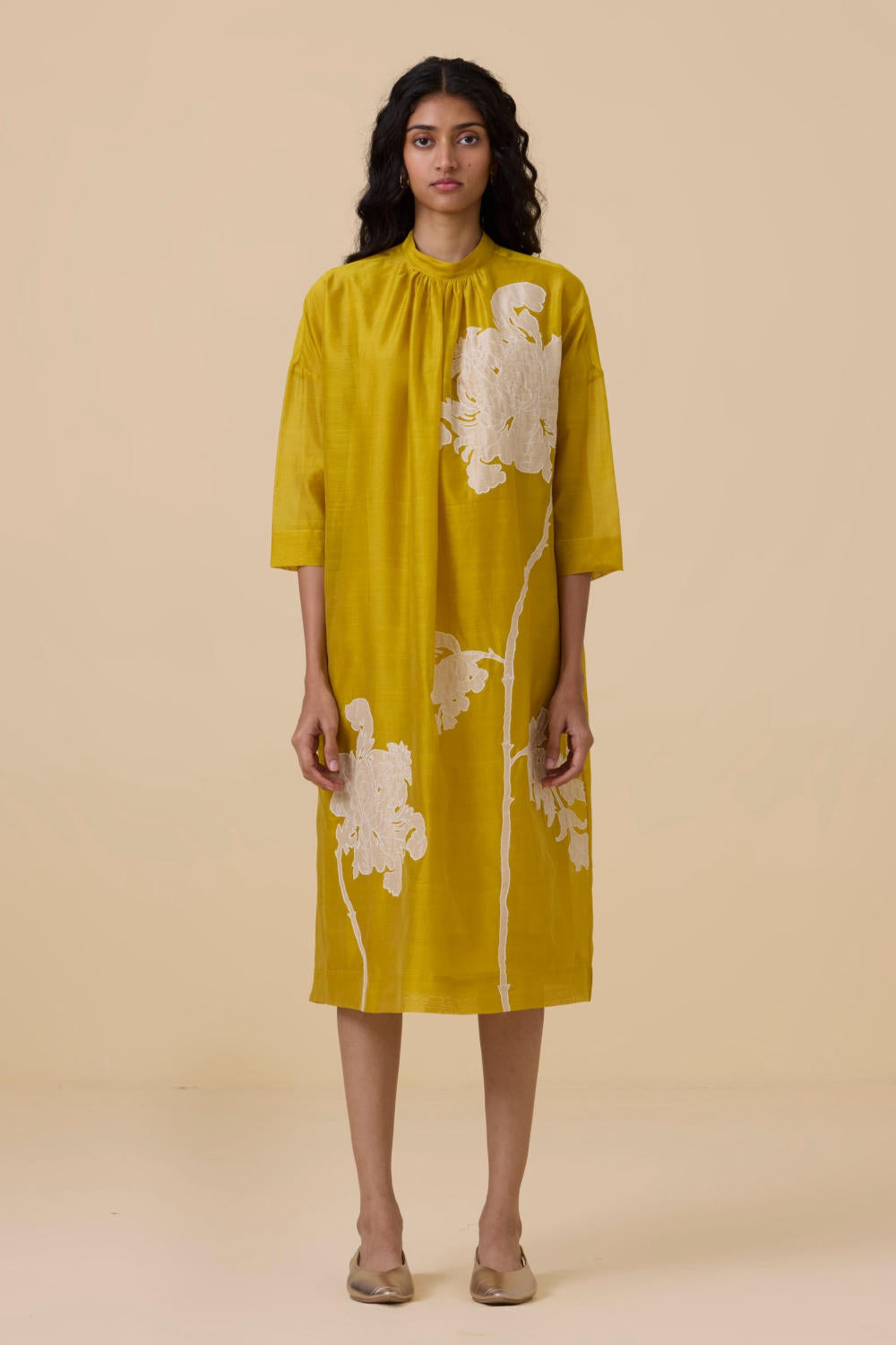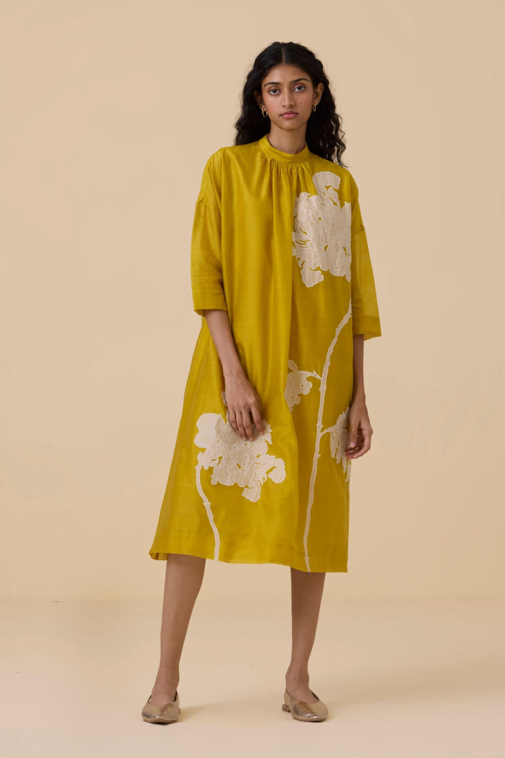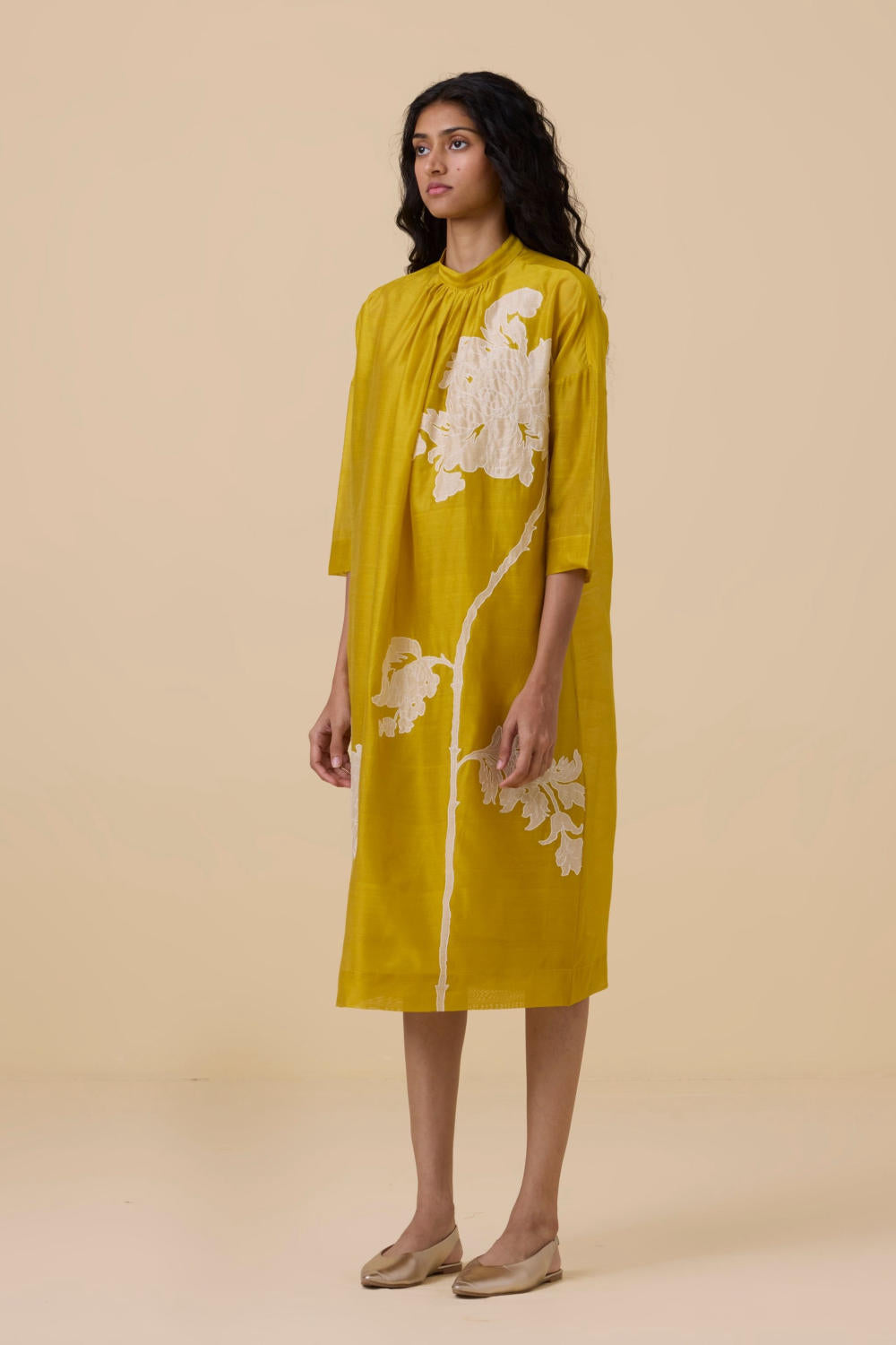 A refined dress that's perfect for special occasions. Handwoven chanderi featuring hand applique make this a modern day heirloom. Bracelet length sleeve. Soft gathers at the neck. Back button fastening. In-seam pockets. Slip included. This garment is hand embroidered in The Summer House studio. Note: Slight differences in embroidery speak to the hand processes involved.