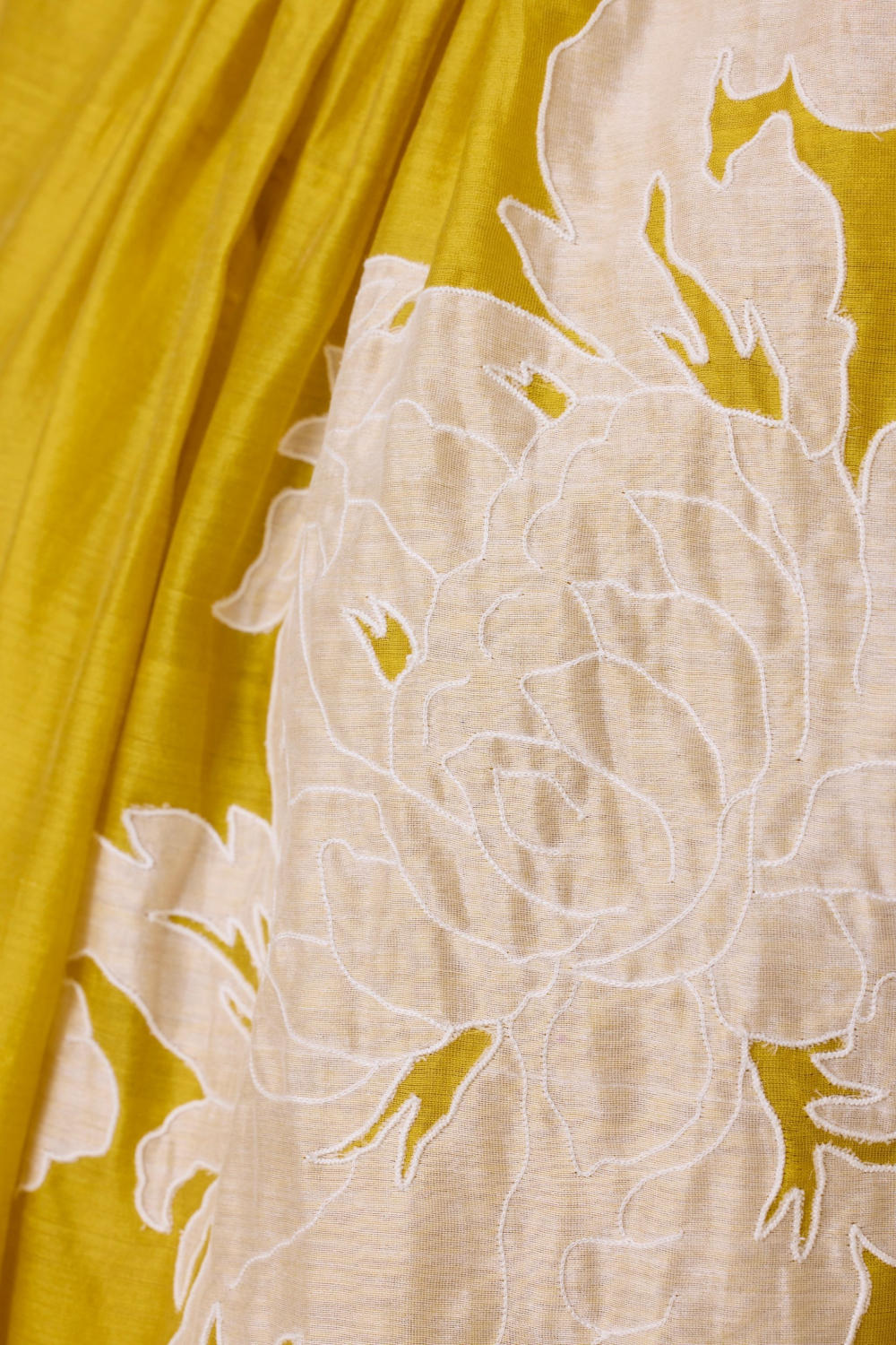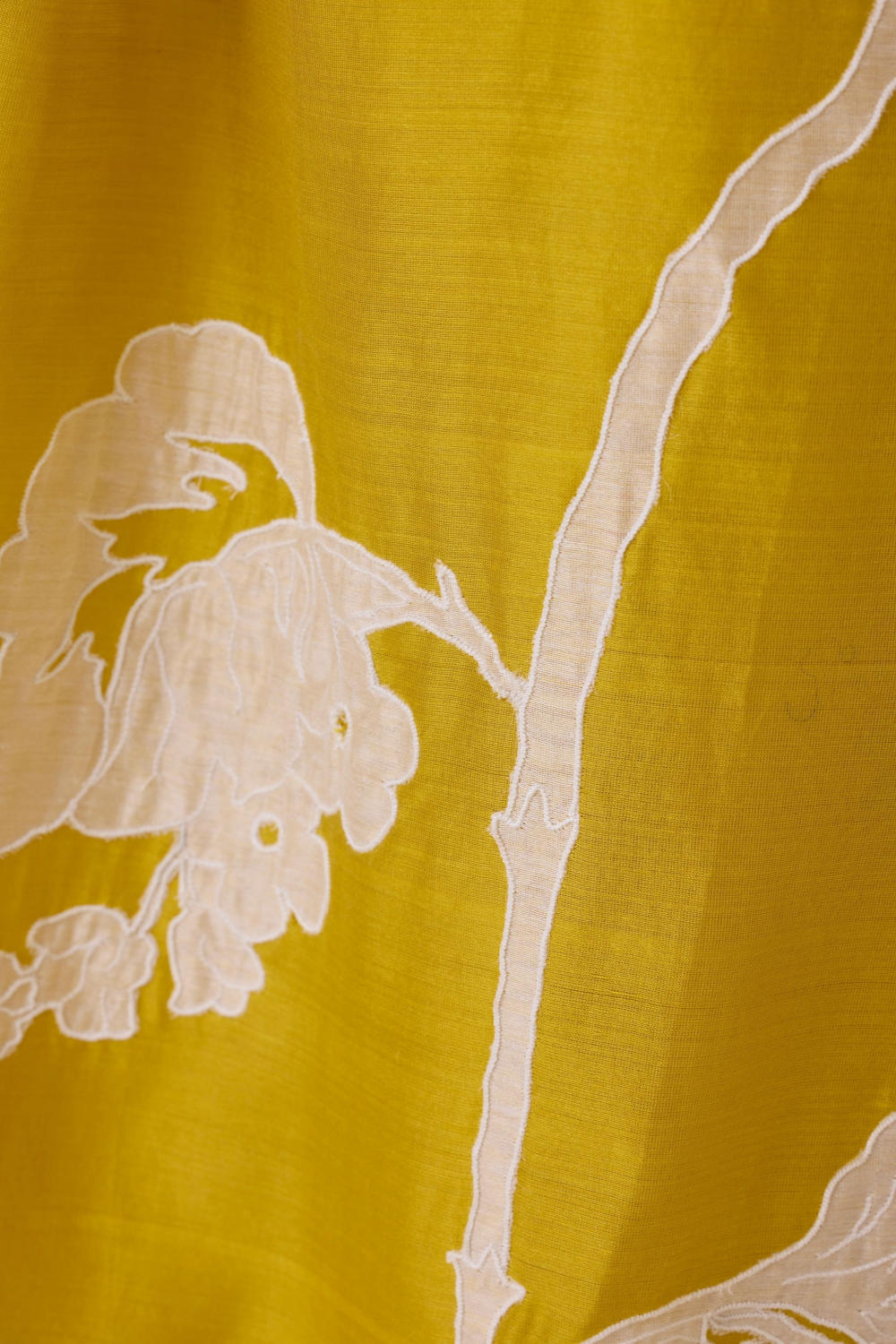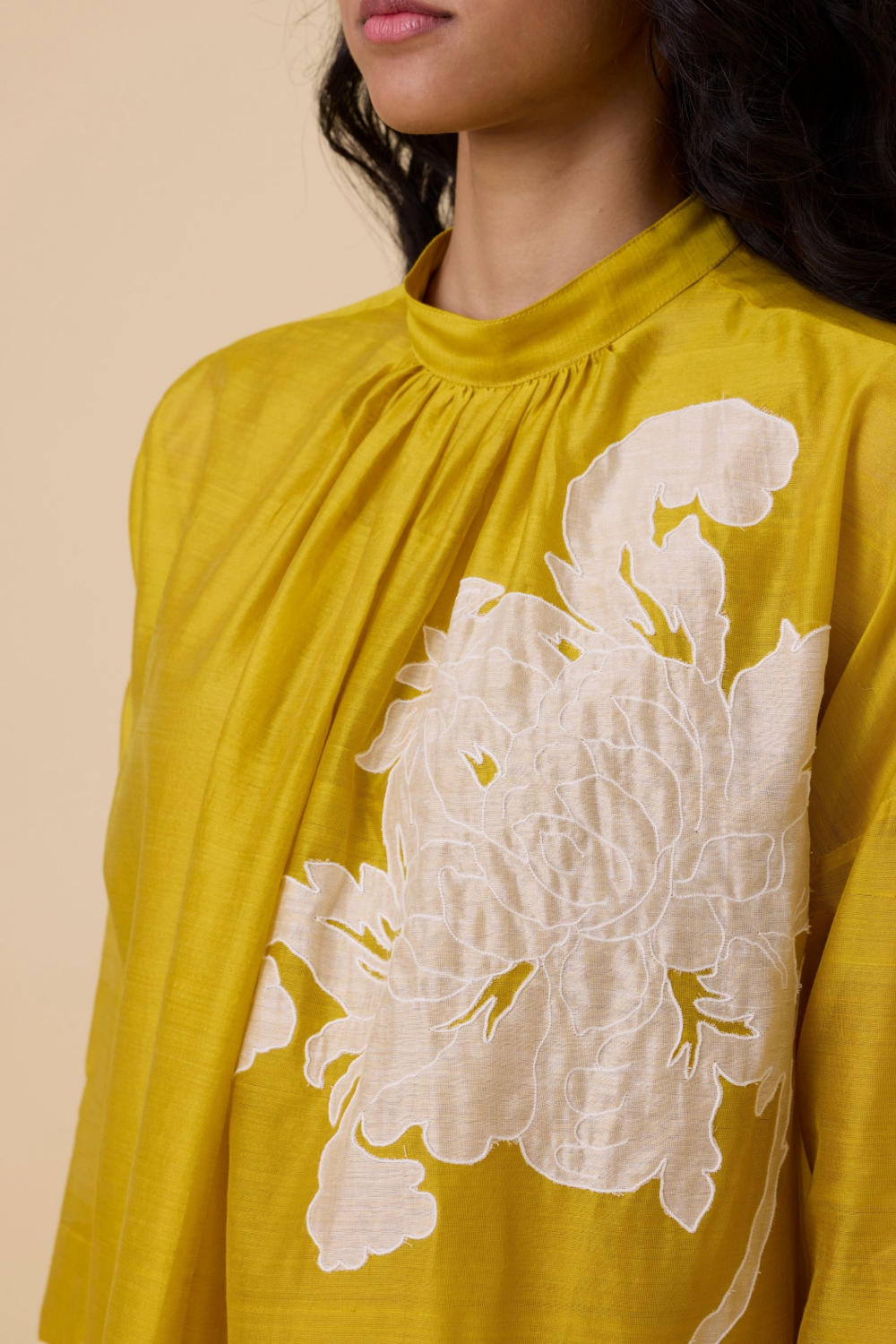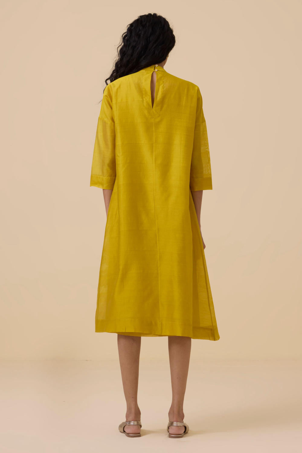 A refined dress that's perfect for special occasions. Handwoven chanderi featuring hand applique make this a modern day heirloom. Bracelet length sleeve. Soft gathers at the neck. Back button fastening. In-seam pockets. Slip included. This garment is hand embroidered in The Summer House studio. Note: Slight differences in embroidery speak to the hand processes involved.