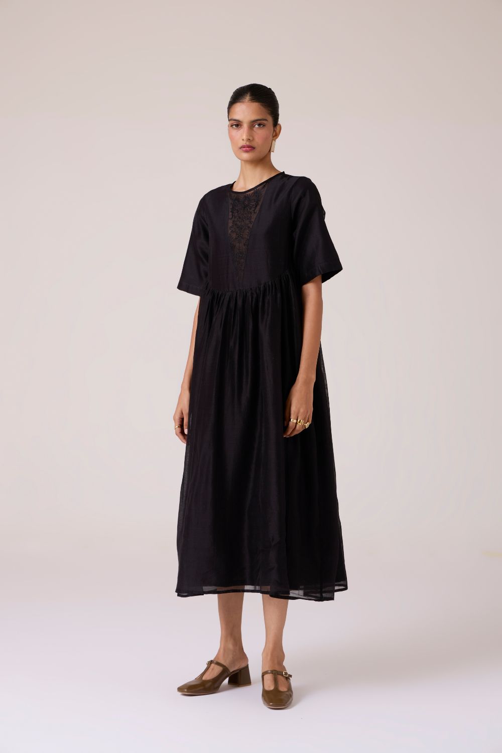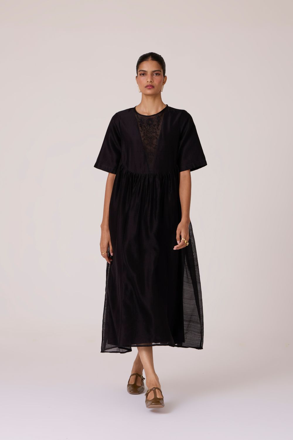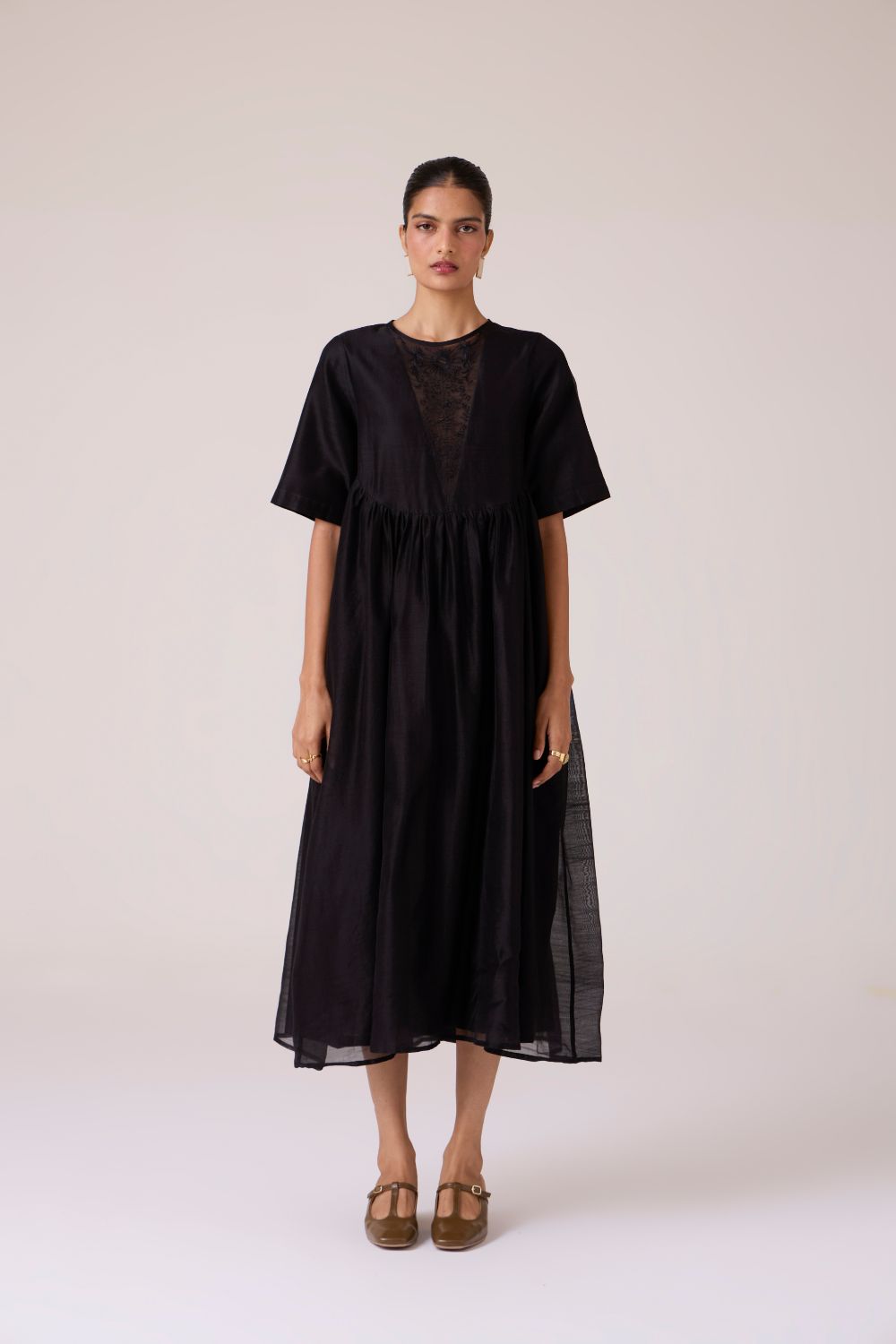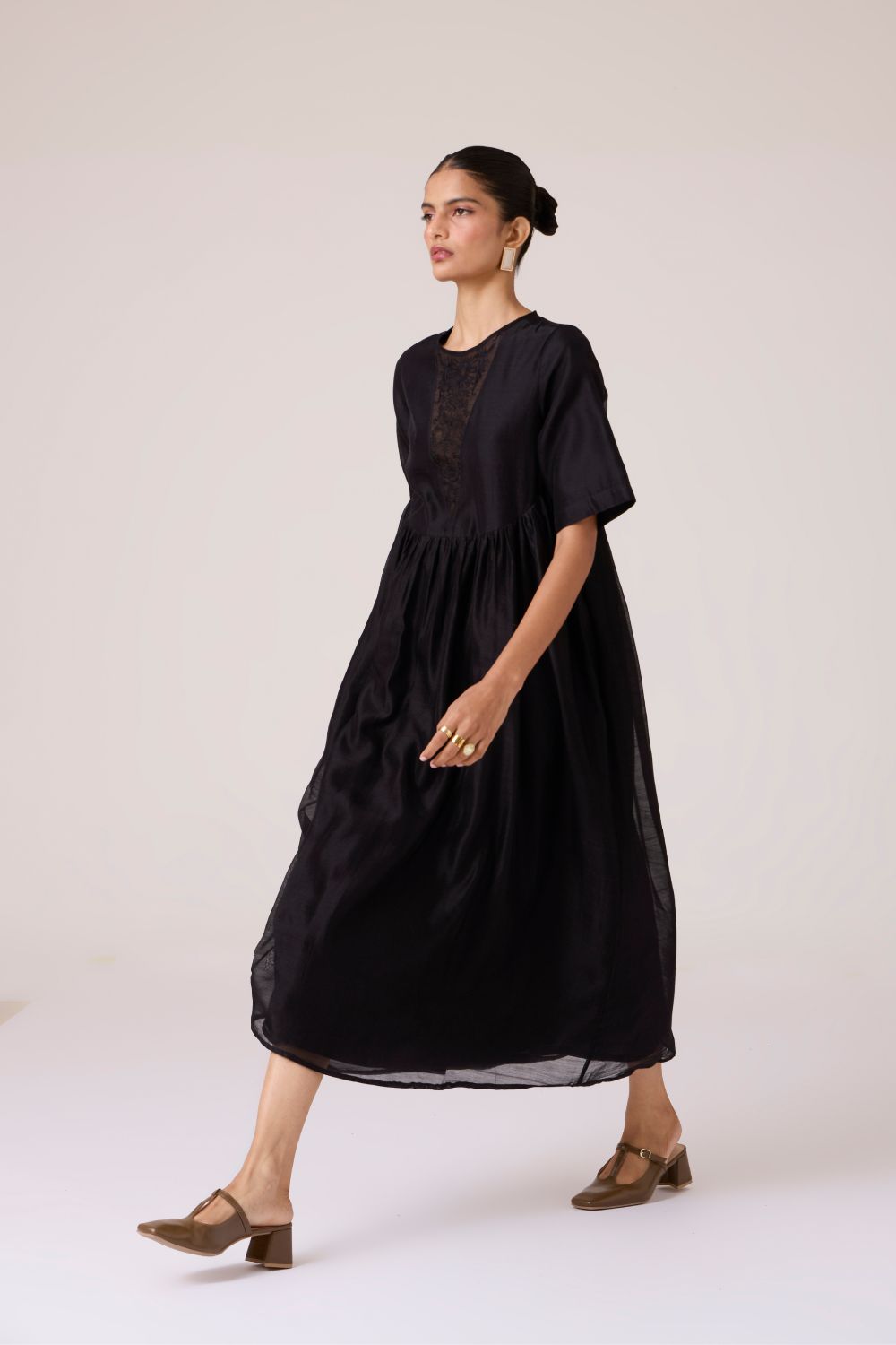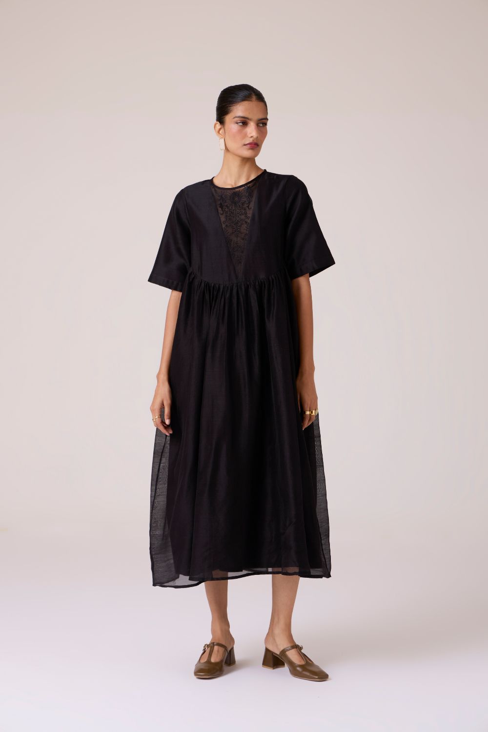 A composition of curve and flare. The embroidered neckline lends delicacy; the sweeping cut restores grandeur.