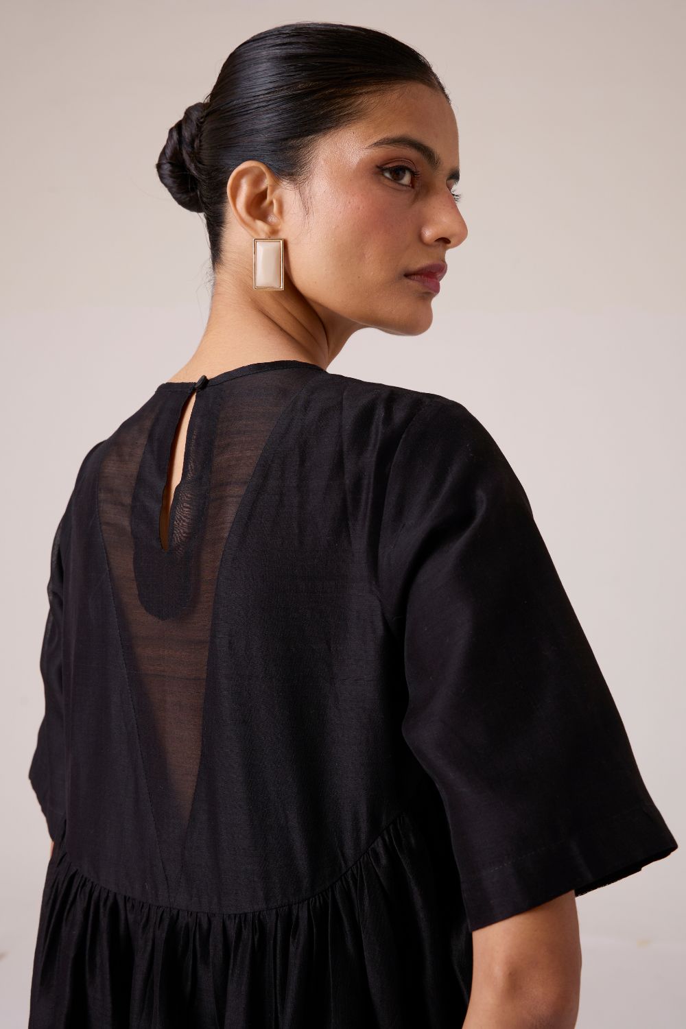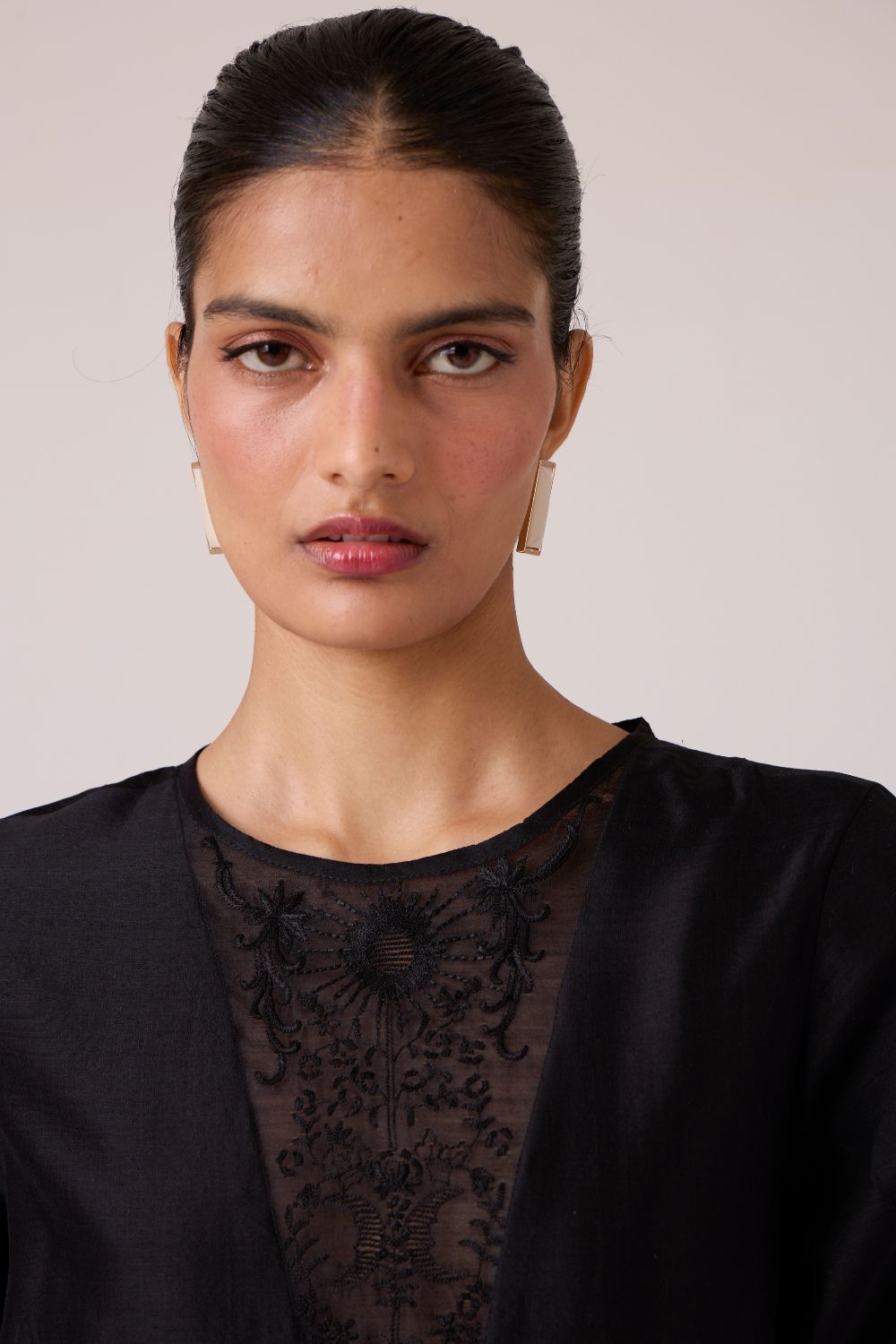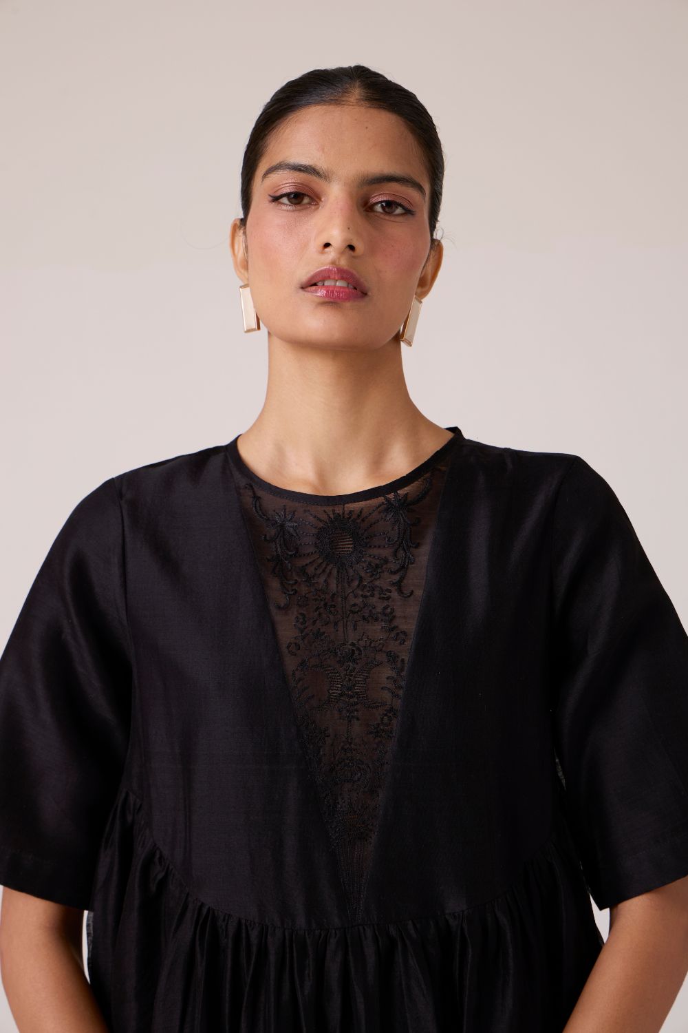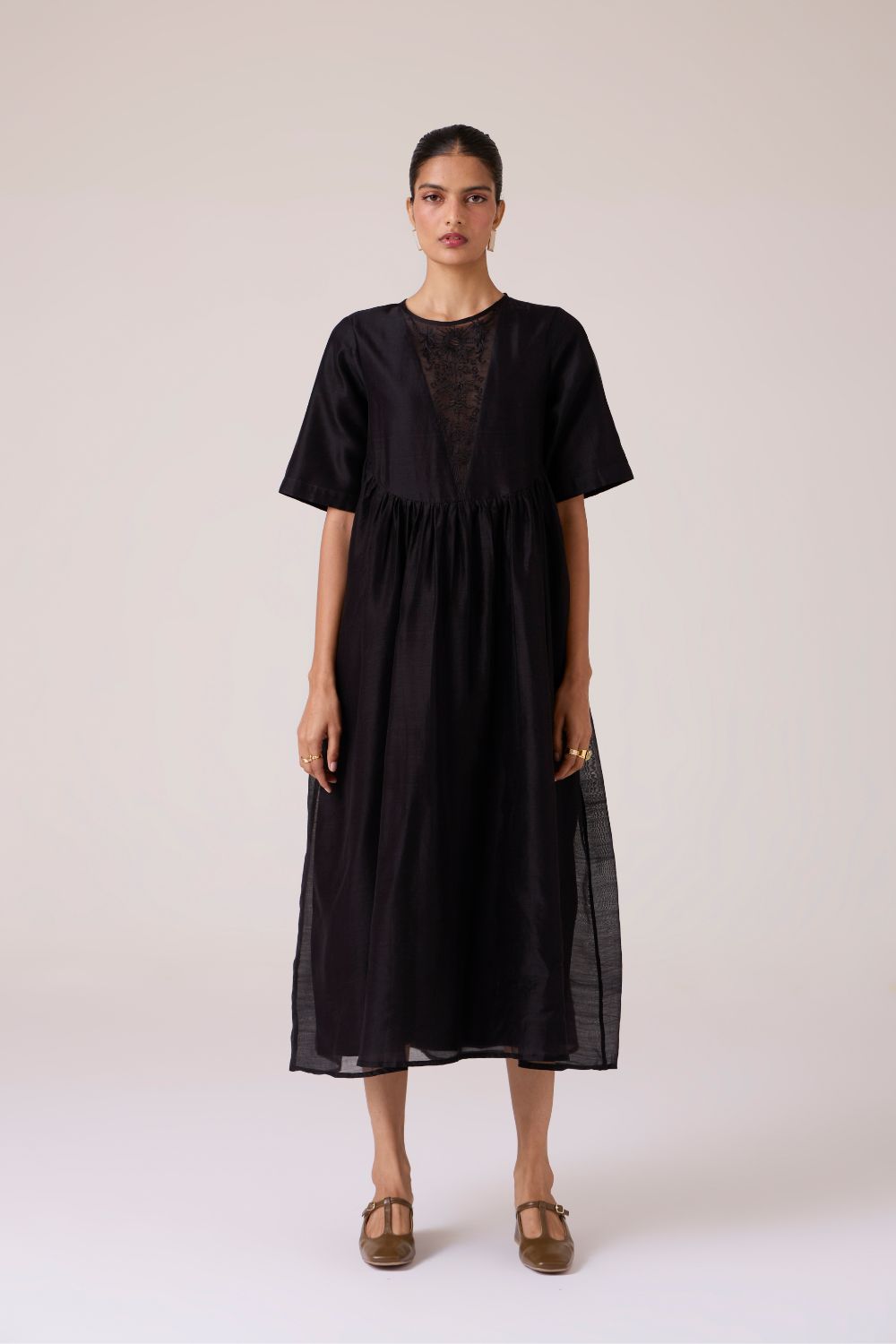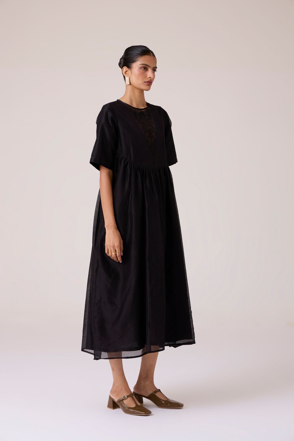 A composition of curve and flare. The embroidered neckline lends delicacy; the sweeping cut restores grandeur.