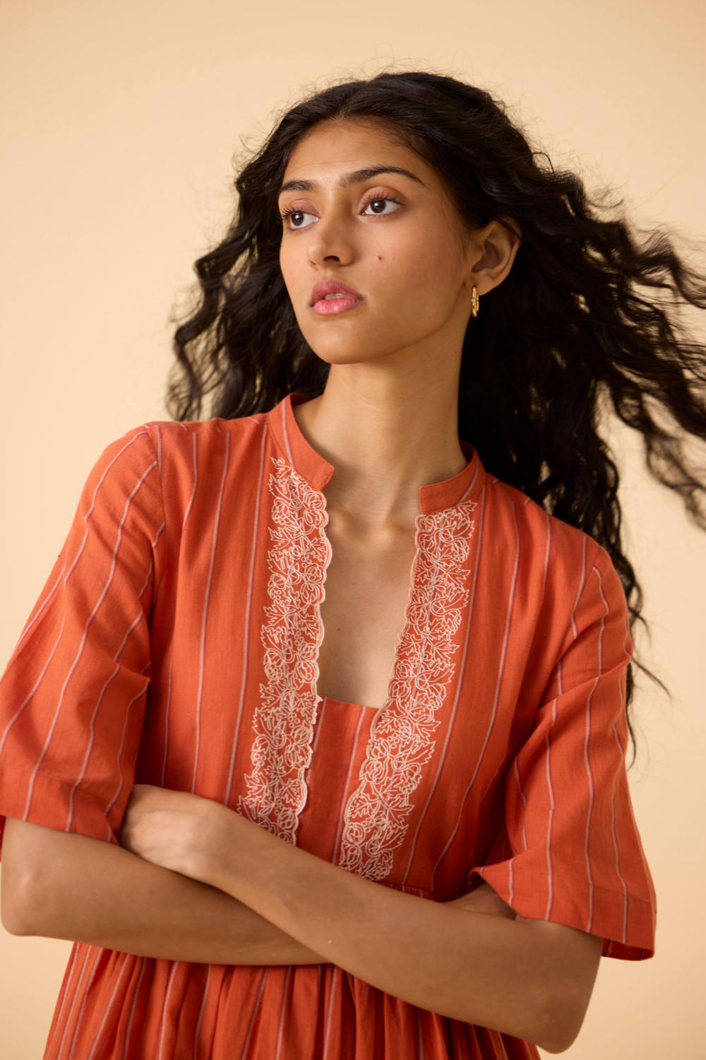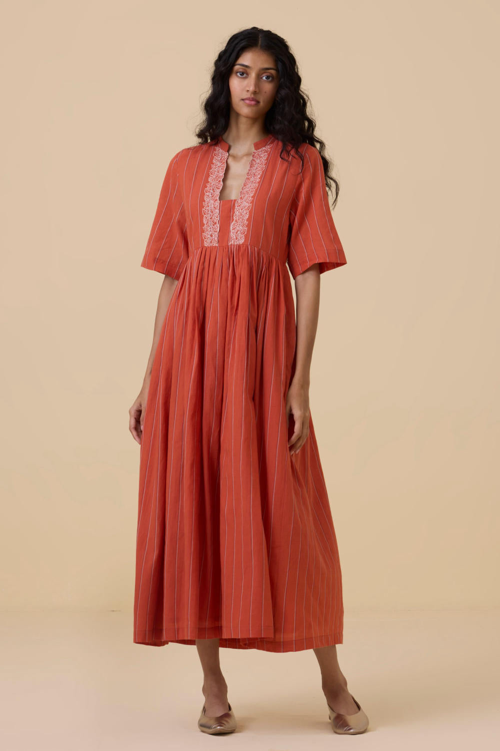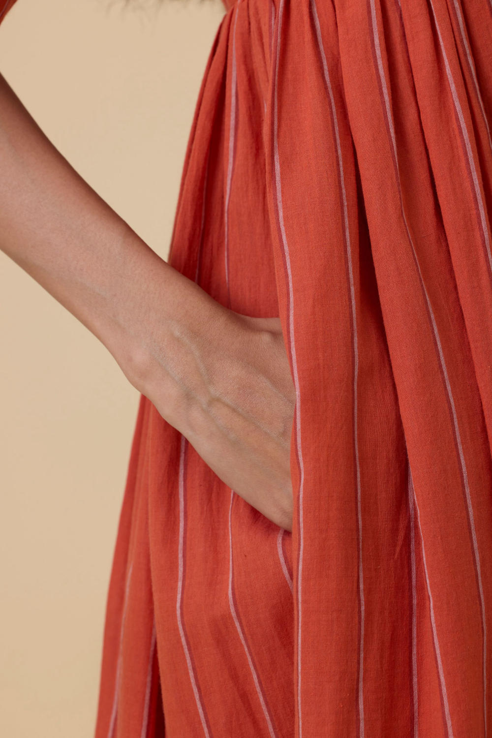 Flowy cotton dress in a deep shade of cherry. Features a plunge neckline lined with fine thread work. Elbow-length sleeves. In-seam pockets. This dress is lined waist down. This garment is embroidered by hand in The Summer House studio. Slight differences in embroidery speak to the hand processes involved.