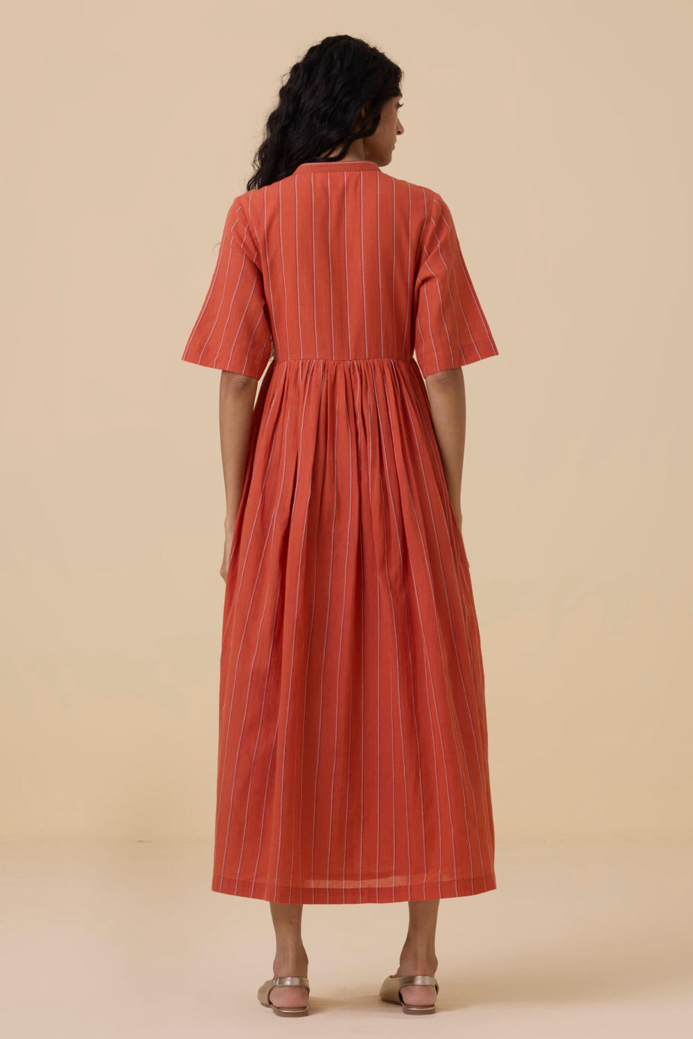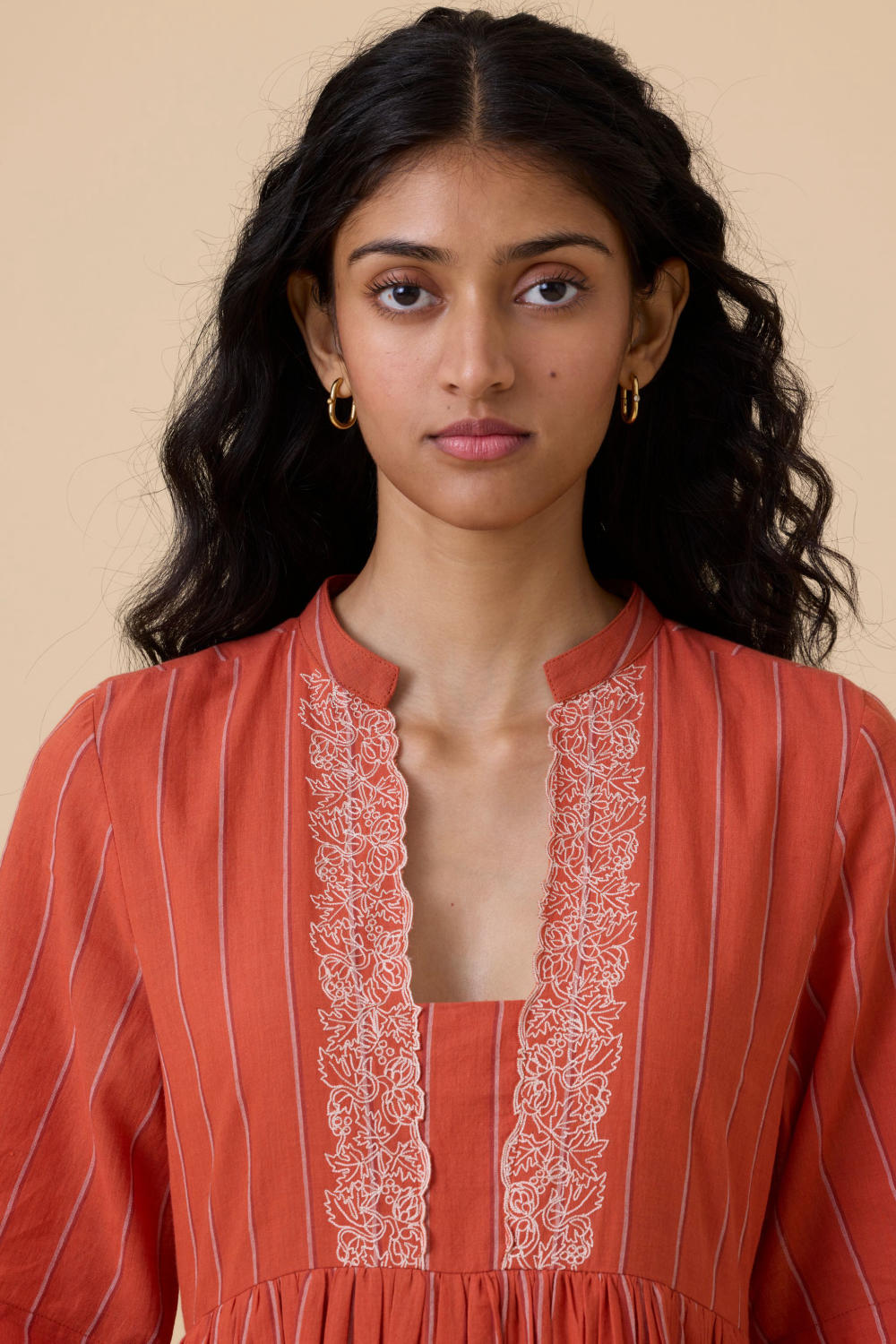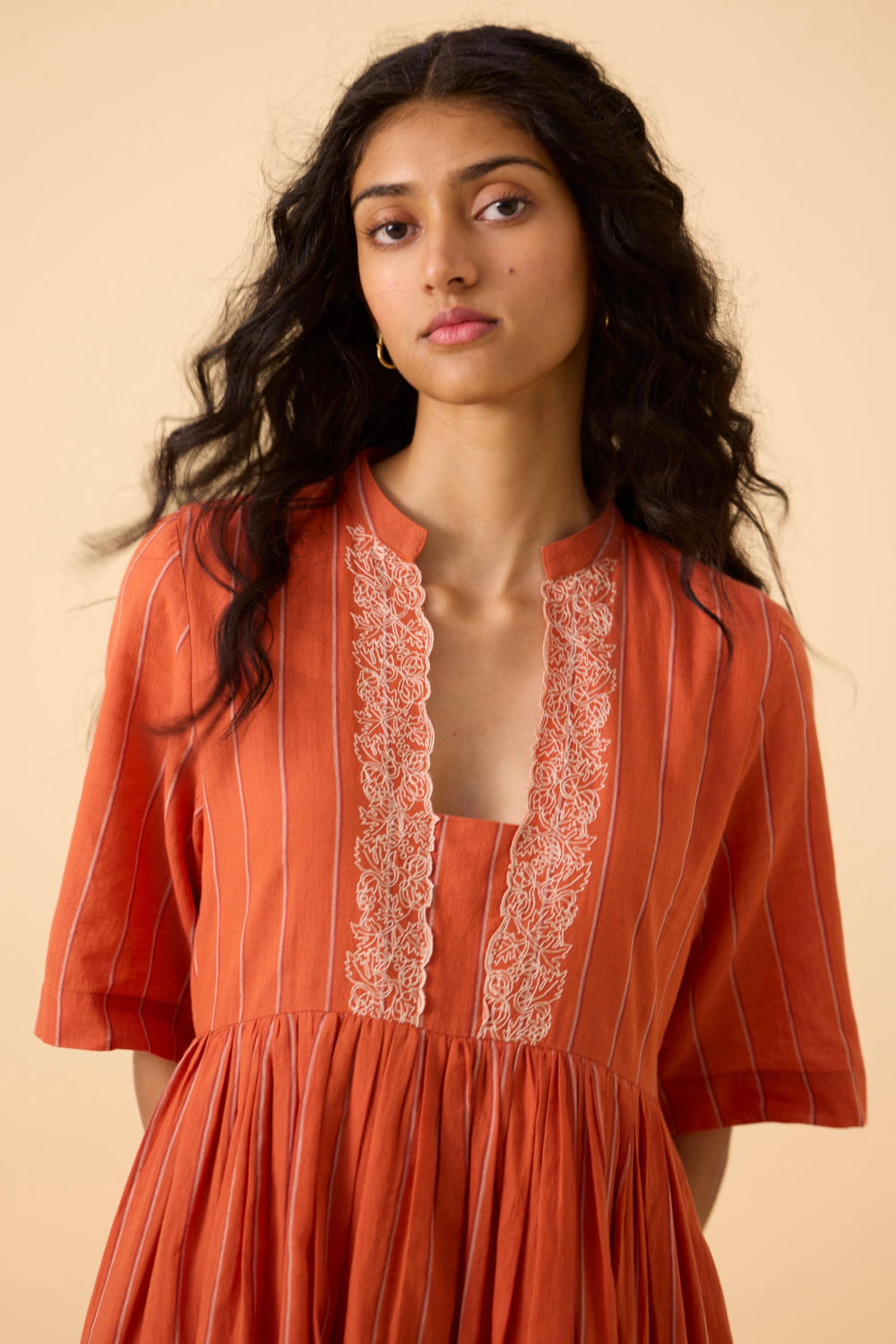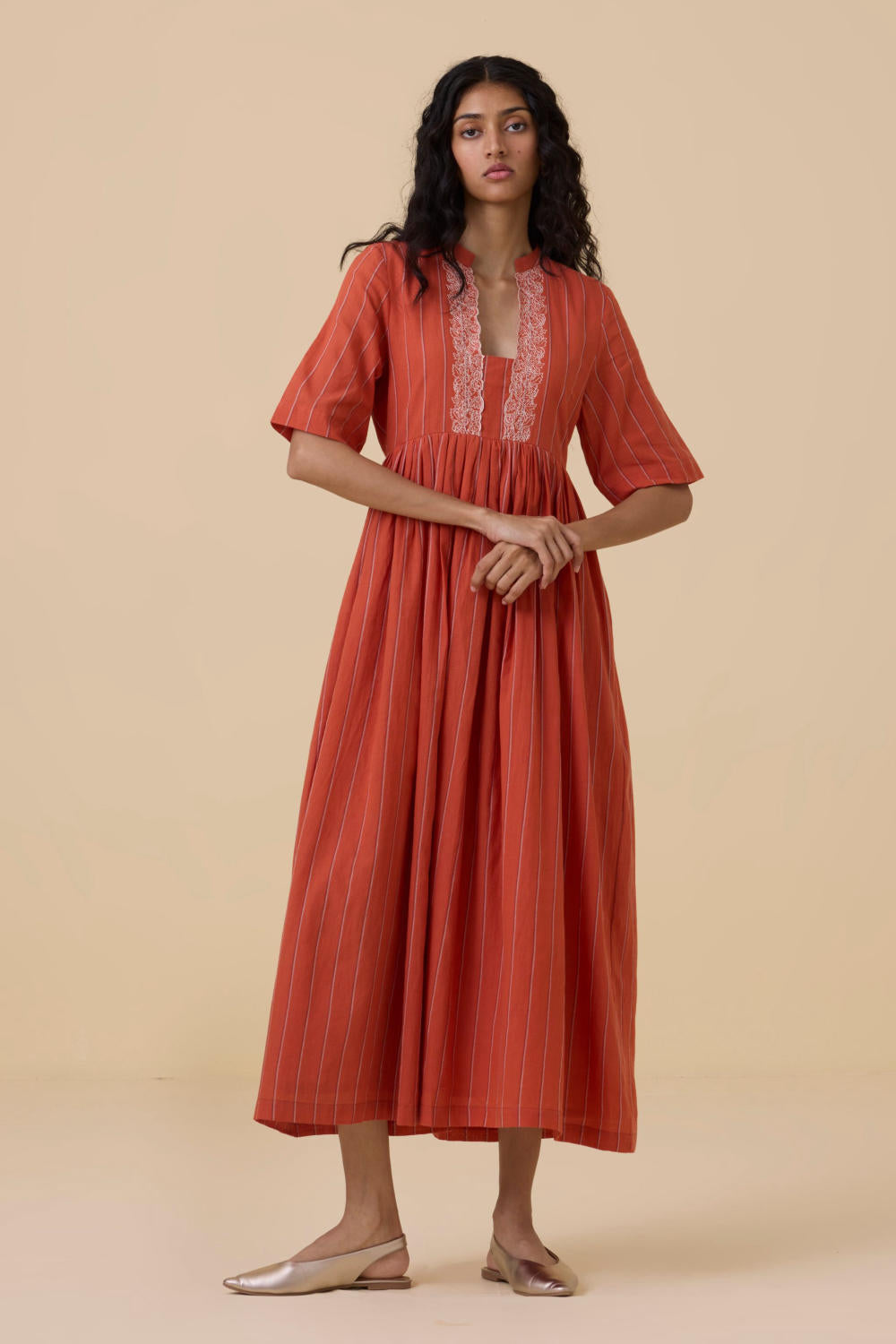 Flowy cotton dress in a deep shade of cherry. Features a plunge neckline lined with fine thread work. Elbow-length sleeves. In-seam pockets. This dress is lined waist down. This garment is embroidered by hand in The Summer House studio. Slight differences in embroidery speak to the hand processes involved.