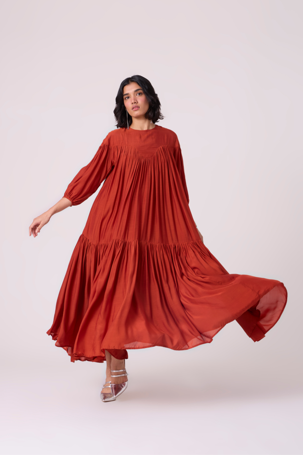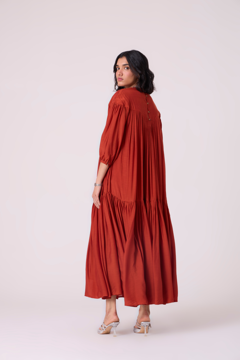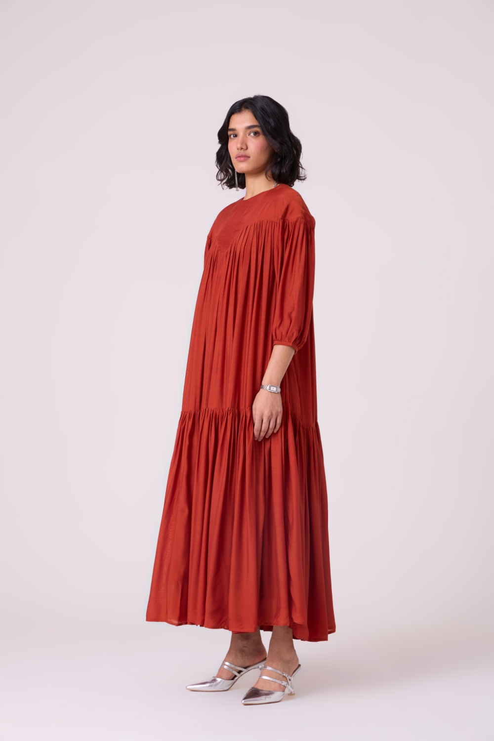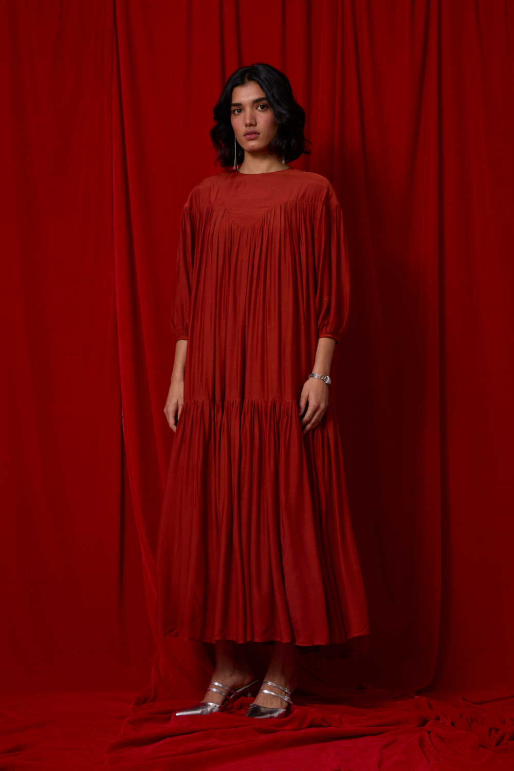 Soft tiers build graceful volume through the length, while gathered sleeves lend a touch of movement at the arms. A piece that holds presence gently. Wear it with a belt to accentuate the waist, though it is perfect as is too.