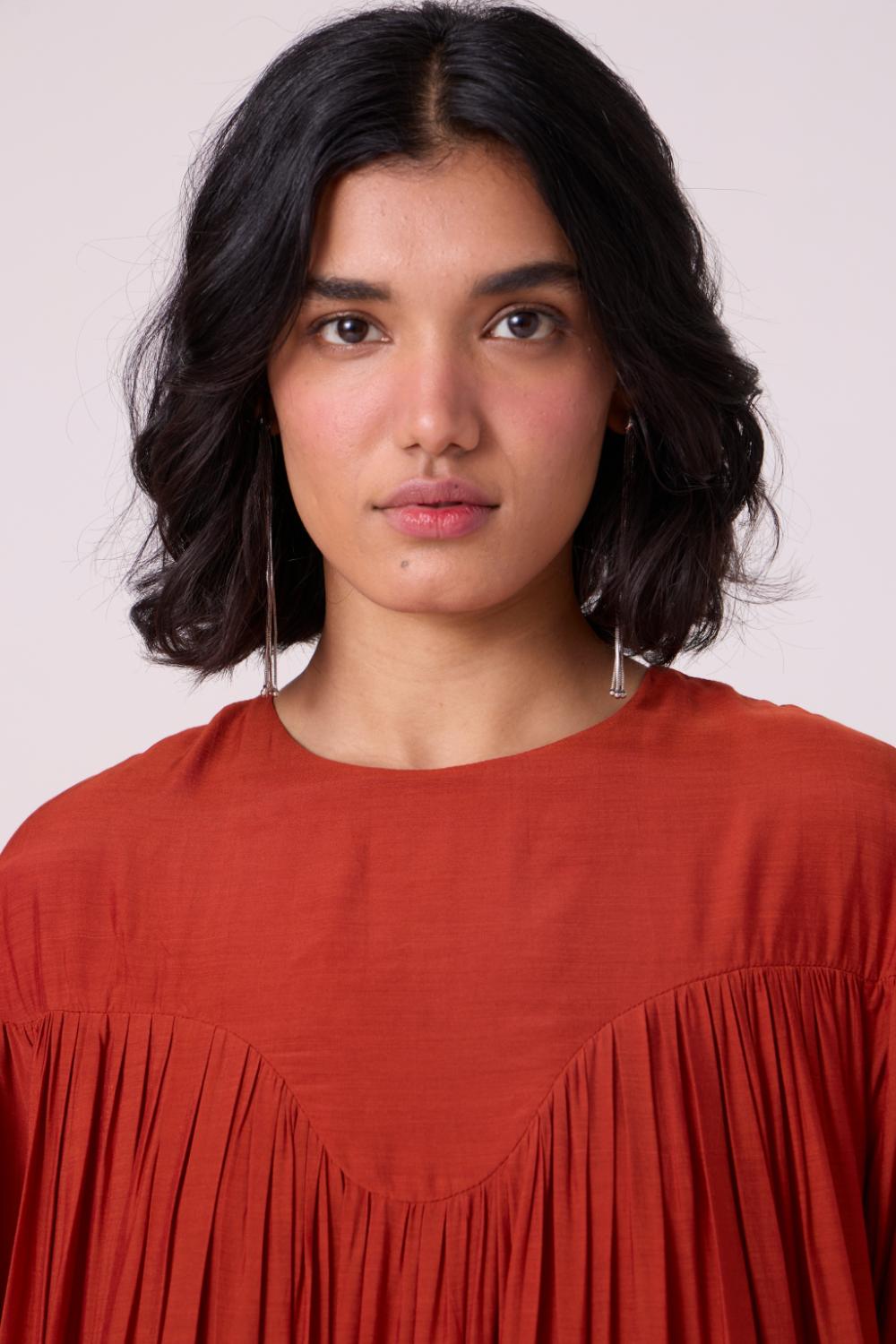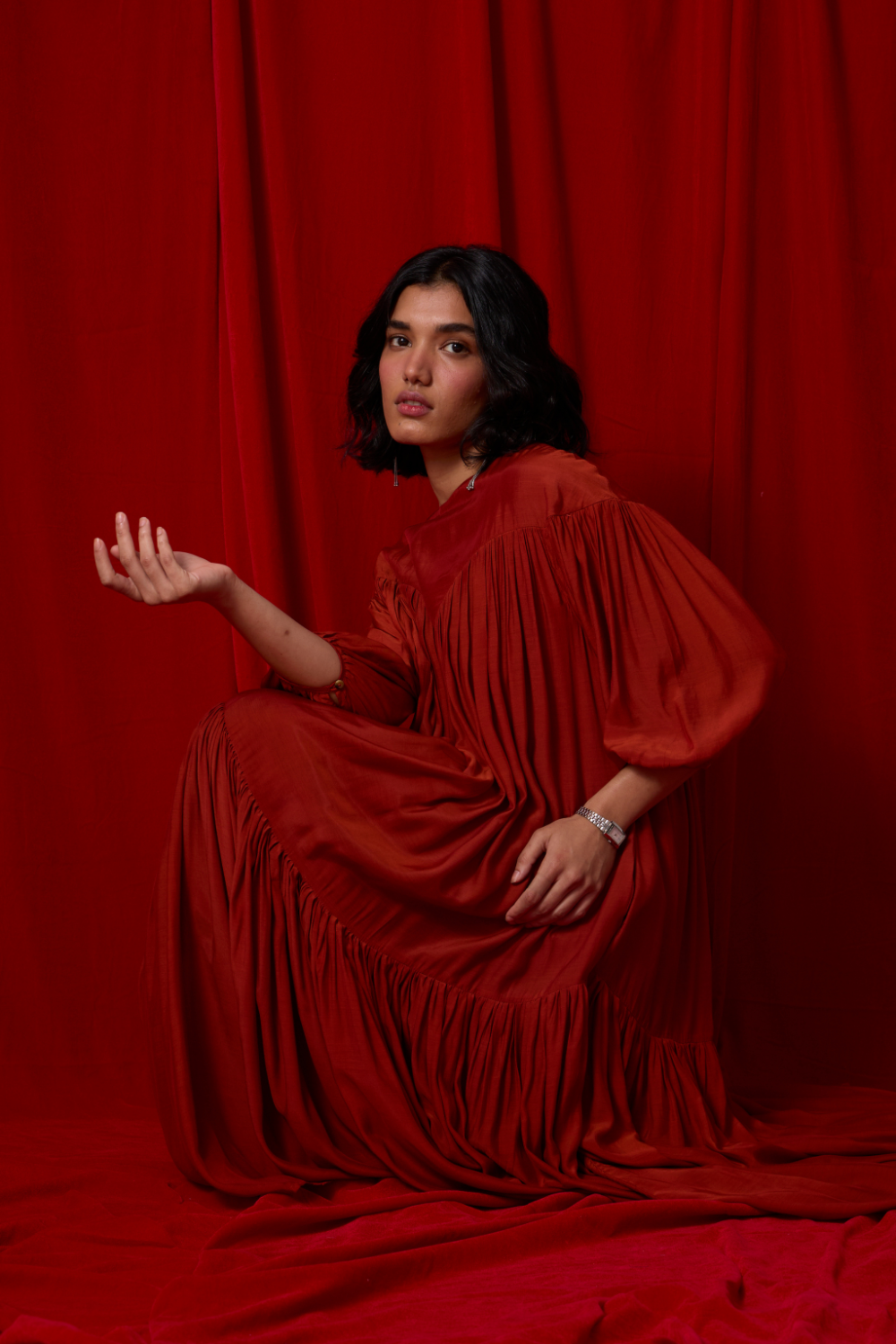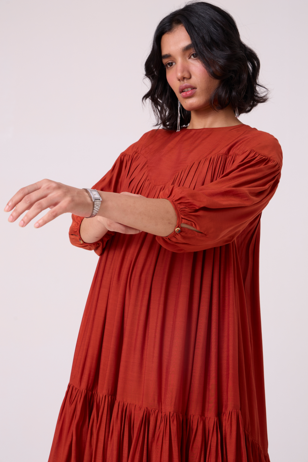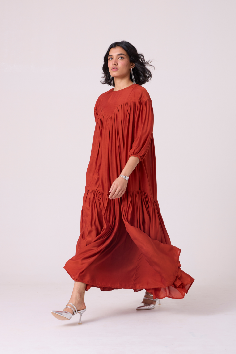 Soft tiers build graceful volume through the length, while gathered sleeves lend a touch of movement at the arms. A piece that holds presence gently. Wear it with a belt to accentuate the waist, though it is perfect as is too.