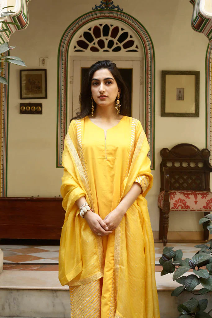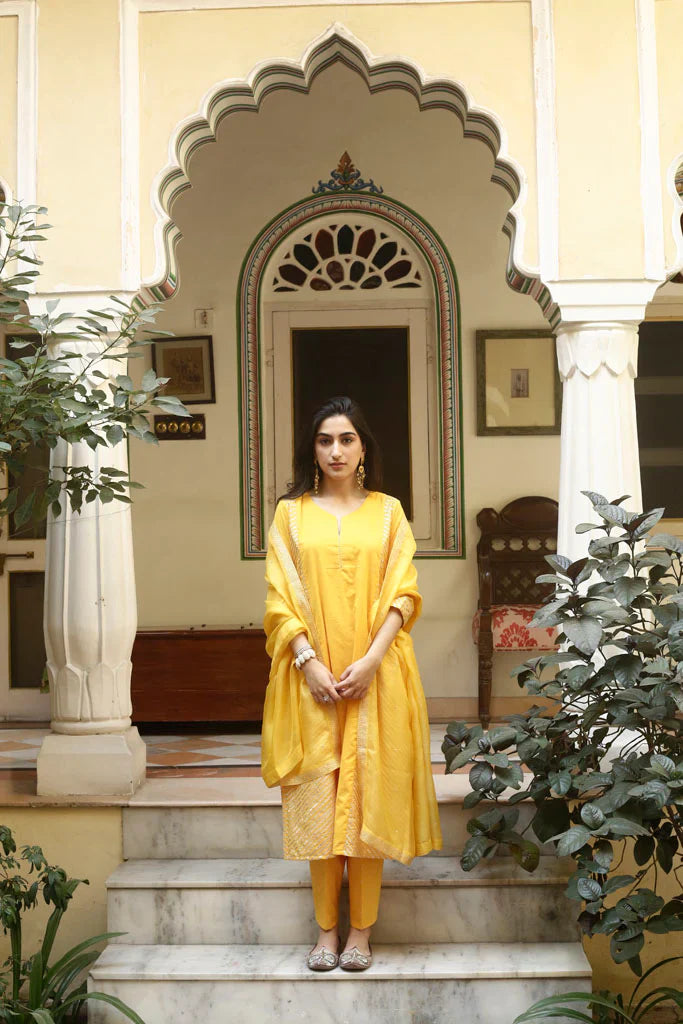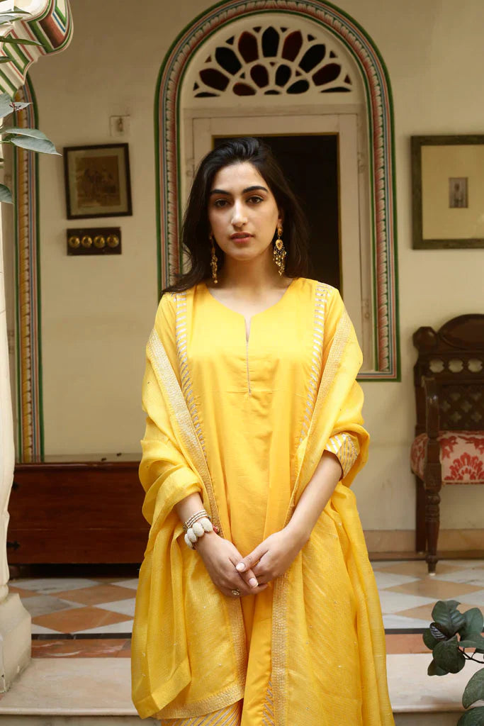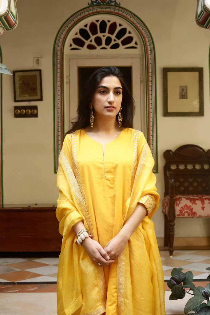 A-line kurta with gold gota panels on the sides, paired with an old fashioned sitara embroidered narrow salwar, both in cotton mul. Set is paired with a hand embroidered handspun Kota silk dupatta with embroidered Mysore jaali in gold taar and sitara.