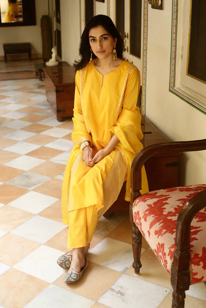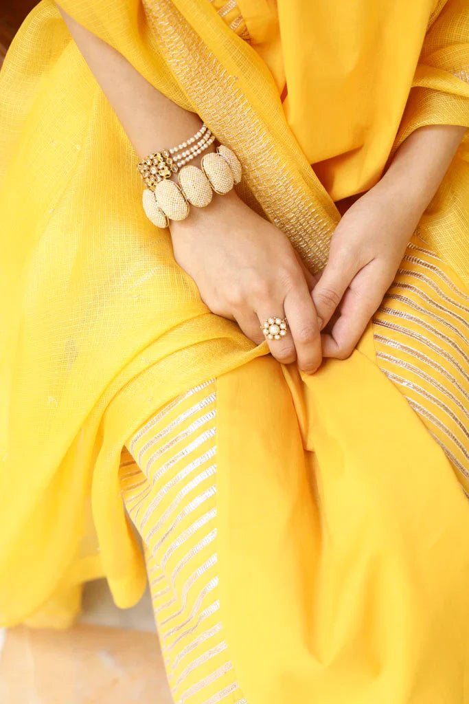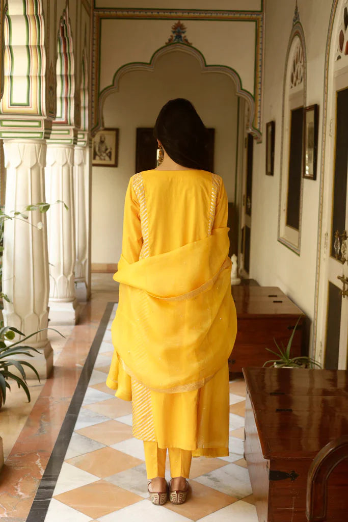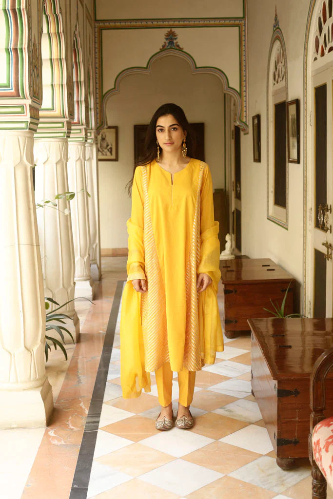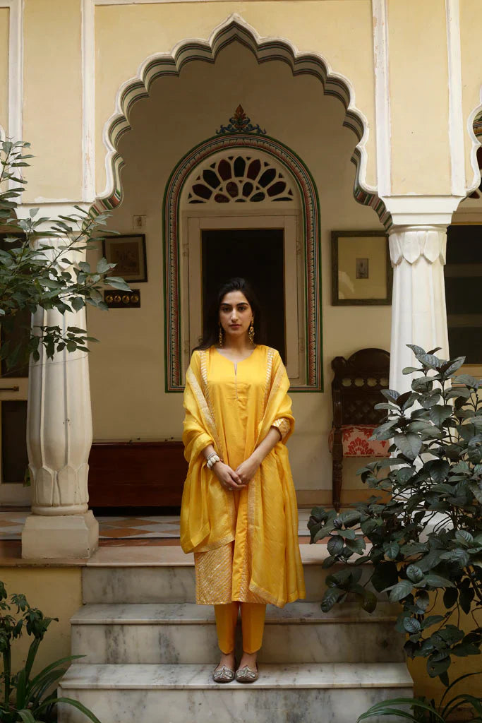 A-line kurta with gold gota panels on the sides, paired with an old fashioned sitara embroidered narrow salwar, both in cotton mul. Set is paired with a hand embroidered handspun Kota silk dupatta with embroidered Mysore jaali in gold taar and sitara.