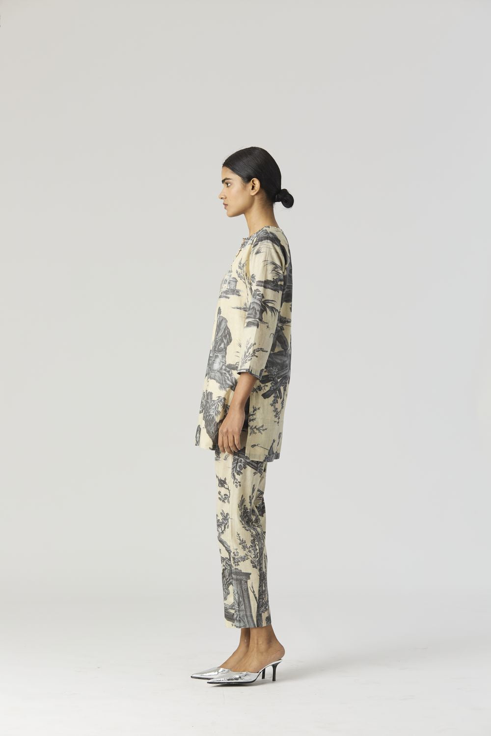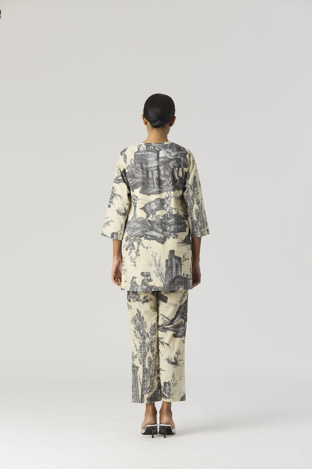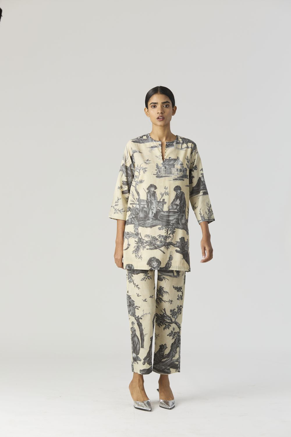 A slim short cotton kurta with a slight V neckline and three-quarter sleeves. It is crafted in a print inspired by Toile de Jouy design depicting Roman monuments , also with figures dancing and gathered around a shrine. The kurta has threadwork on the neckline and sleeve edges.