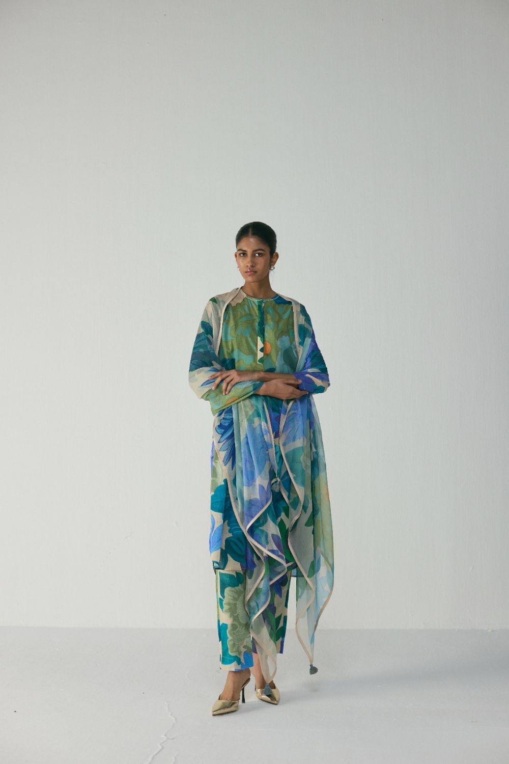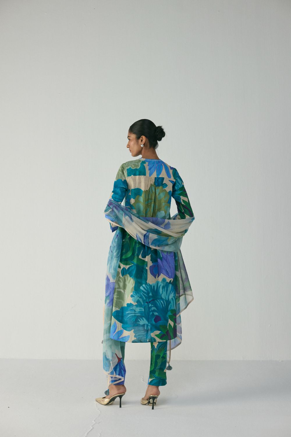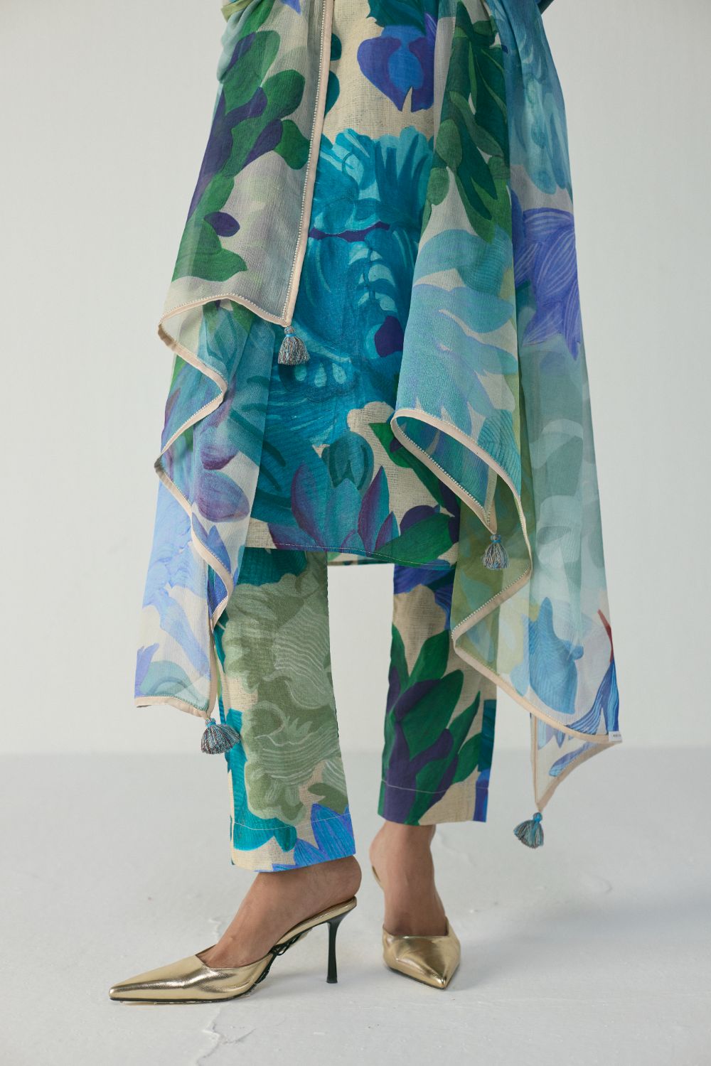 This elegant kurta set brings together effortless comfort and contemporary botanical artistry. Designed in a relaxed straight silhouette, the kurta features a clean round neckline with a front placket, full sleeves, and a fluid drape that flatters all body types. Paired with matching printed trousers and a lightweight, sheer dupatta, this ensemble creates a coordinated look with beautiful movement and sophistication. Crafted from breathable, soft fabric, it is ideal for daytime dressing, relaxed festive wear, or elevated casual outings.