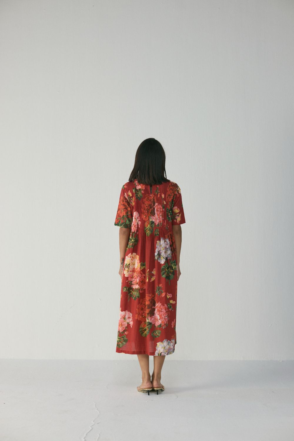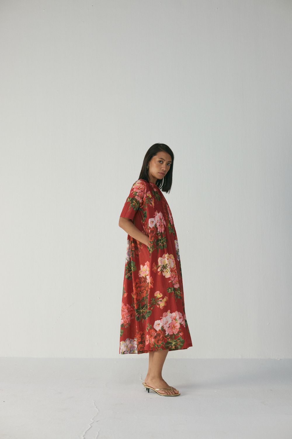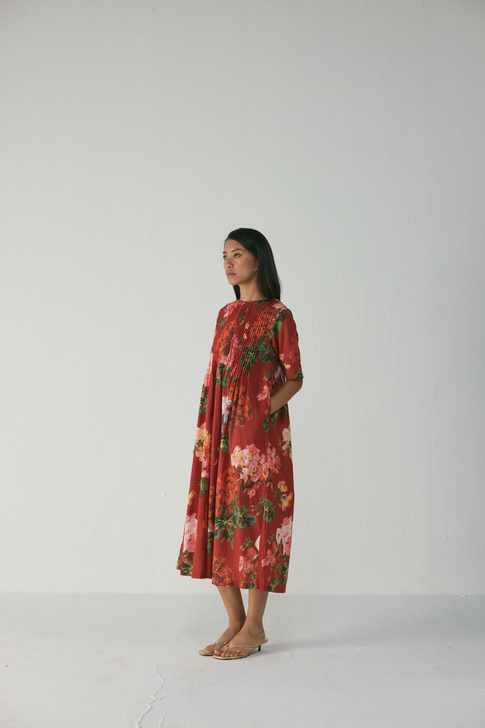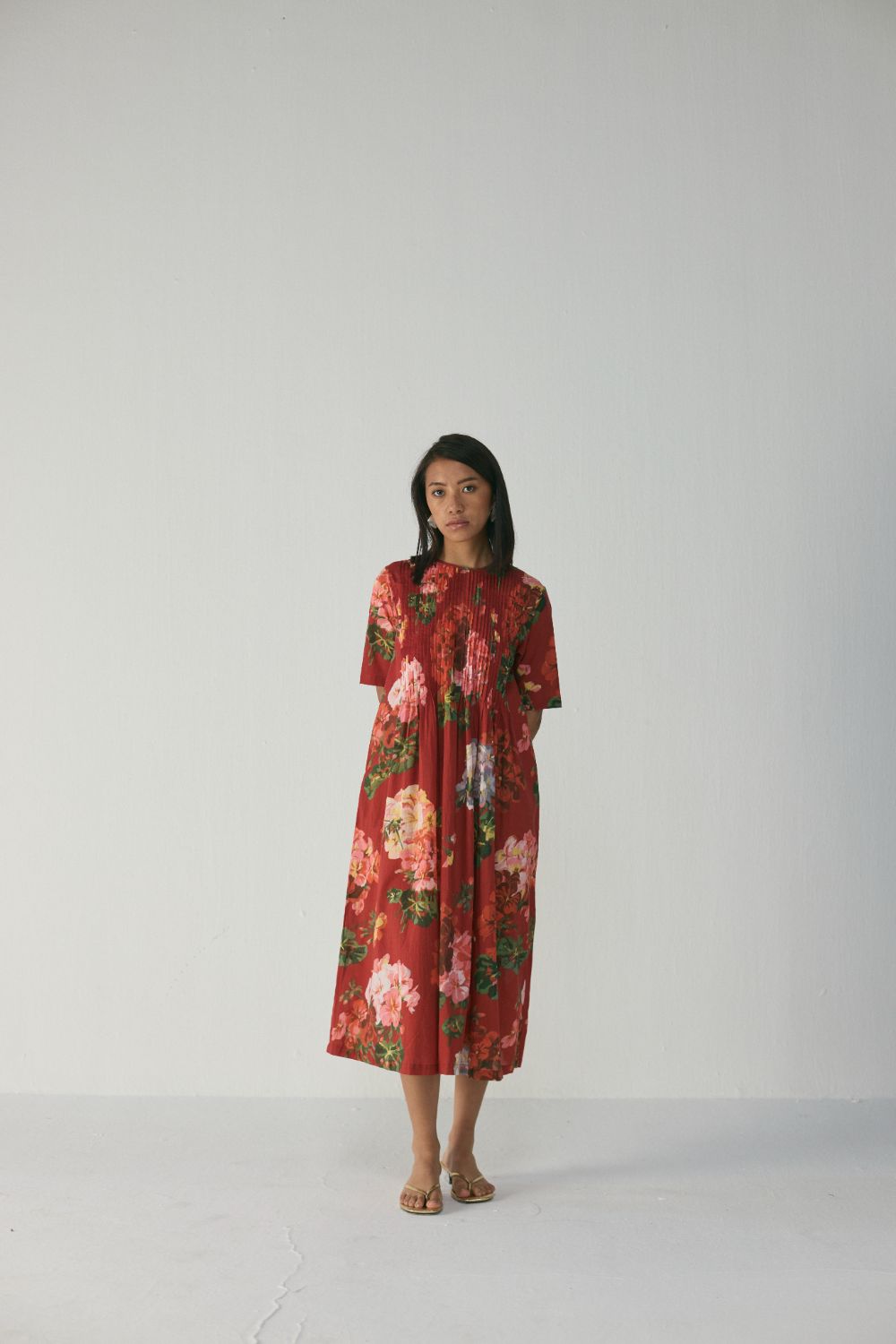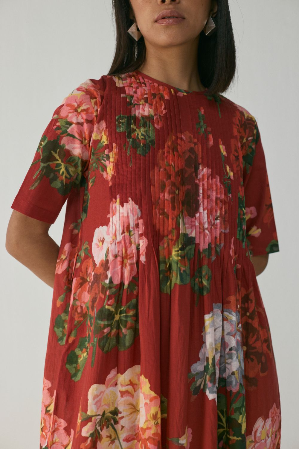 The dress features a striking floral print in rich, painterly blooms spread across a deep crimson-red background. Shades of coral, blush pink, lilac, and soft green blend harmoniously, creating a romantic, garden-inspired look. The large floral motifs are thoughtfully placed, giving the pattern a balanced and elegant flow across the silhouette. This is a flowy, midi-length A-line dress crafted for effortless comfort and understated sophistication. The dress has a round neckline, short sleeves, and a beautifully textured pin-tucked bodice that adds subtle structure before opening into a relaxed, voluminous skirt. Designed to offer ease of movement while maintaining a refined presence, the dress is perfect for daytime outings, casual celebrations, vacations, or relaxed evening gatherings.