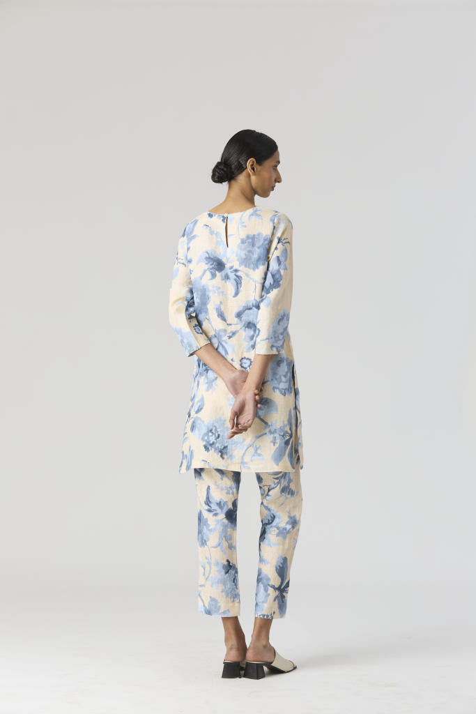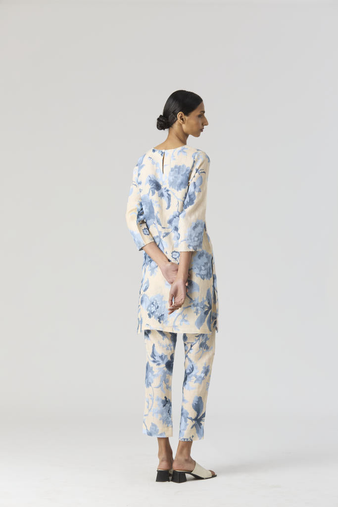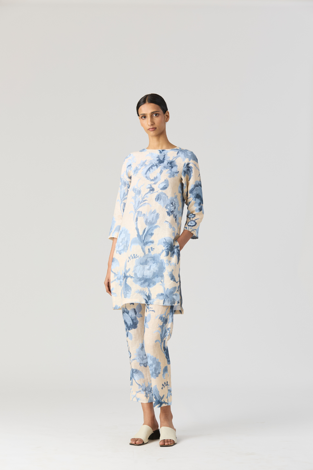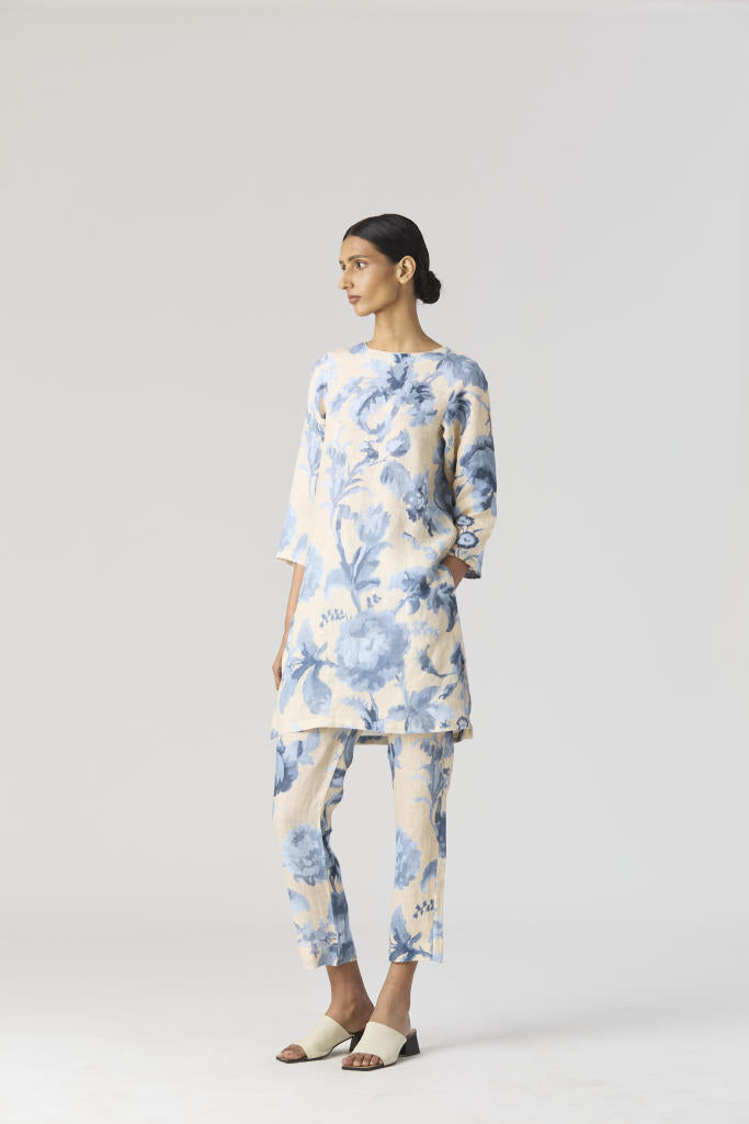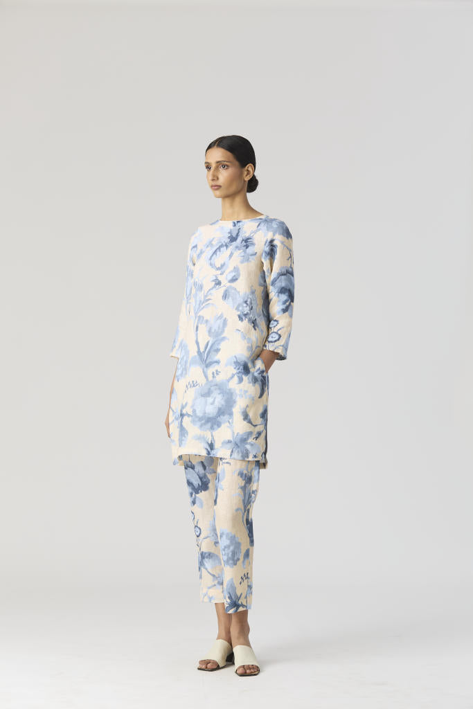 Juno Linen Kurta Set, meticulously crafted to embody elegance and charm. Inspired by the delicate beauty of floral leaves, the print gracefully adorns the off-white background, creating a subtle yet enchanting allure. The kurta features a timeless boat neck neckline, accentuated with intricate beadwork along the neckline and sleeves, adding a touch of sophistication to the ensemble. The back slit, embellished with buttons, enhances the graceful silhouette of the kurta. The set includes a Kurta and pants. Model is wearing a size small and height is 5'9