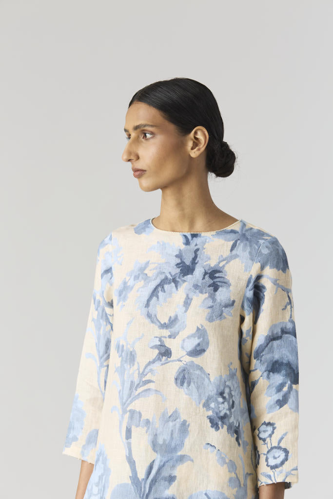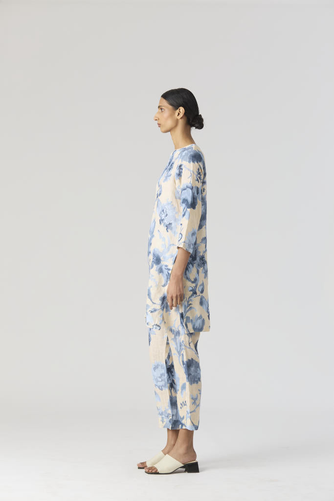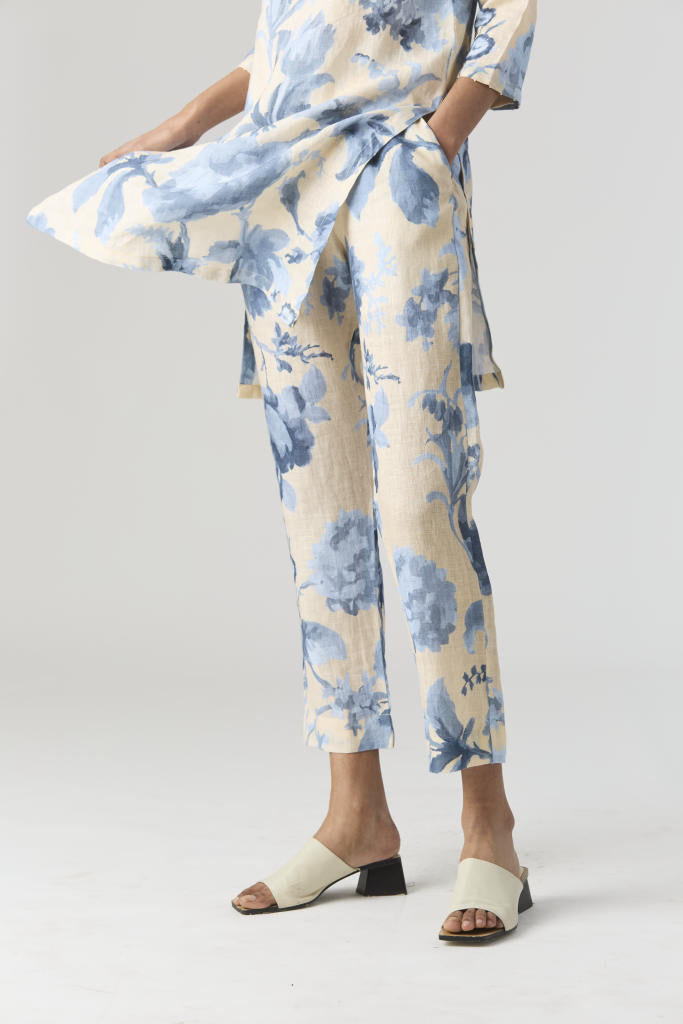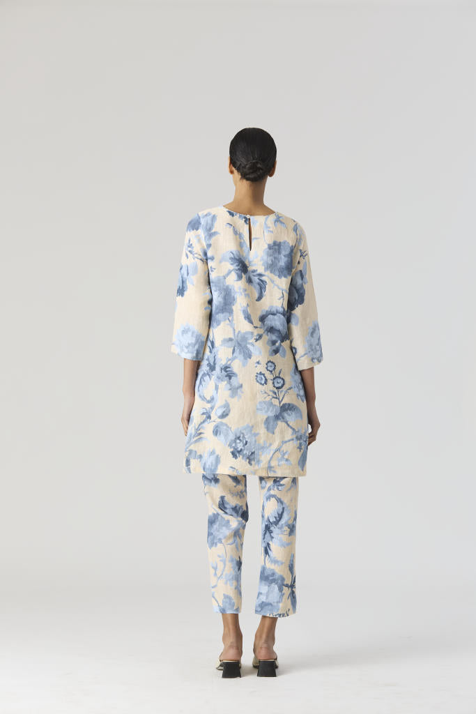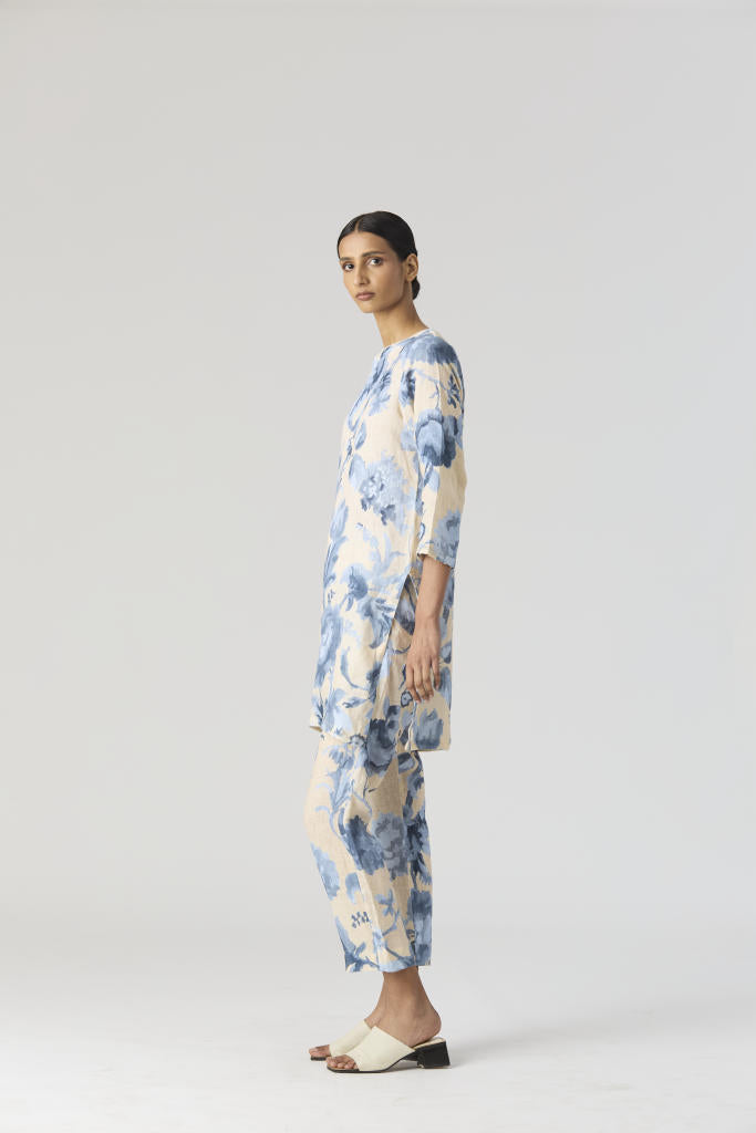 Juno Linen Kurta Set, meticulously crafted to embody elegance and charm. Inspired by the delicate beauty of floral leaves, the print gracefully adorns the off-white background, creating a subtle yet enchanting allure. The kurta features a timeless boat neck neckline, accentuated with intricate beadwork along the neckline and sleeves, adding a touch of sophistication to the ensemble. The back slit, embellished with buttons, enhances the graceful silhouette of the kurta. The set includes a Kurta and pants. Model is wearing a size small and height is 5'9