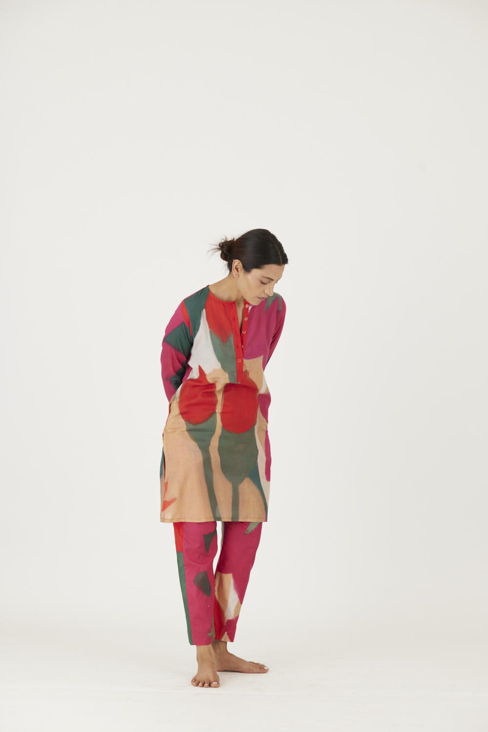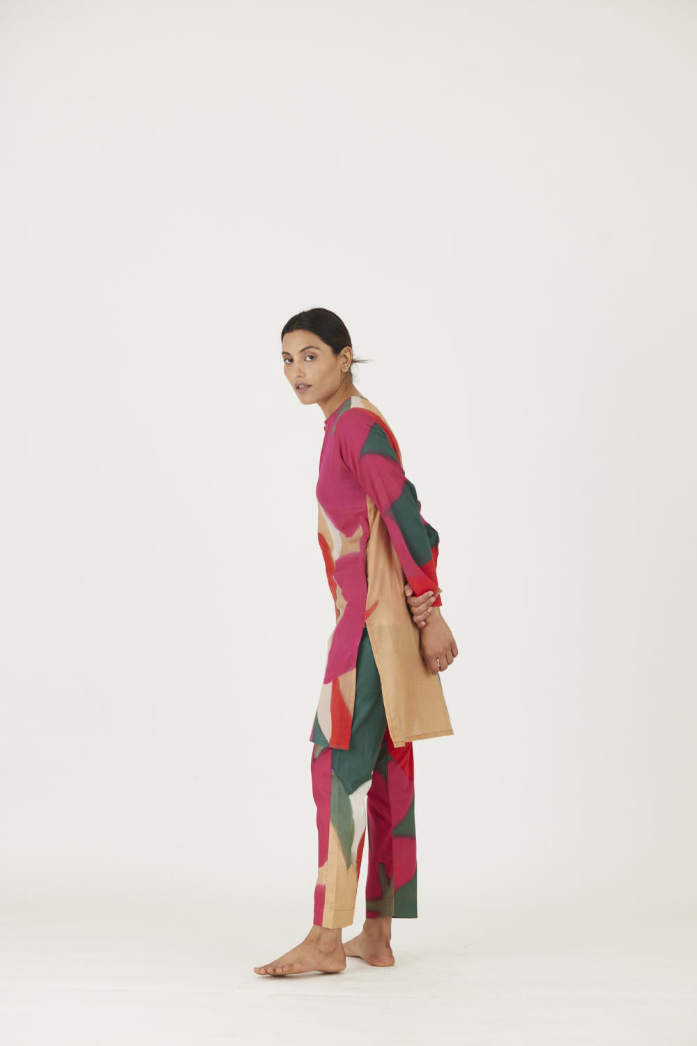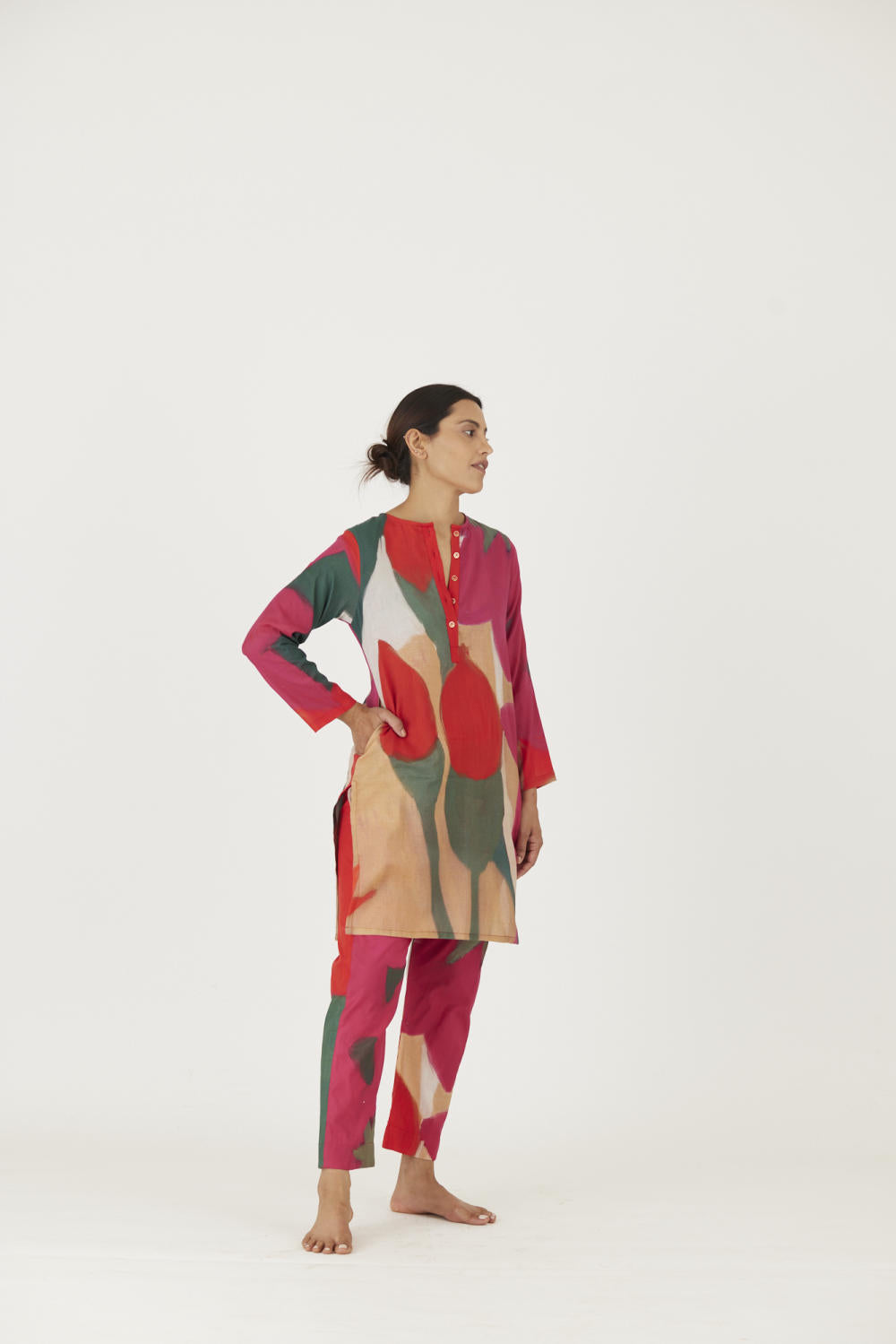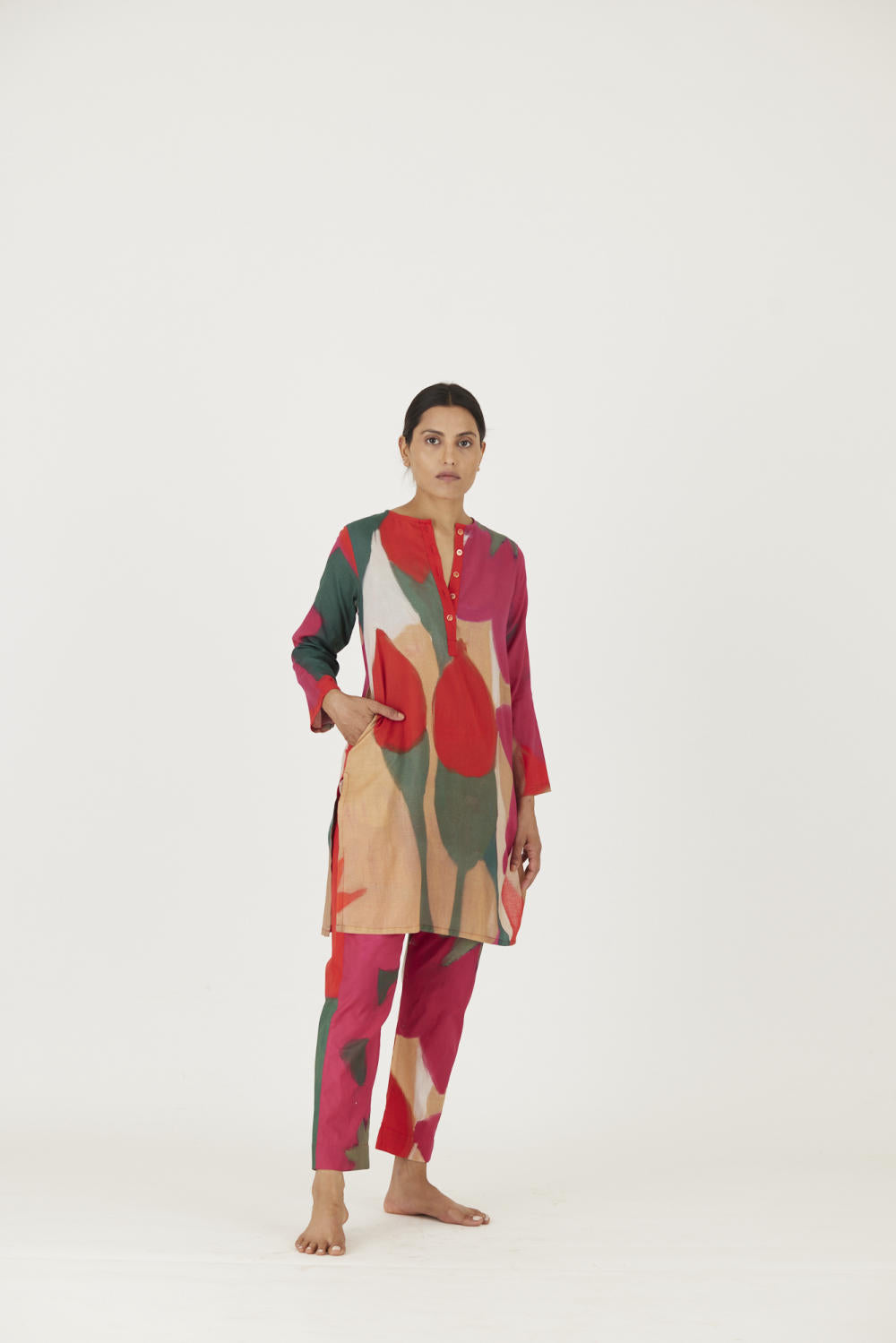 The print is inspired by a rosebud and features a bouquet of flowers and buds in a unique arrangement. The kurta features a 2" kurta patti and threadwork on the neckline. The kurta is crafted in cotton twill and comes with complimenting pants.