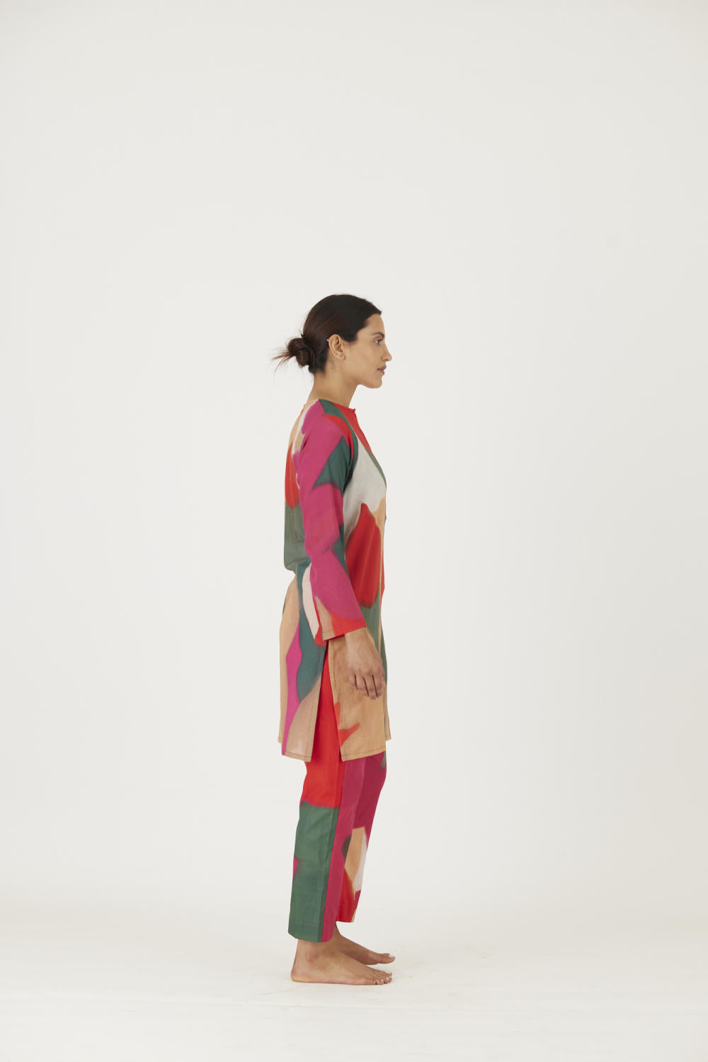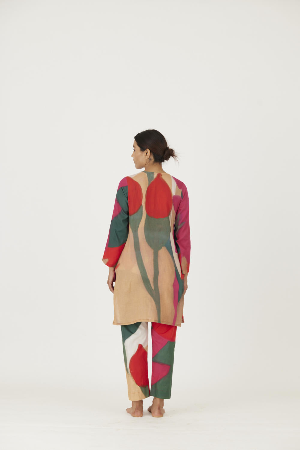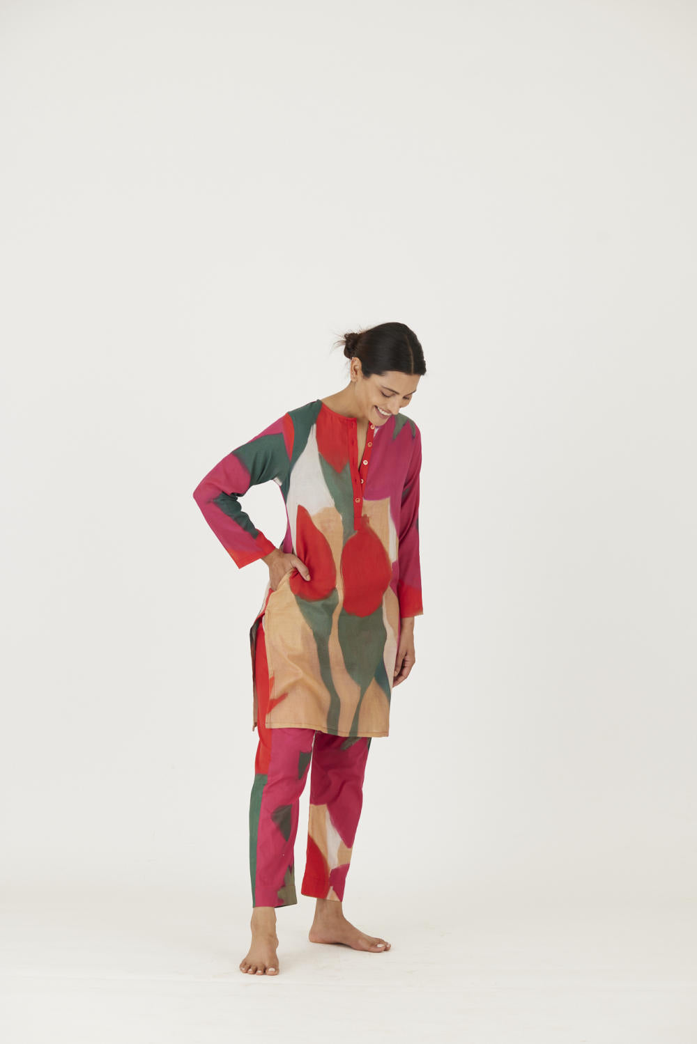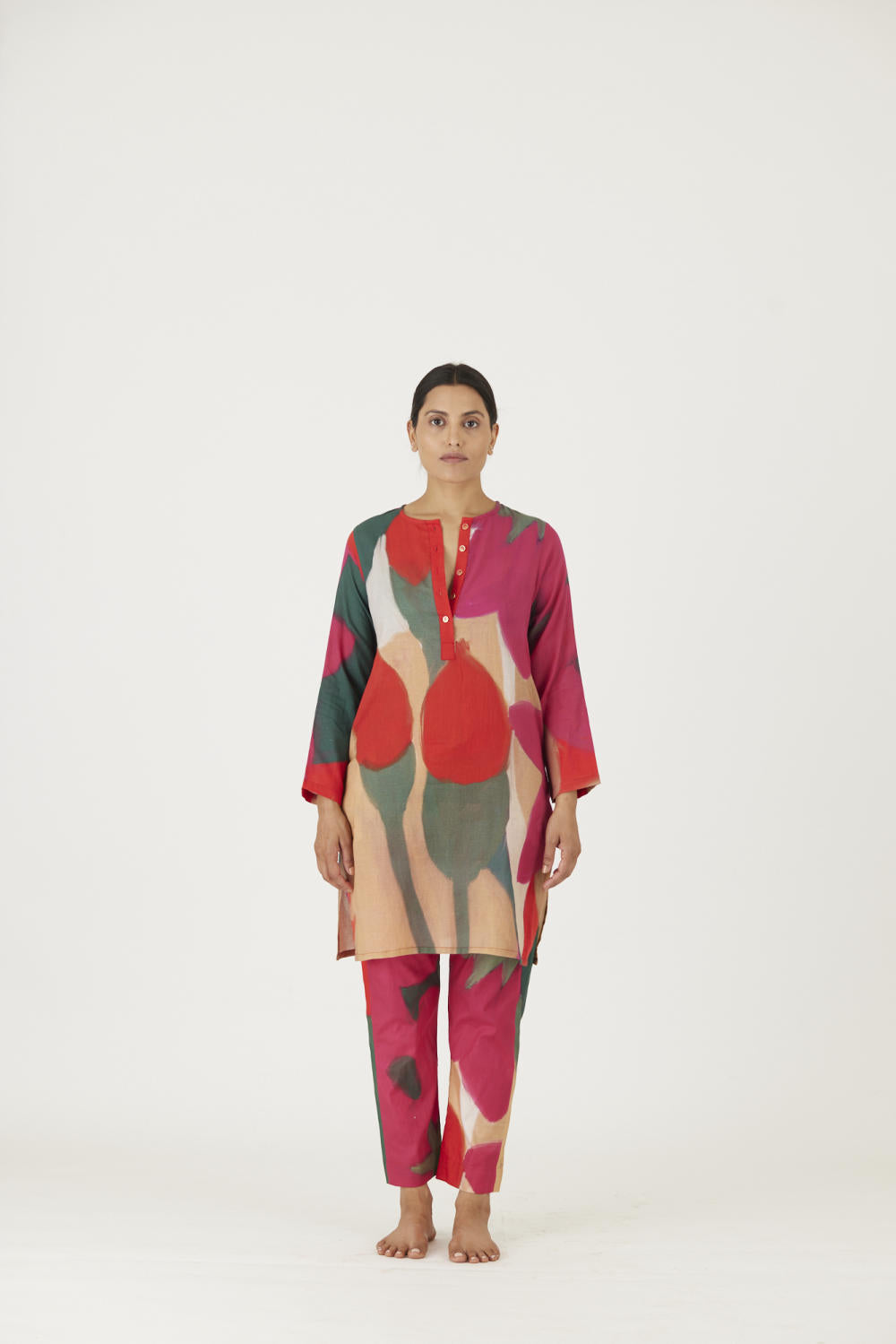 The print is inspired by a rosebud and features a bouquet of flowers and buds in a unique arrangement. The kurta features a 2" kurta patti and threadwork on the neckline. The kurta is crafted in cotton twill and comes with complimenting pants.