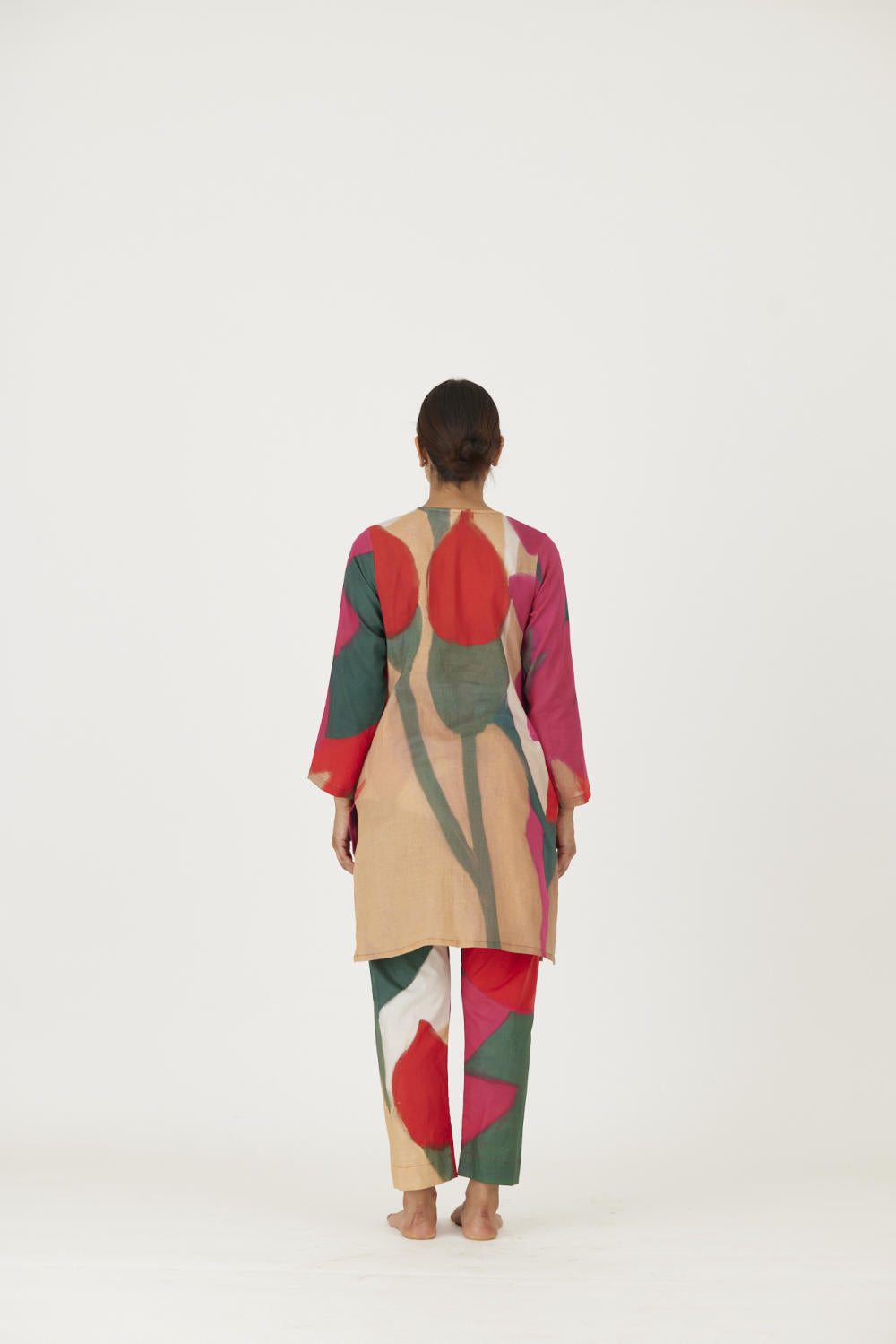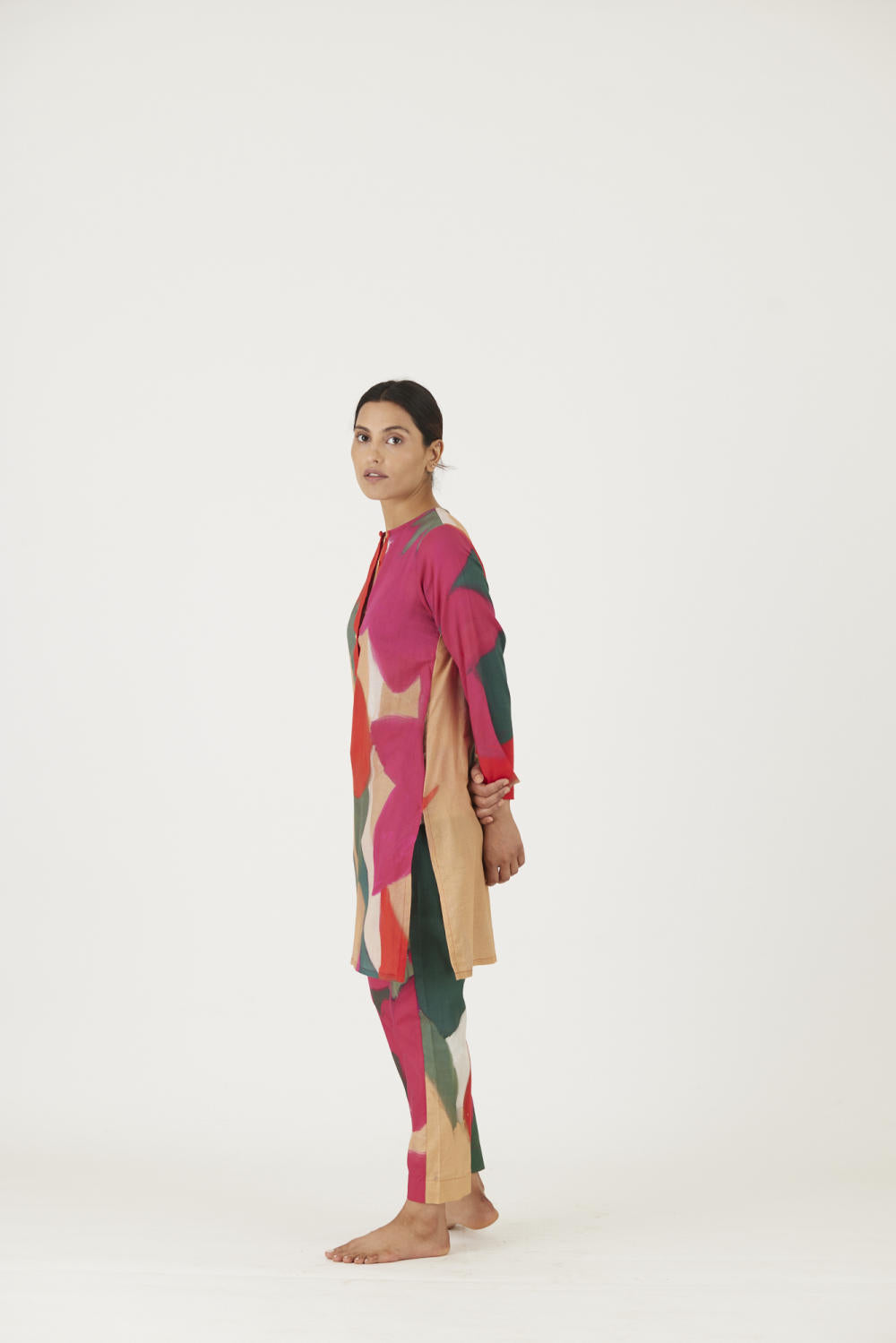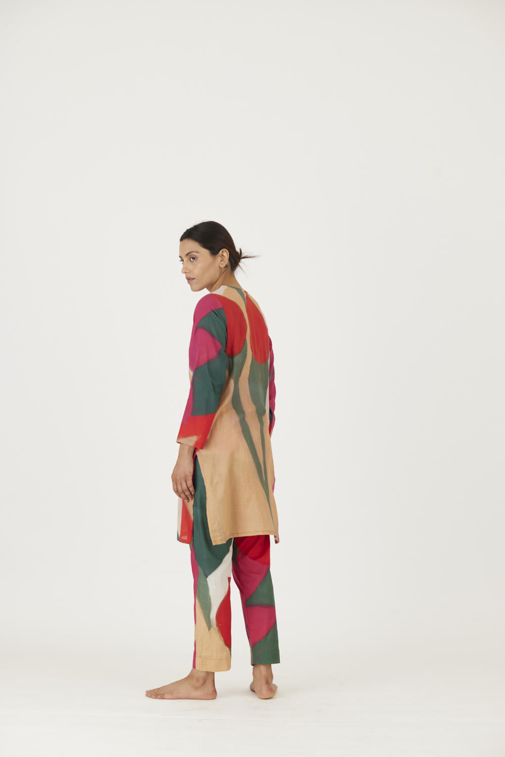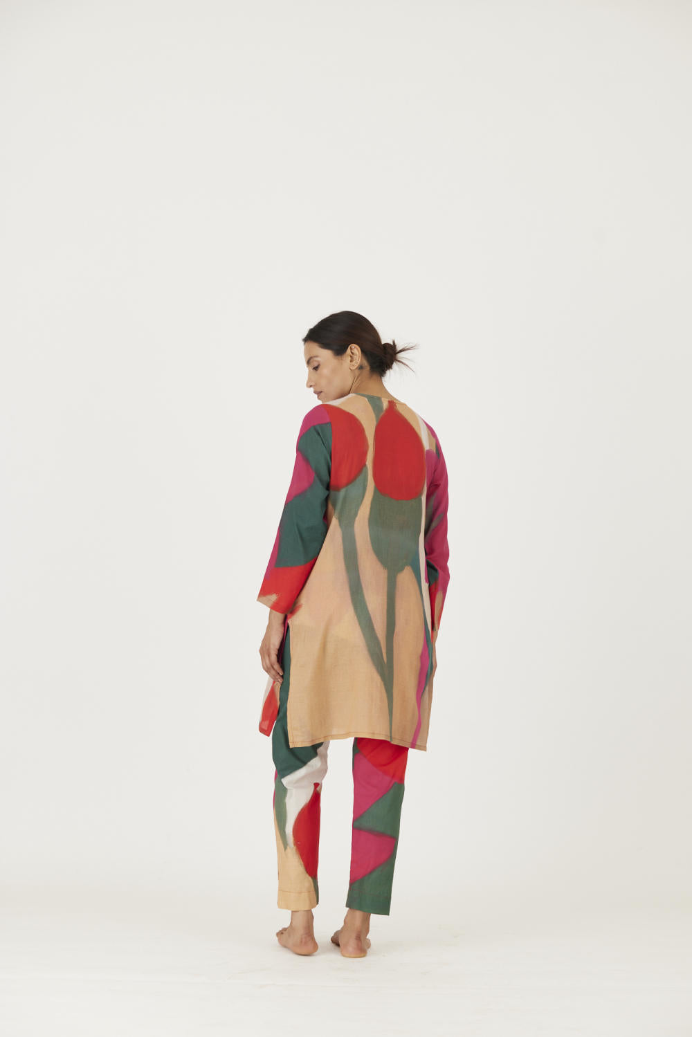 The print is inspired by a rosebud and features a bouquet of flowers and buds in a unique arrangement. The kurta features a 2" kurta patti and threadwork on the neckline. The kurta is crafted in cotton twill and comes with complimenting pants.