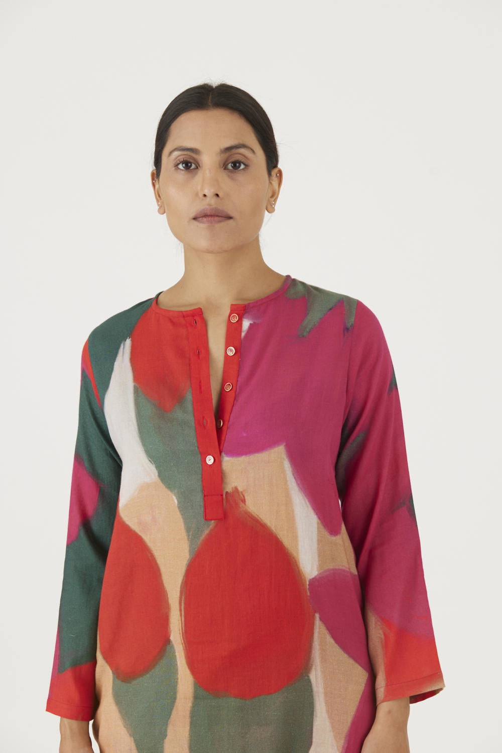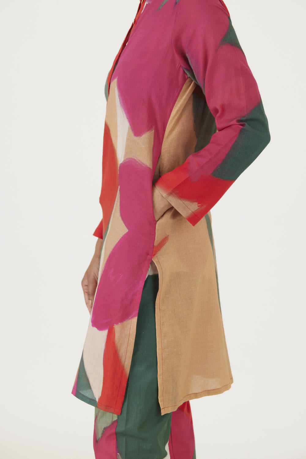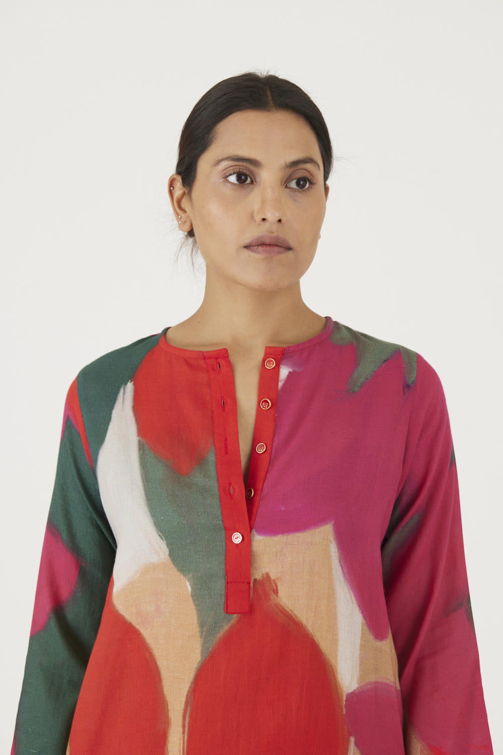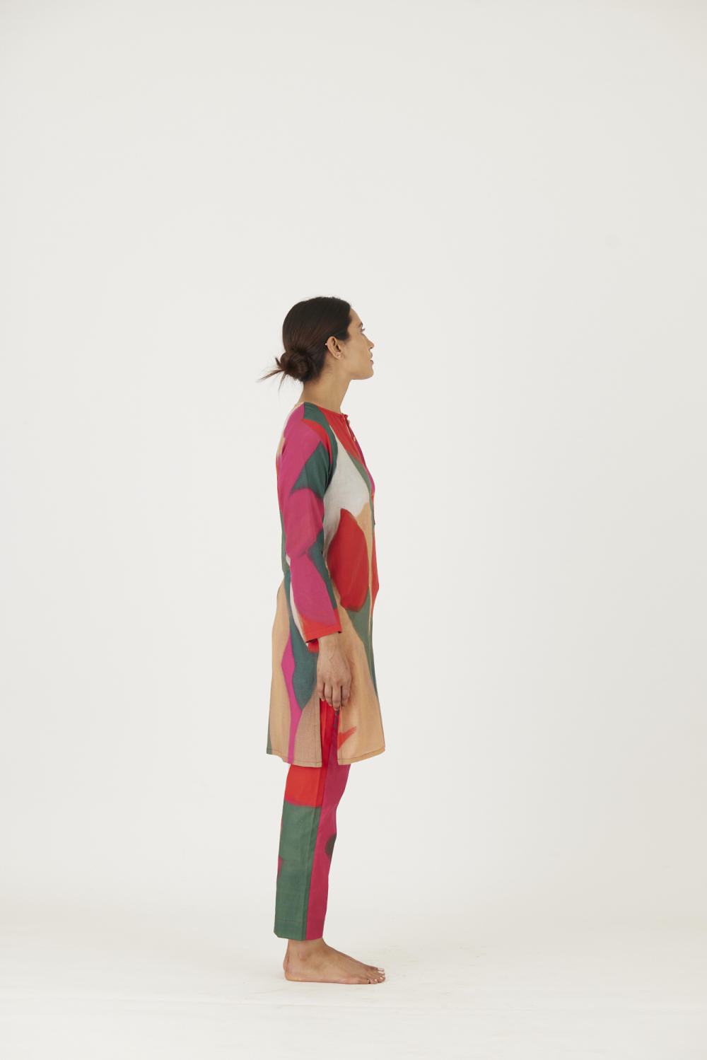 The print is inspired by a rosebud and features a bouquet of flowers and buds in a unique arrangement. The kurta features a 2" kurta patti and threadwork on the neckline. The kurta is crafted in cotton twill and comes with complimenting pants.
